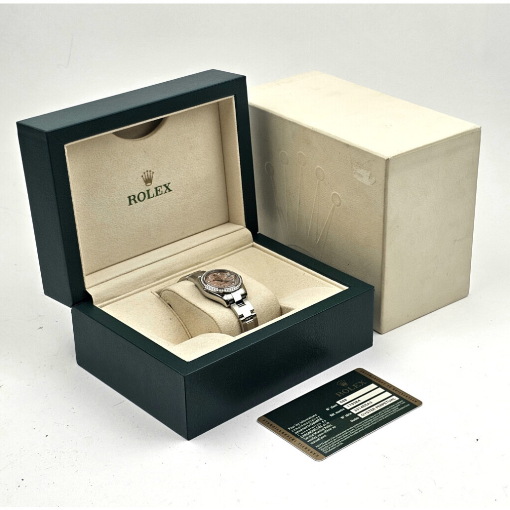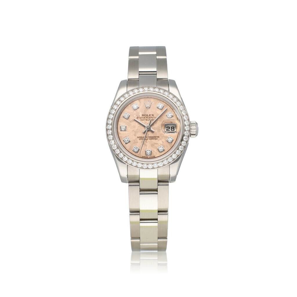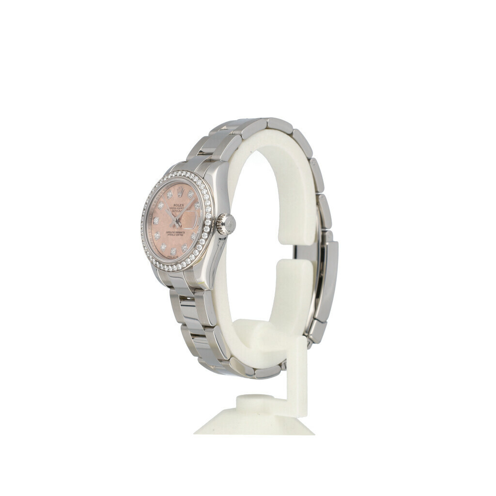 In very good condition Rolex Lady-Datejust 26 in steel with original factory diamond white gold bezel, rare factory pink so called 'gold crystal' dial and steel Oyster bracelet from 2012 complete with box and papers.