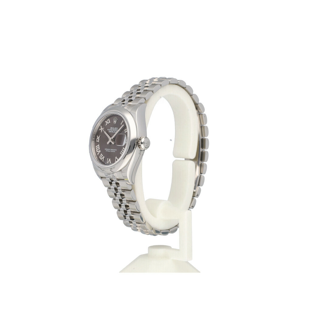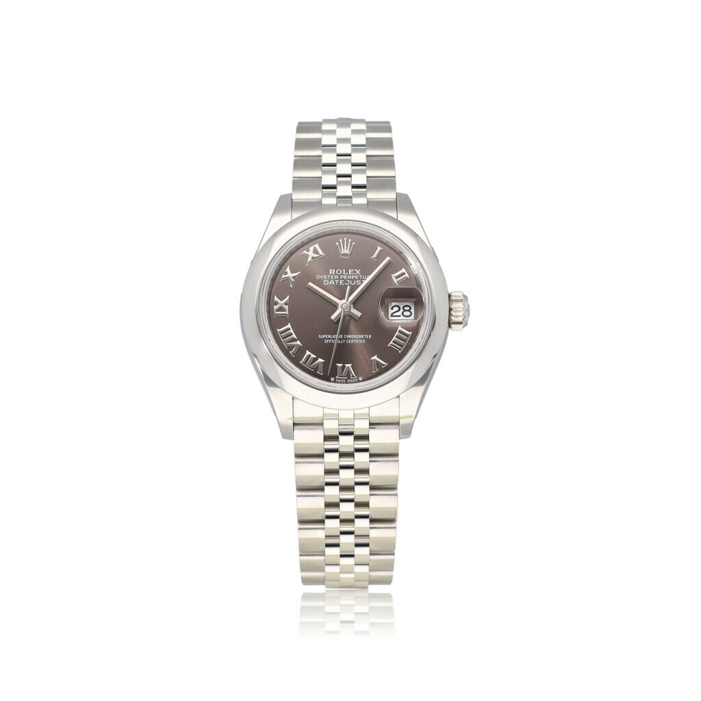 In very good condition Rolex Lady Datejust 28 mm in steel with dark grey / brown roman dial, steel domed bezel and steel Jubilee bracelet from 2024 complete with box and papers