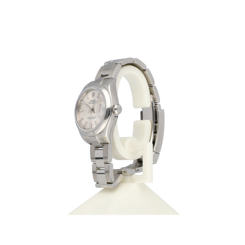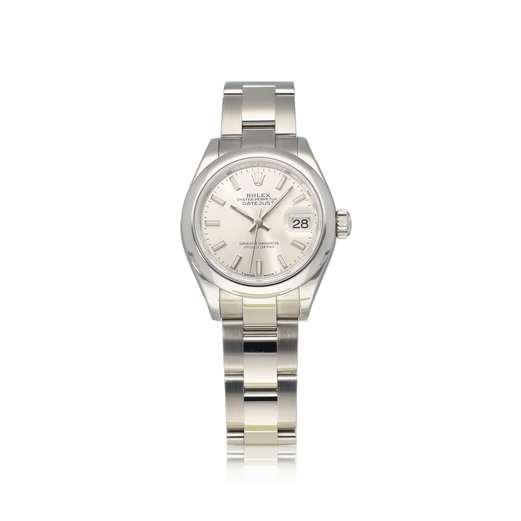 In very good condition Rolex Lady-Datejust in steel with silver dial and, steel domed bezel and steel Oyster bracelet from 2018 complete with box and papers. Rolex serviced 10-2025 and not worn since. Rolex service certificate included.