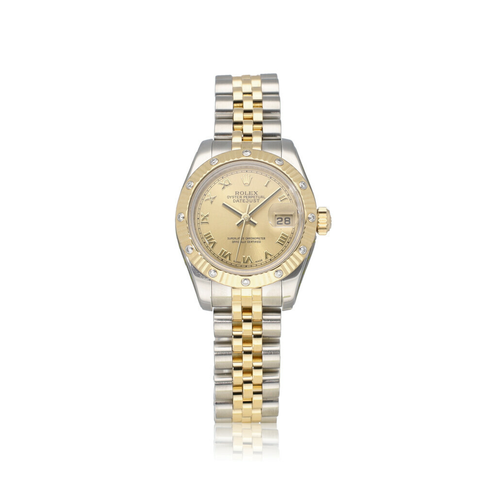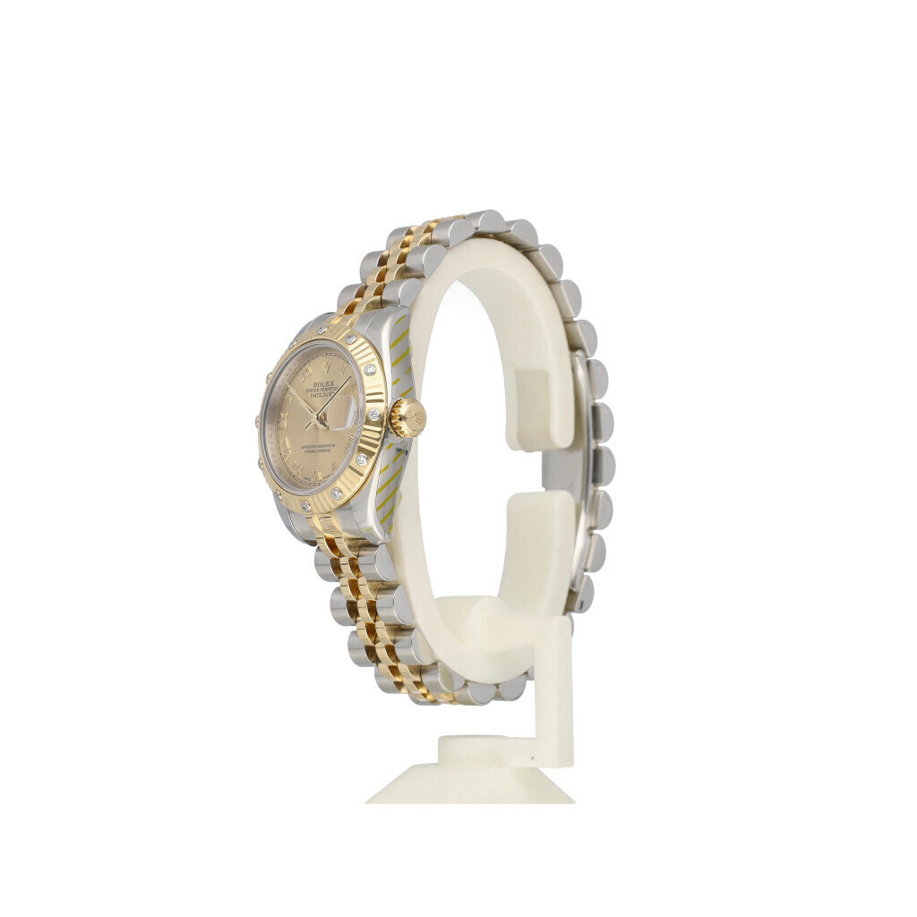 In very good condition Rolex Datejust 26mm in steel - yellow gold with factory diamond set bezel and champagne roman dial from 2006 complete with papers, no box. Rolex serviced 2-2026 and not worn since. Rolex service certificate included.