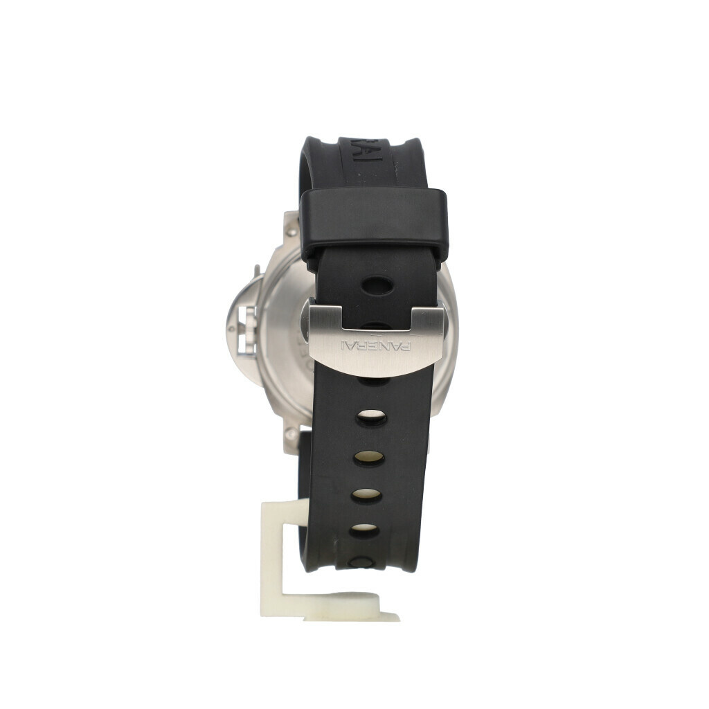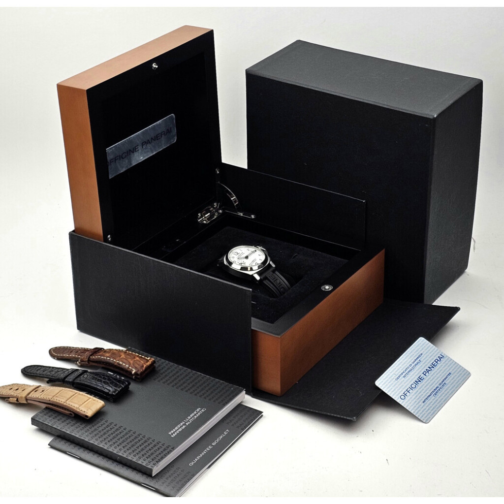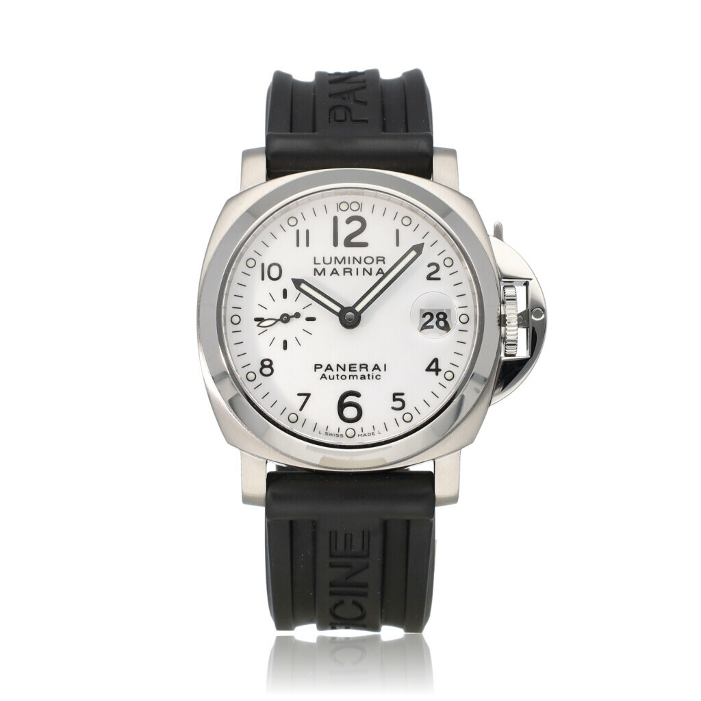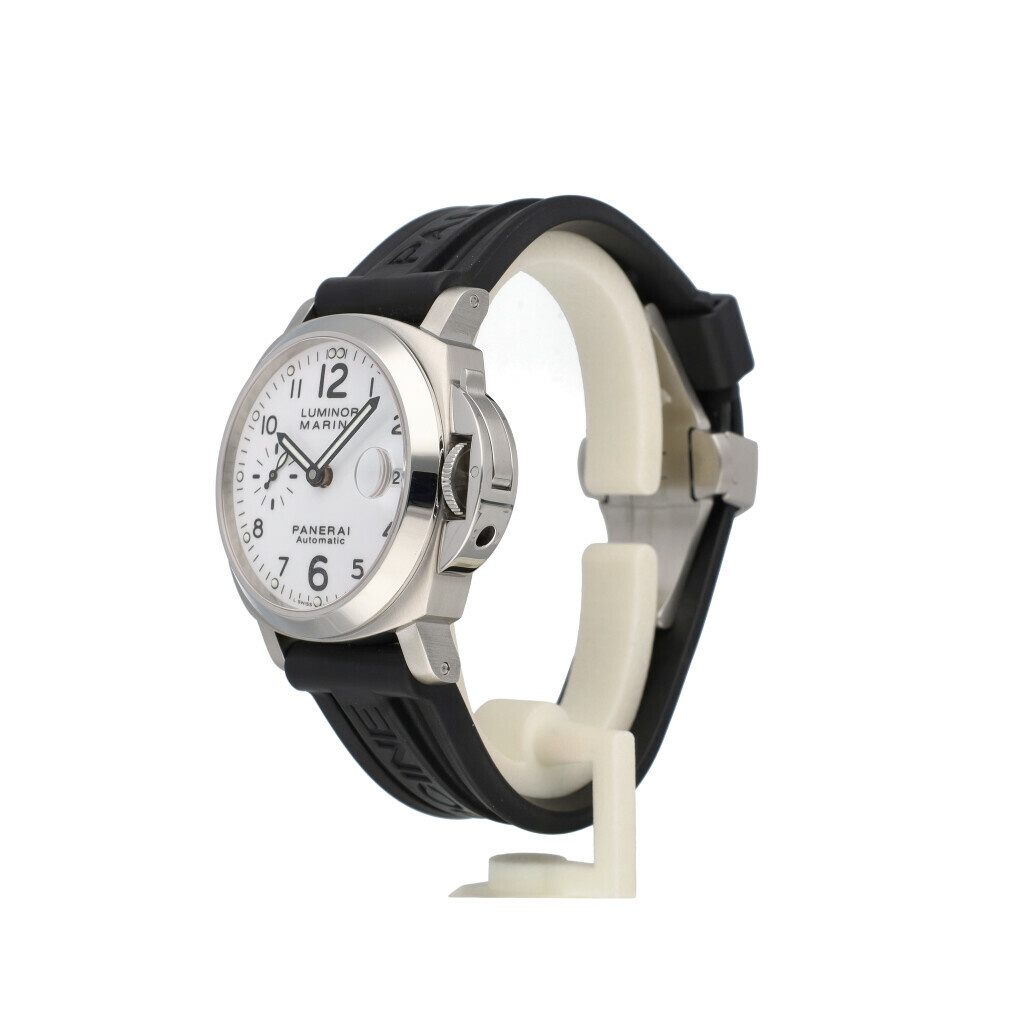 In very good condition Panerai Luminor Marina Automatic in steel with a white dial and rubber strap from 2008 complete with box and papers.