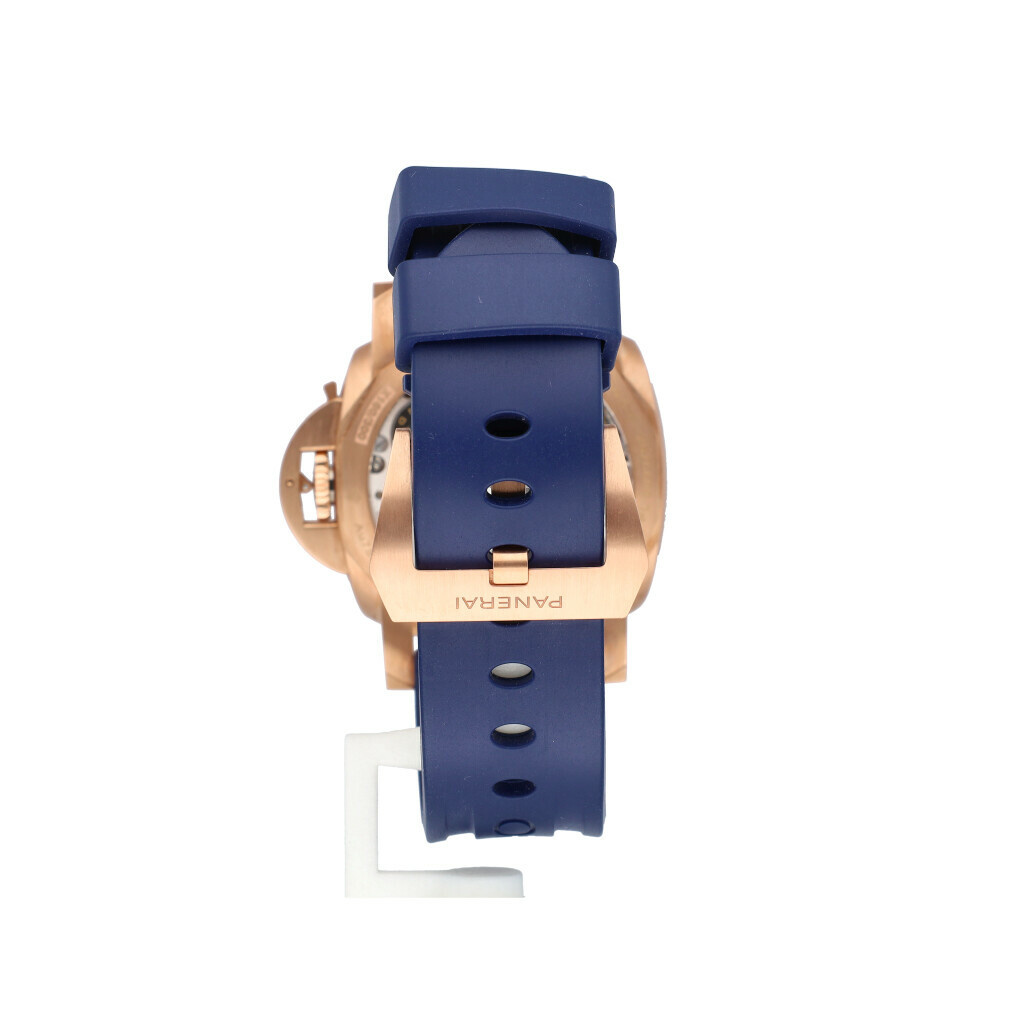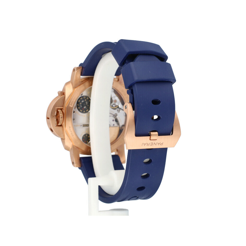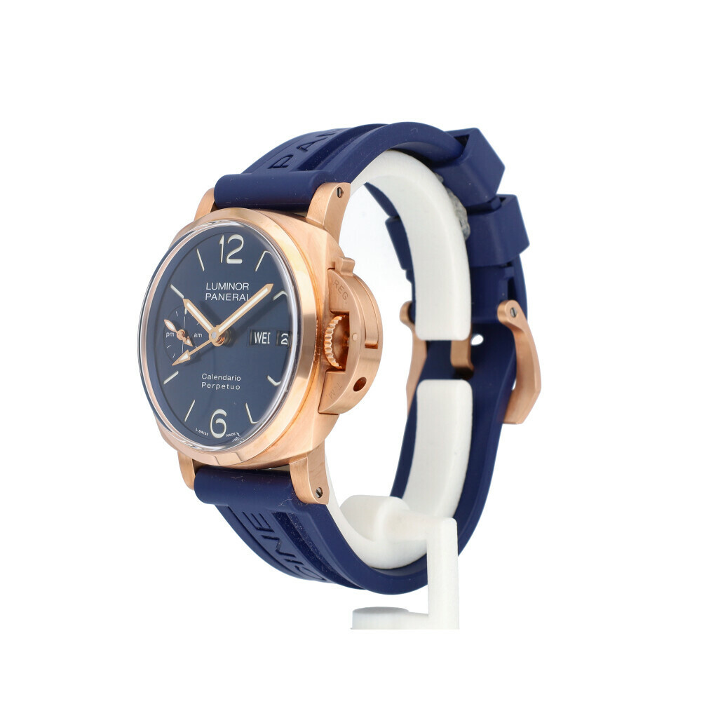 In very good condition, unpolished Panerai Luminor Perpetual Calendar in rose gold with blue dial from 2023 complete with box and papers. Comes with extra orange and white Panerai strap. Limited on 300 pieves worldwide.