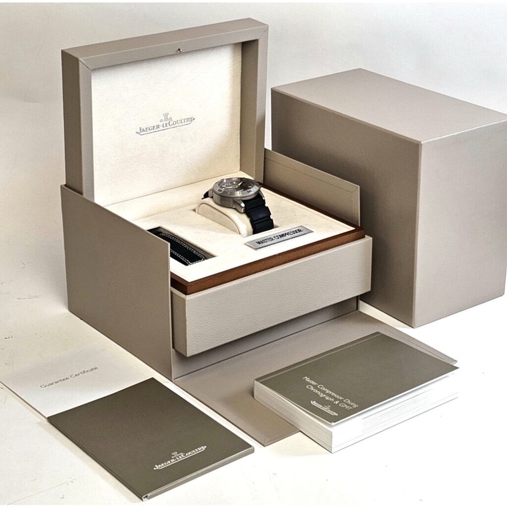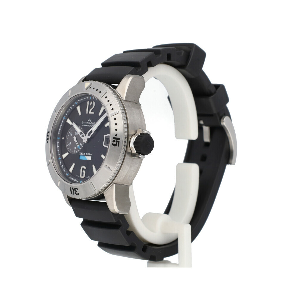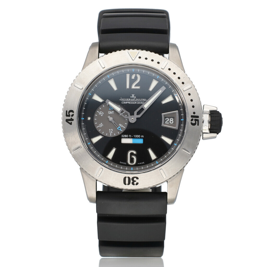 In very good condition Jaeger-LeCoultre Master Compressor Diving GMT in titanium with rubber and textile strap complete with box and papers. No date filled in on certificate. JLC serviced 12-2024 and not worn since. JLC service papers included.