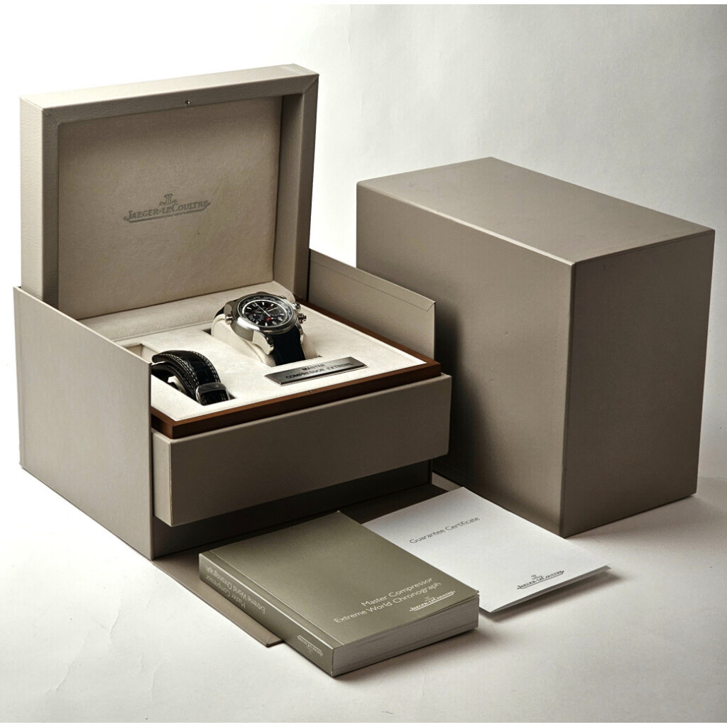 In very good condition Jaeger-LeCoultre Master Compressor Extreme World Chronograph from 2009 complete with box and papers. JLC serviced 1-2025 and not worn since. JLC service papers included.