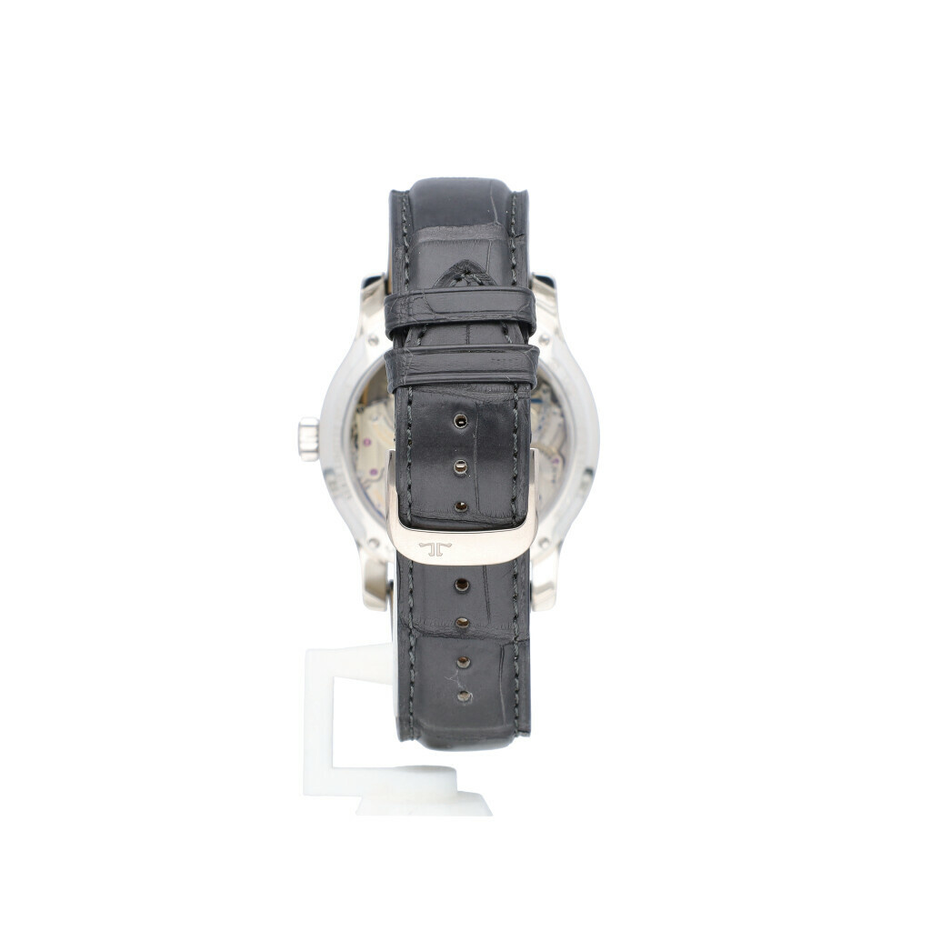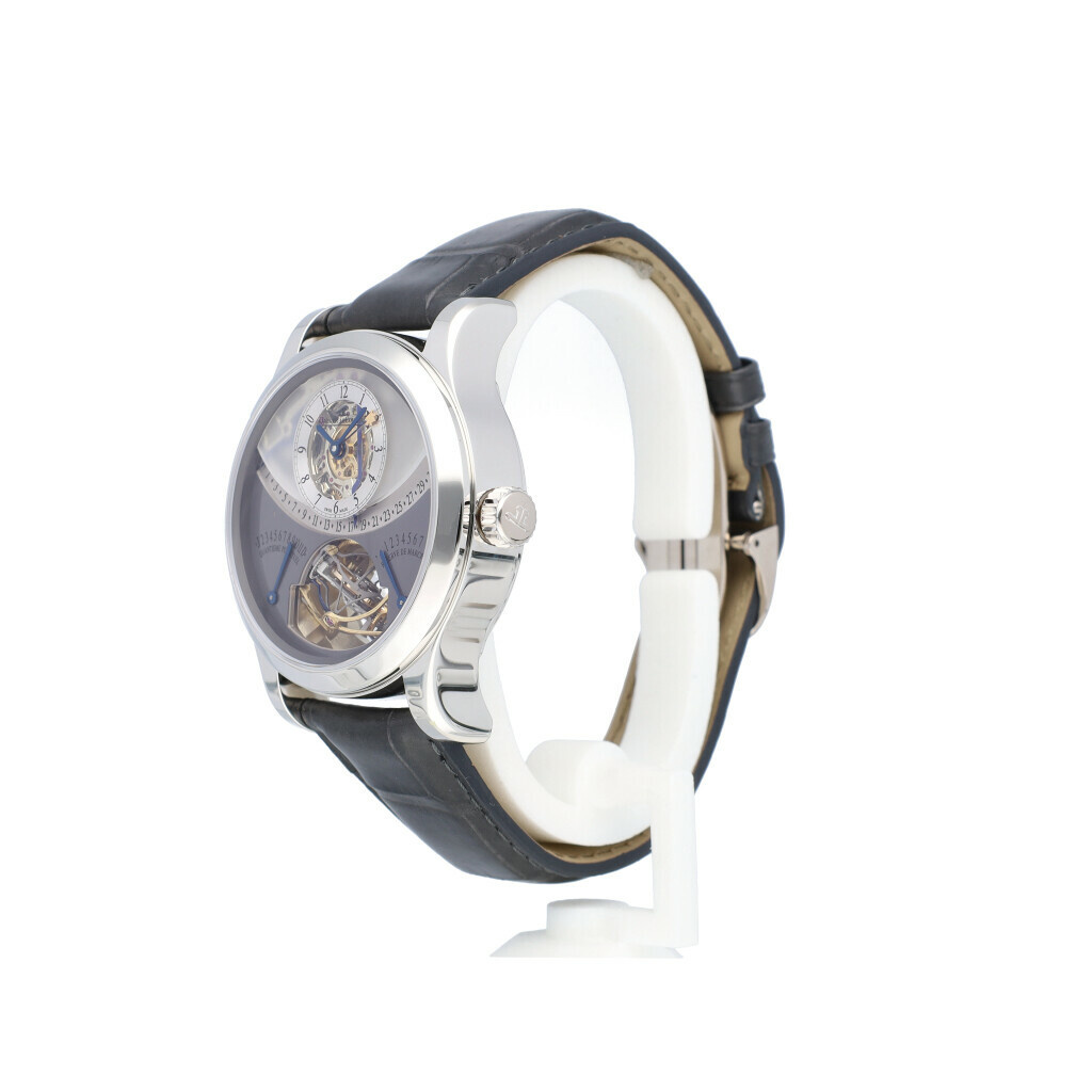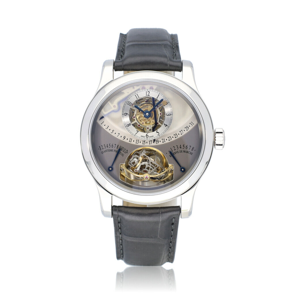 In very good condition Jaeger-LeCoultre Gyro Tourbillon 1 in platinum with semi-skeleton dial complete with box and papers. Limited edition of 75 pieces worldwide. JLC serviced 9-2024 including new strap and not worn since.