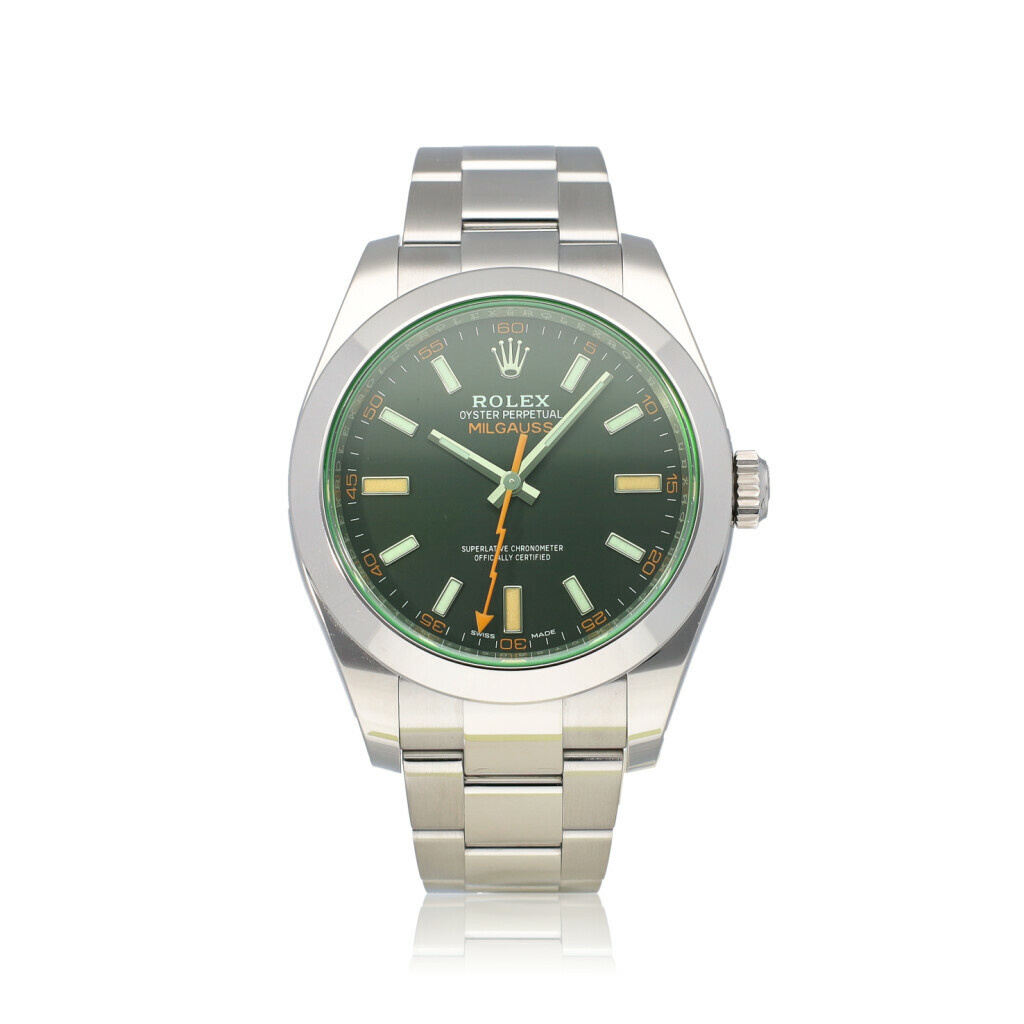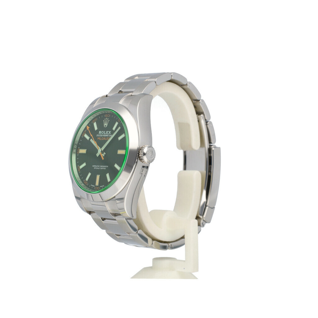 In very good condition Rolex Milgauss in steel with black dial, green glass and steel Oyster bracelet from 2023 complete with box and papers.