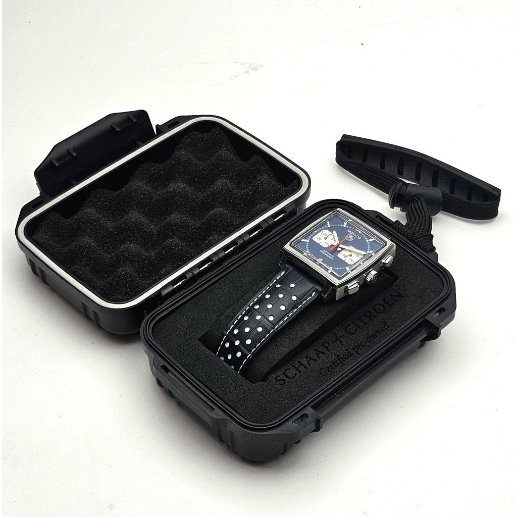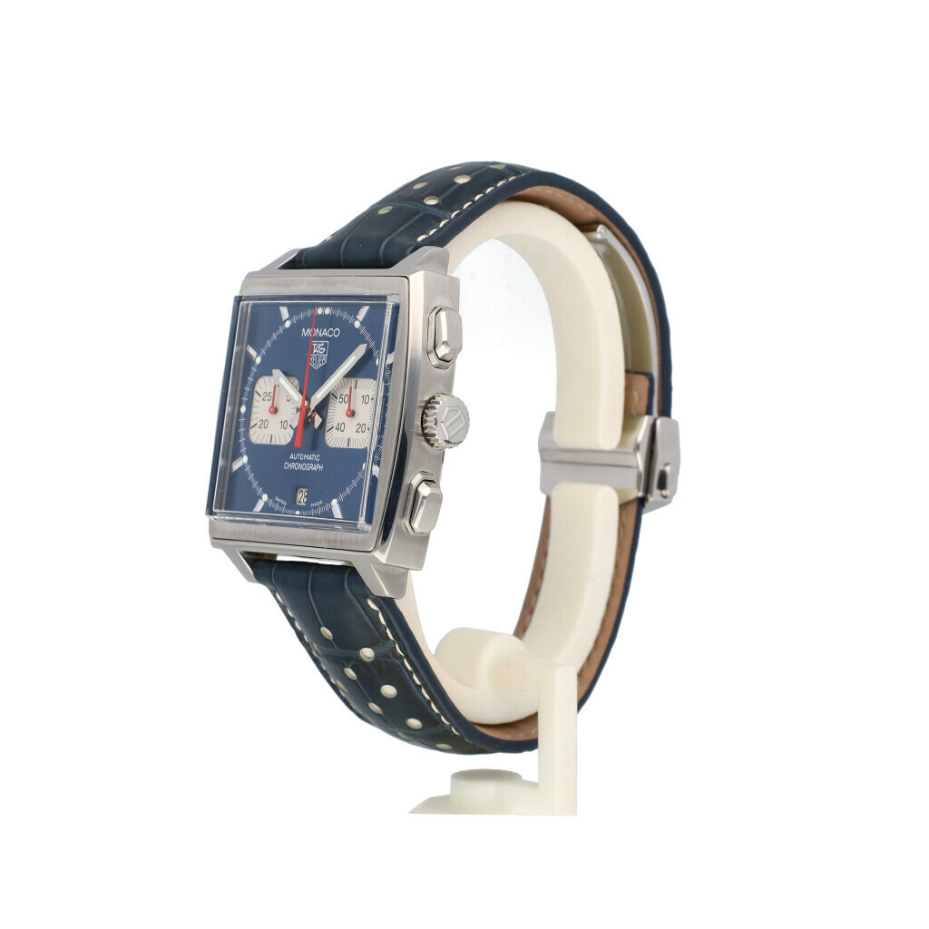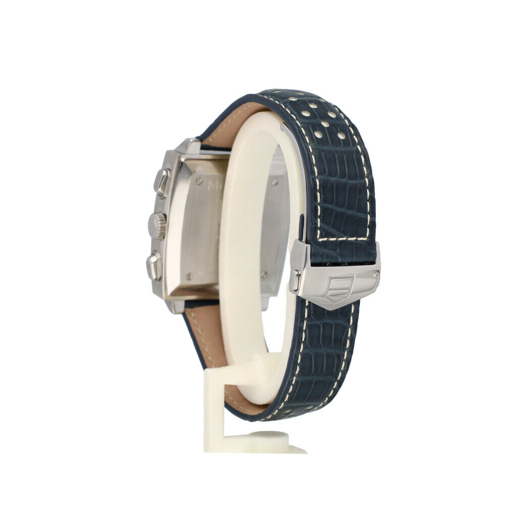 In very good condition Tag Heuer Monaco in steel with blue dial and brand new TAG Heuer alligator leather strap. No box and/or papers.
