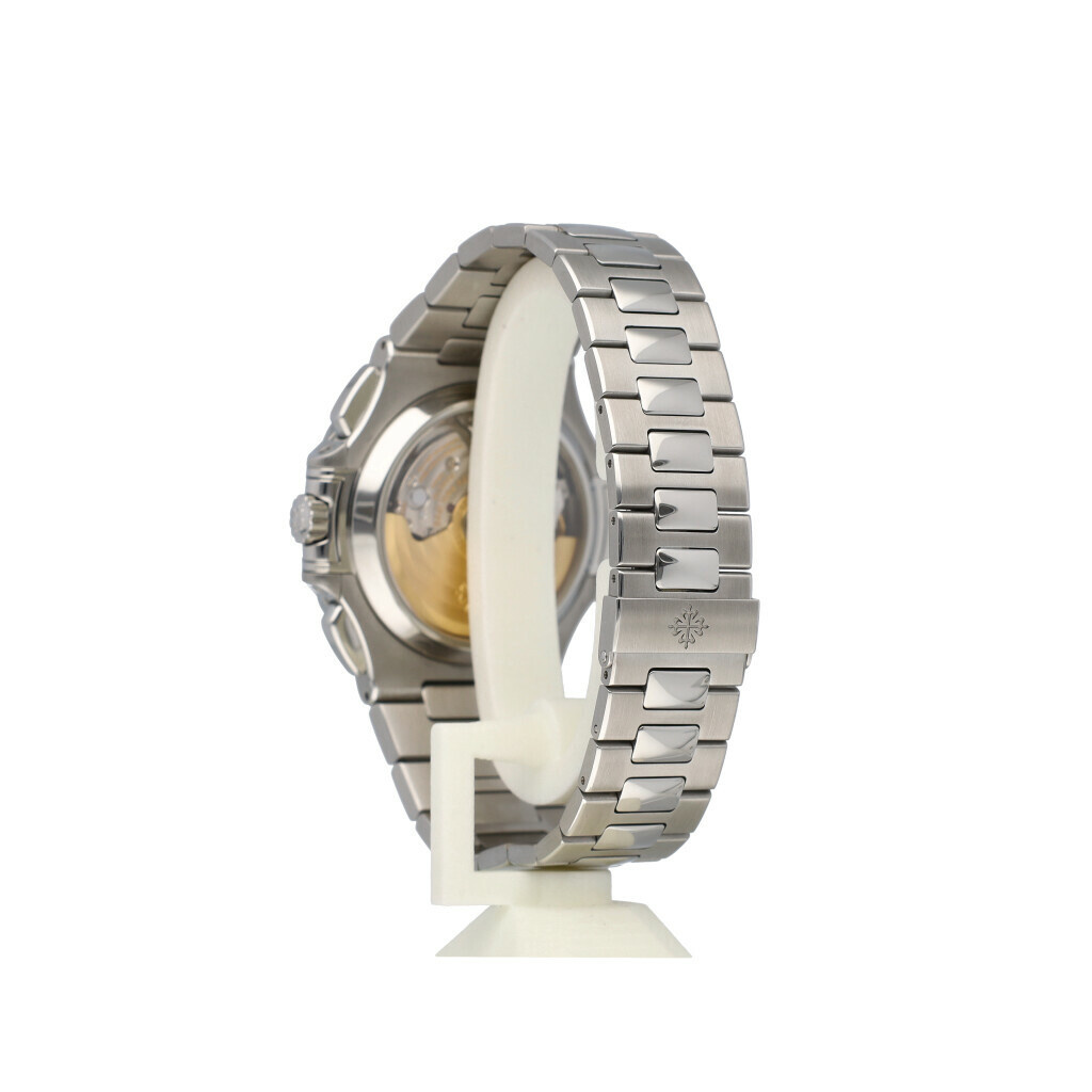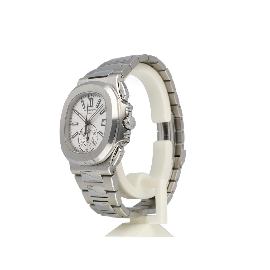 In very good condition Patek Philippe Nautilus Chronograph in steel with discontinued white dial, steel bezel and steel bracelet. No box and/or papers. Extract from the Archives requested at Patek Philippe.