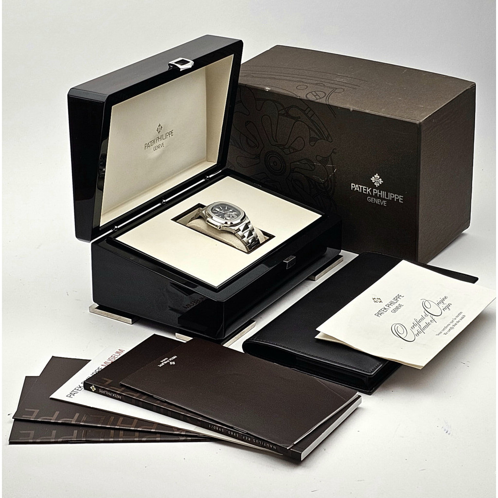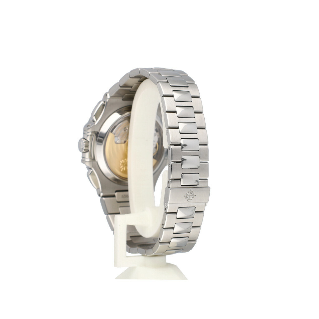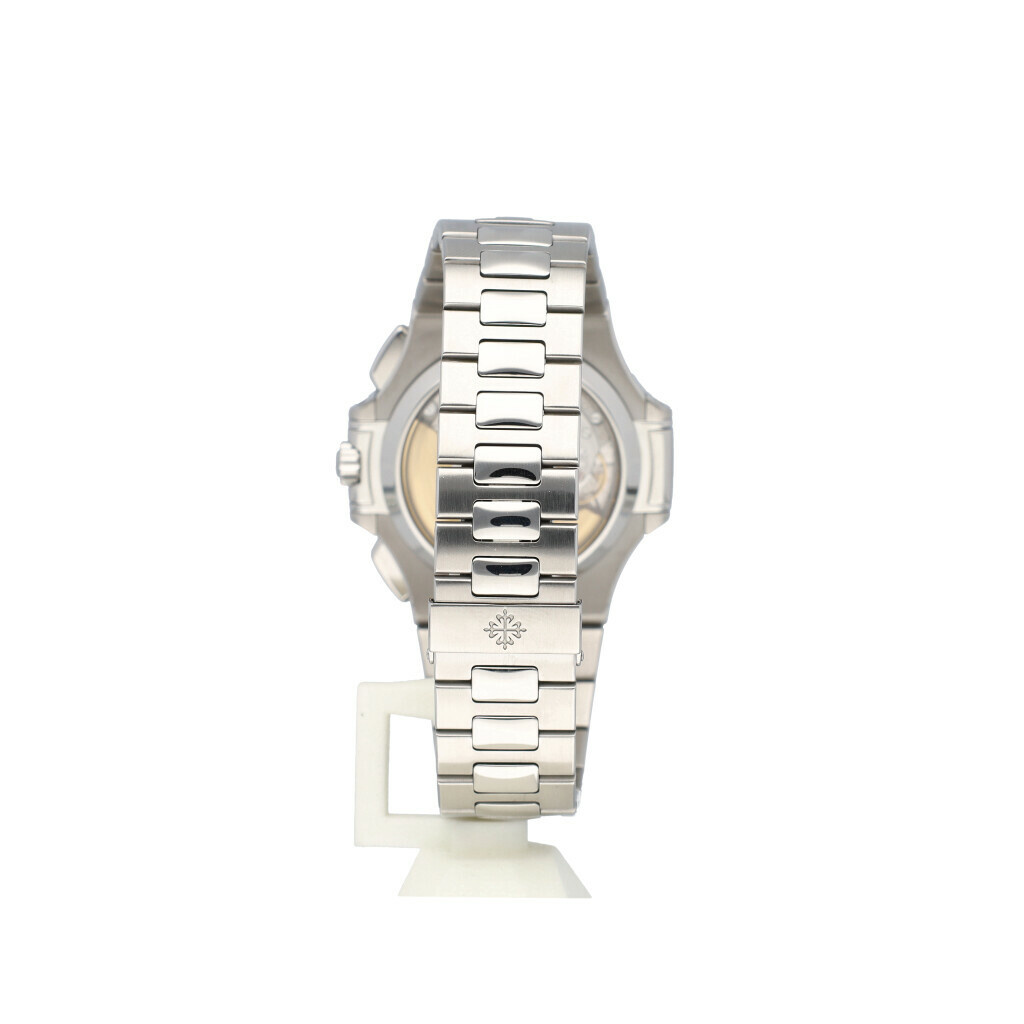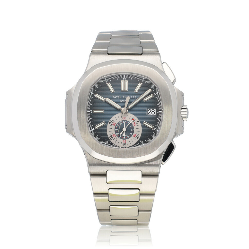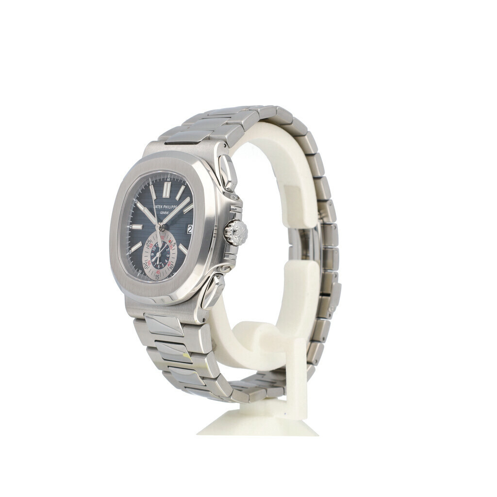 In very good condition Patek Philippe Nautilus Chronograph in steel with blue/grey dial and steel bracelet from 2013 complete box and papers.
