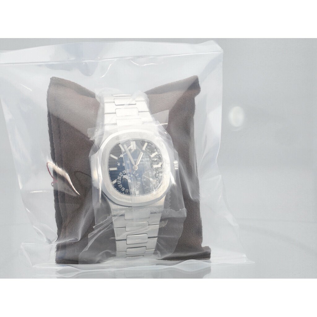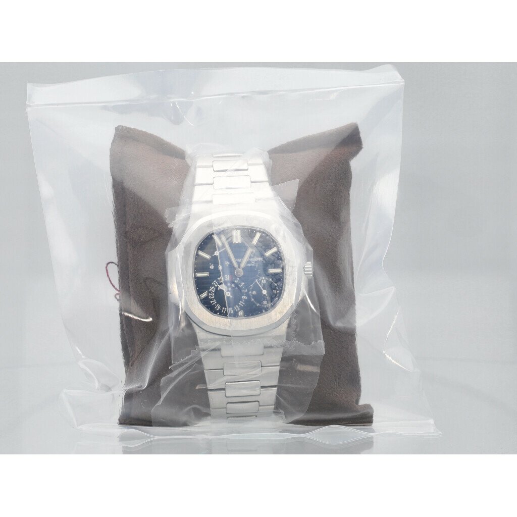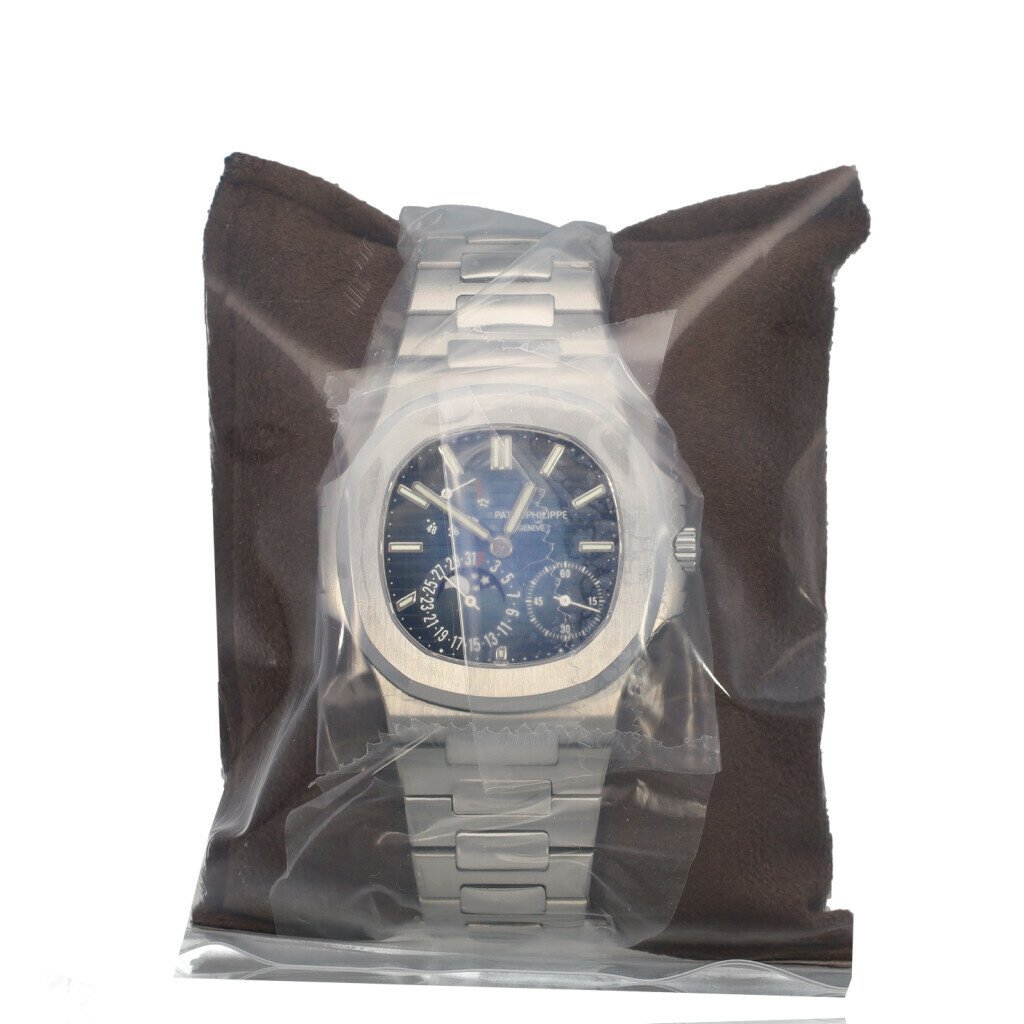 In very good condition Patek Philippe Nautilus Moonphase Power Reserve in steel with blue dial and steel bracelet from 2016 complete with box and papers. Model is discontinued. Patek Philippe serviced 11-2025 and not worn since - still in service seal.