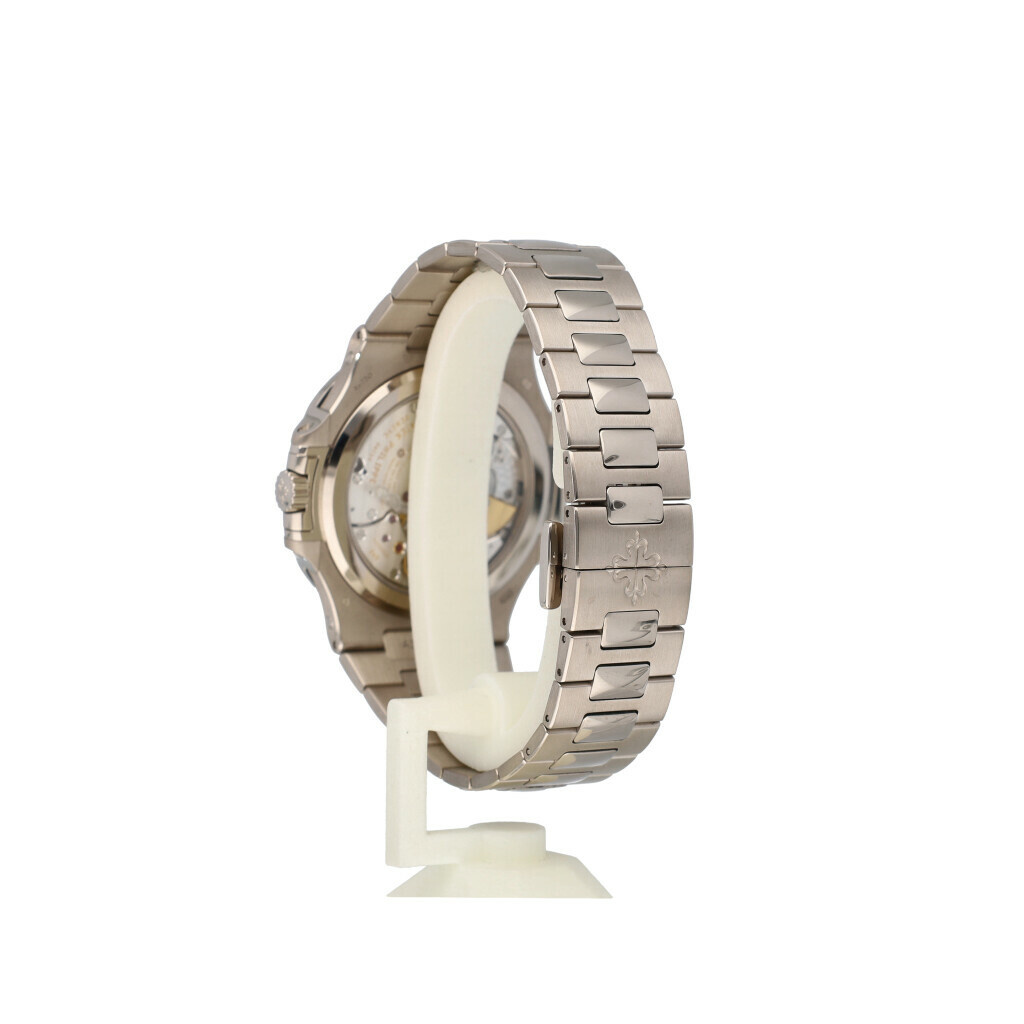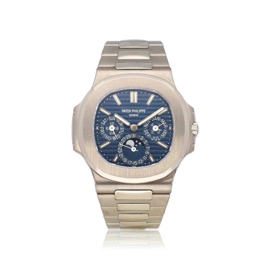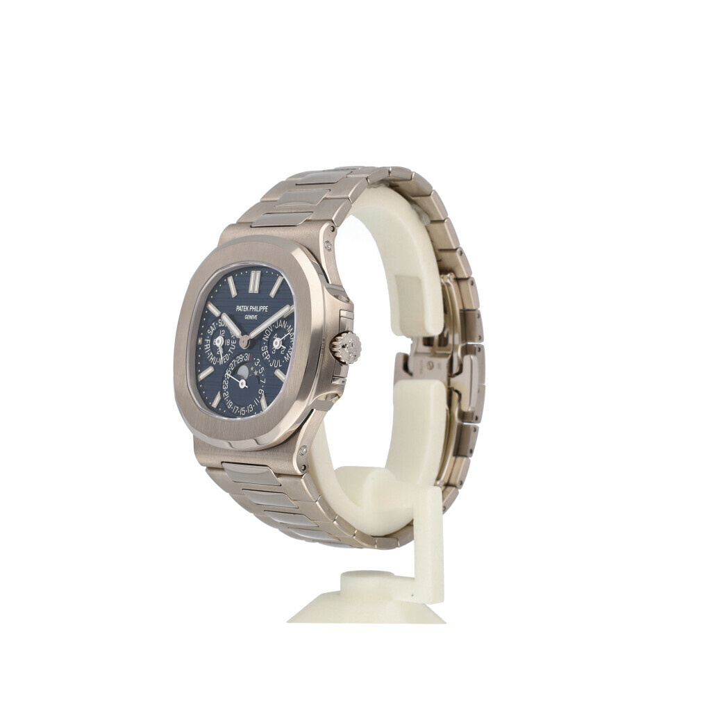 In very good condition Patek Philippe Nautilus Perpetual Calendar in white gold with blue dial and white gold bracelet from 2019 complete with papers, and Patek Philippe winder - no box.