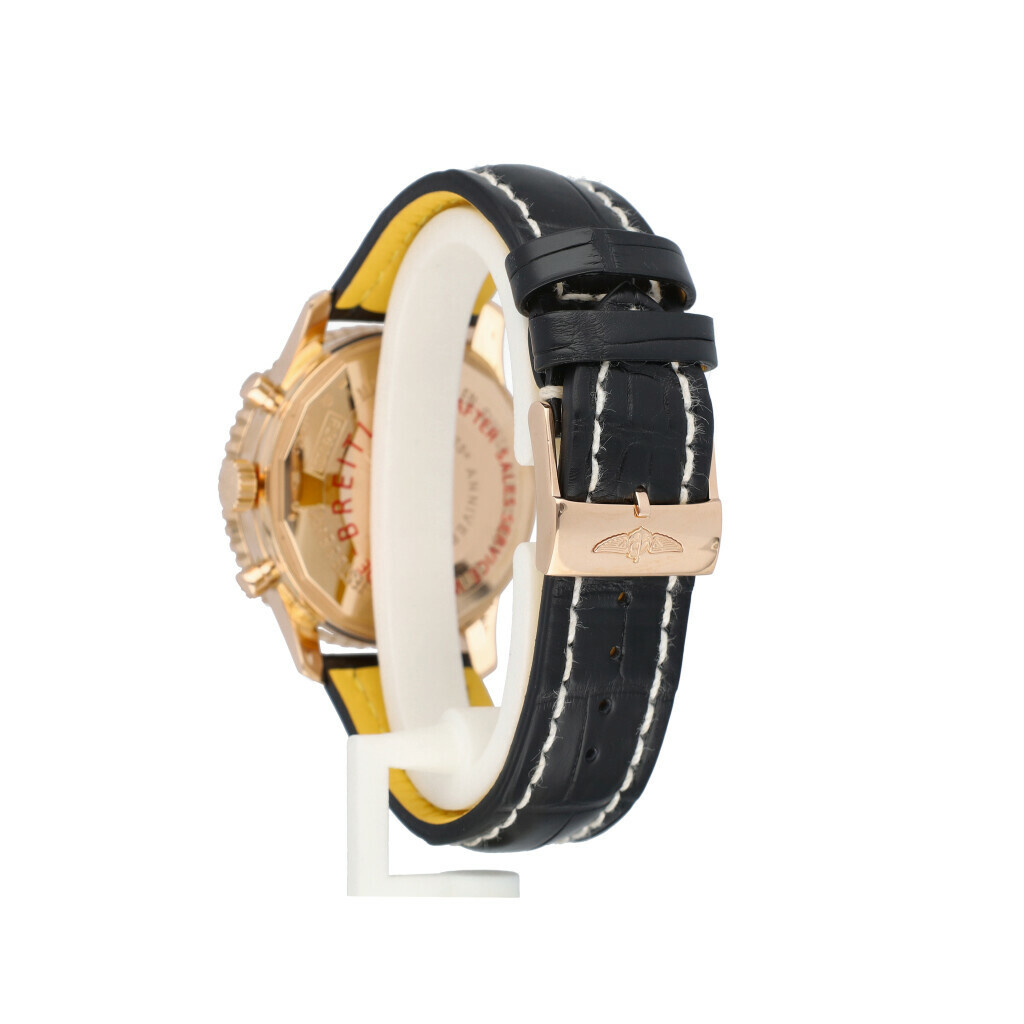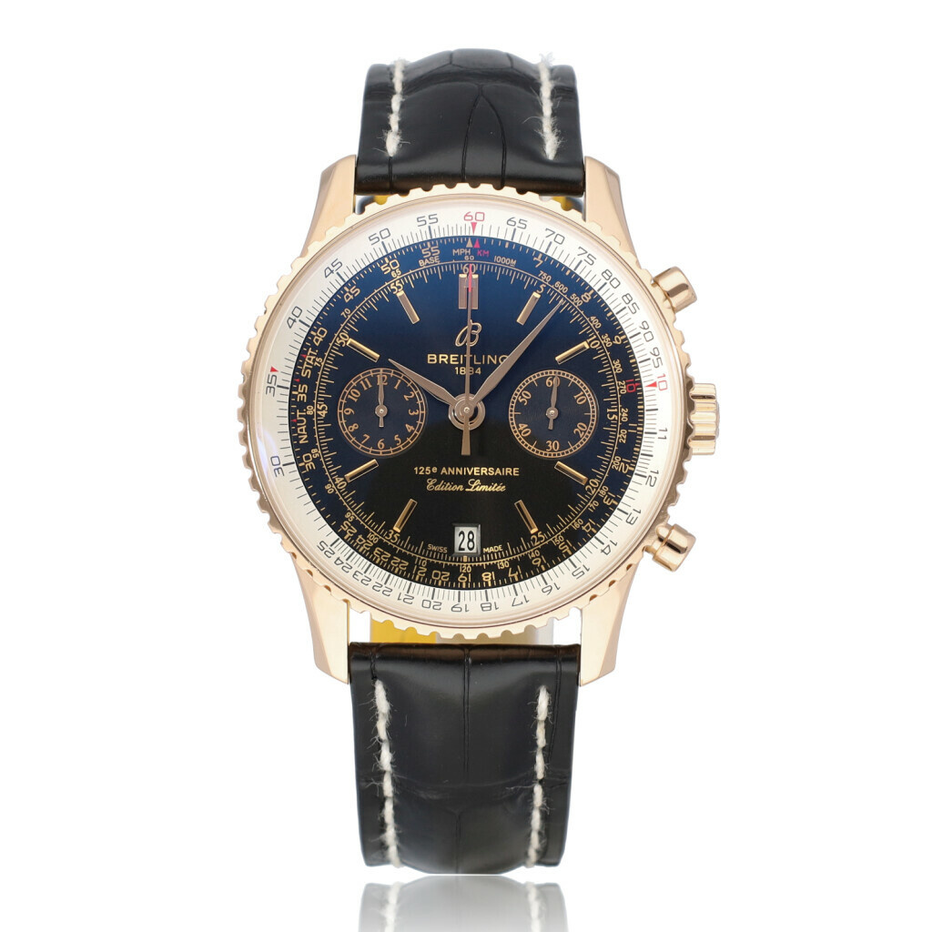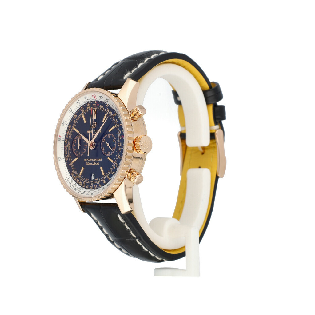 In very good condition Breitling Navitimer 125 Years ref. R2632212 in rose gold with black dial from 2019 complete with box and papers. Breitling serviced including new Breitling strap 12-2024 and not worn since. Breitling service papers included.