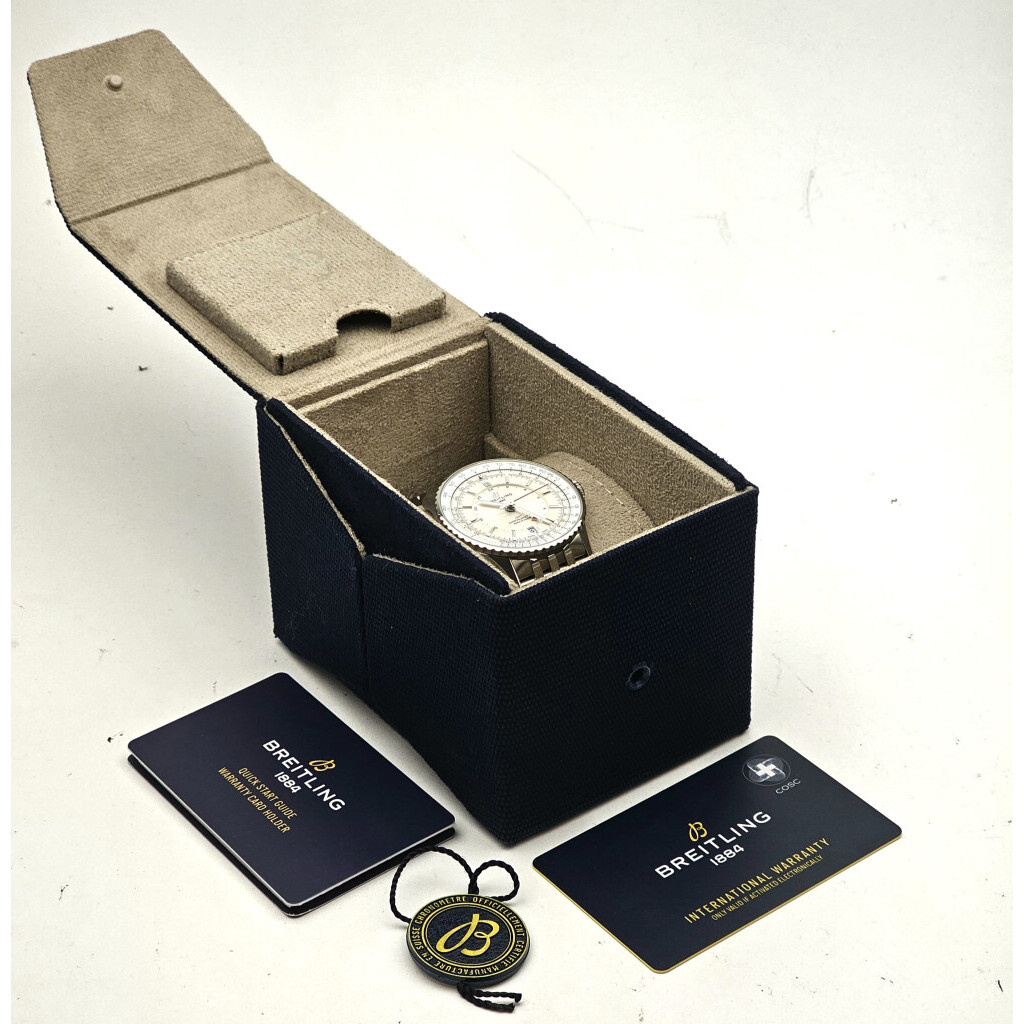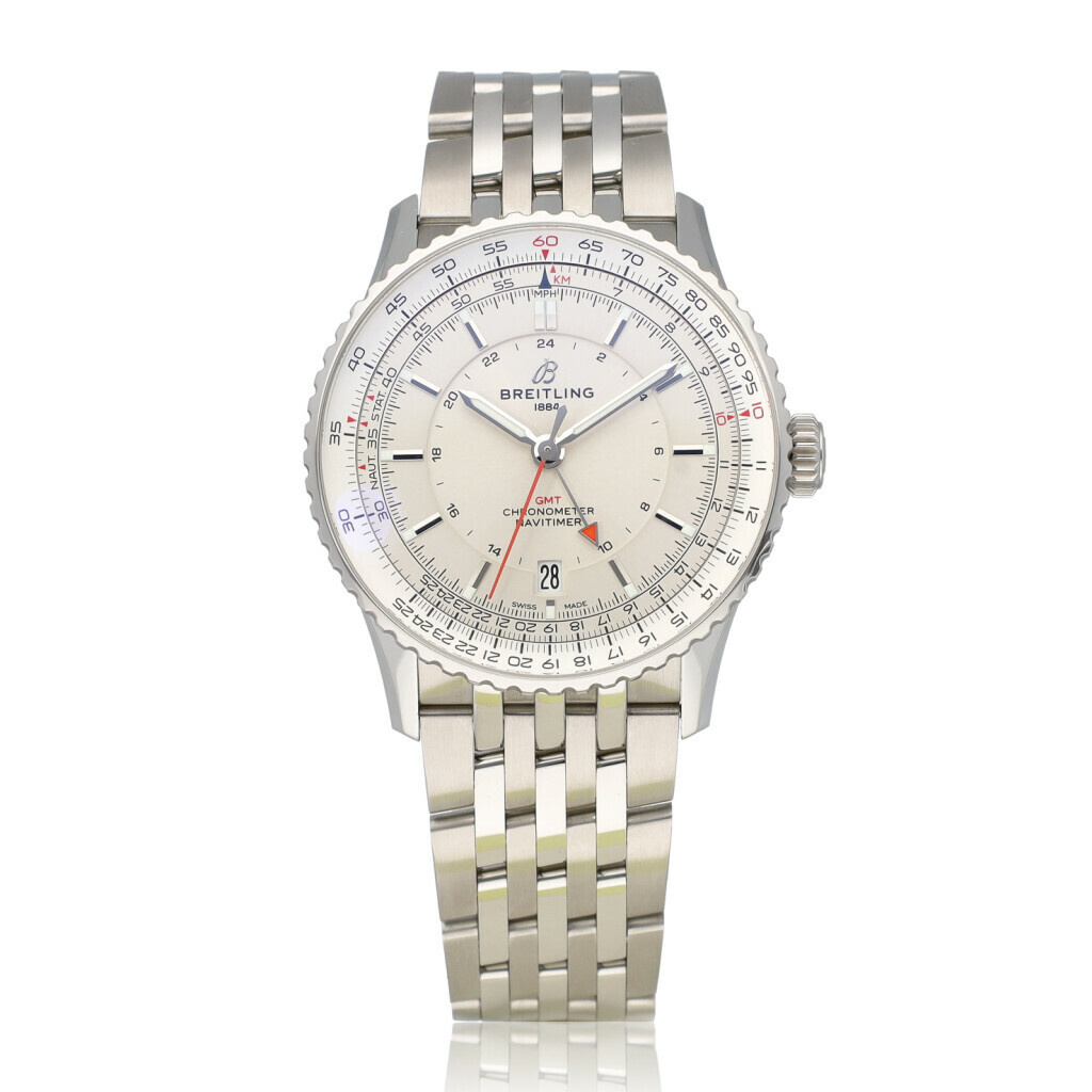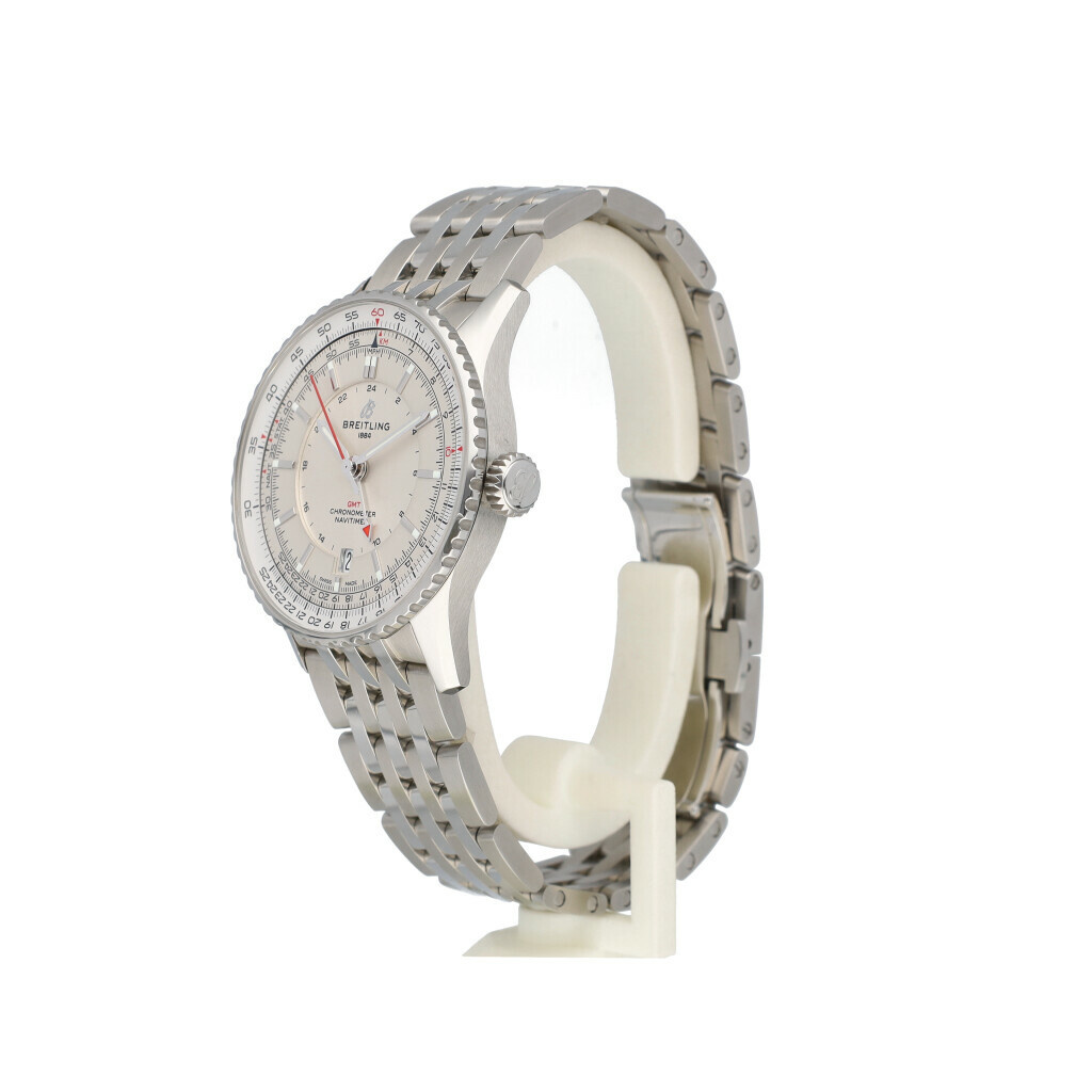 In very good condition Breitling Chronomat GMT in steel with silver dial and steel Breitling bracelet from 2024 complete with box and papers.
