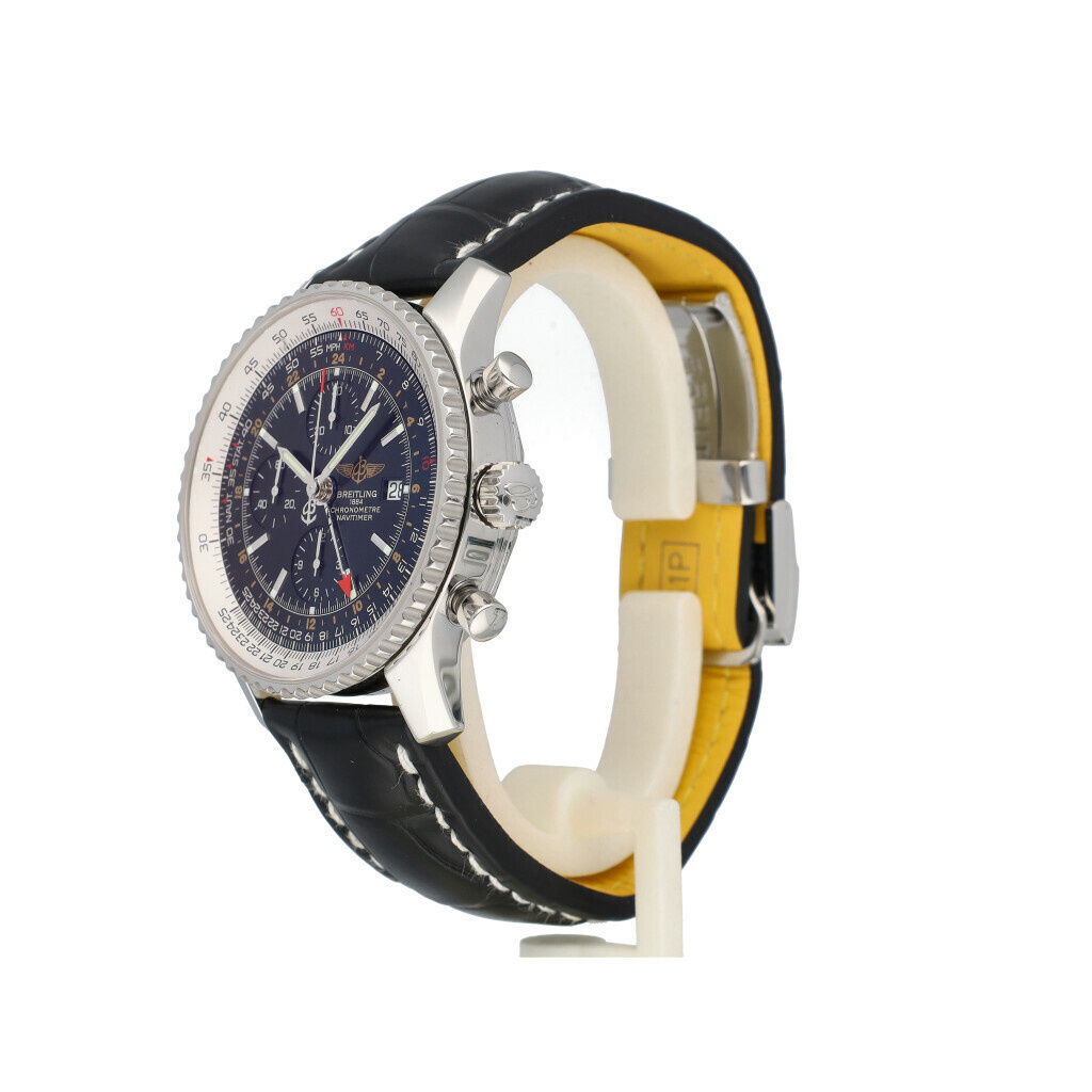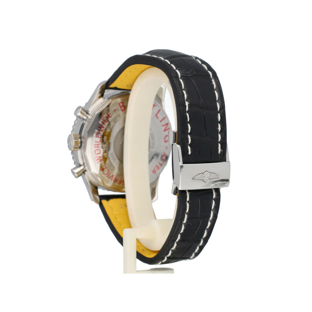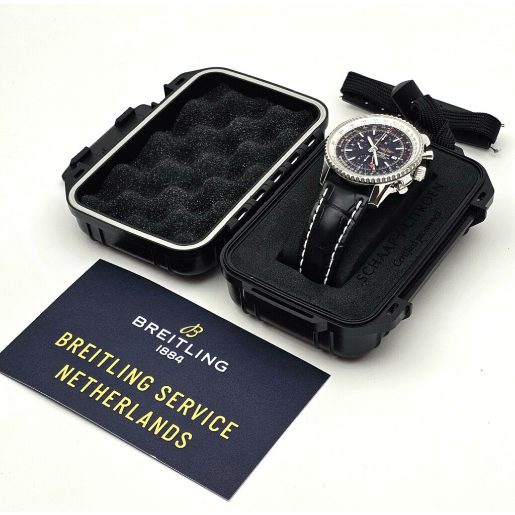 In very good condition Breitling Navitimer world in steel with black dial and brand new black Breitling strap. No box and/or papers. Breitling serviced 12-2025 and not worn since. Breitling service certificate included.