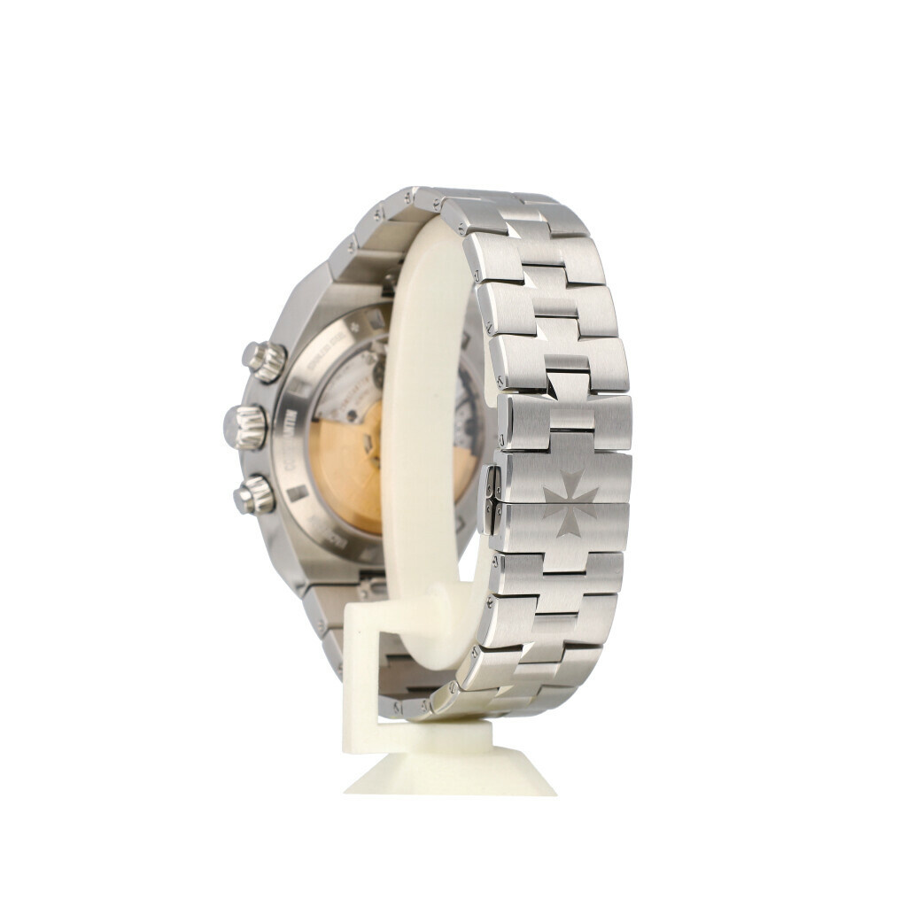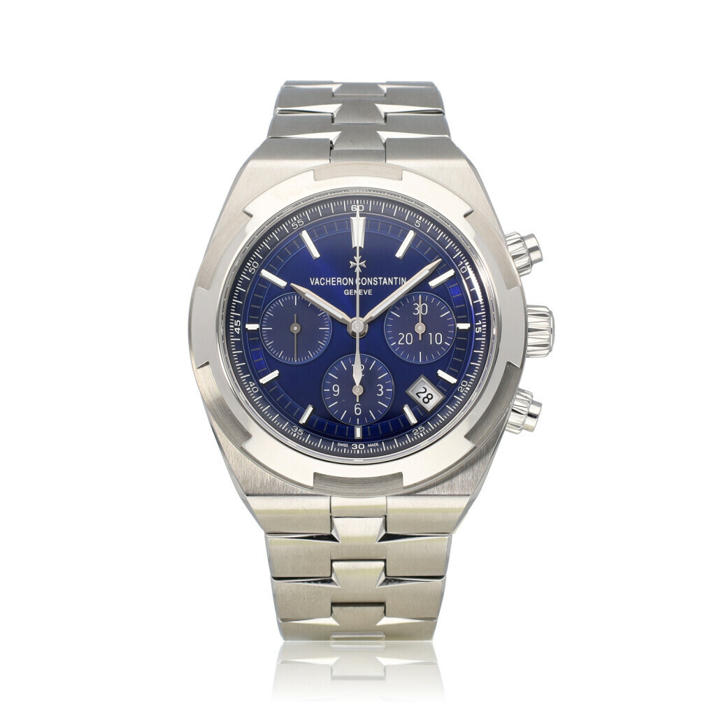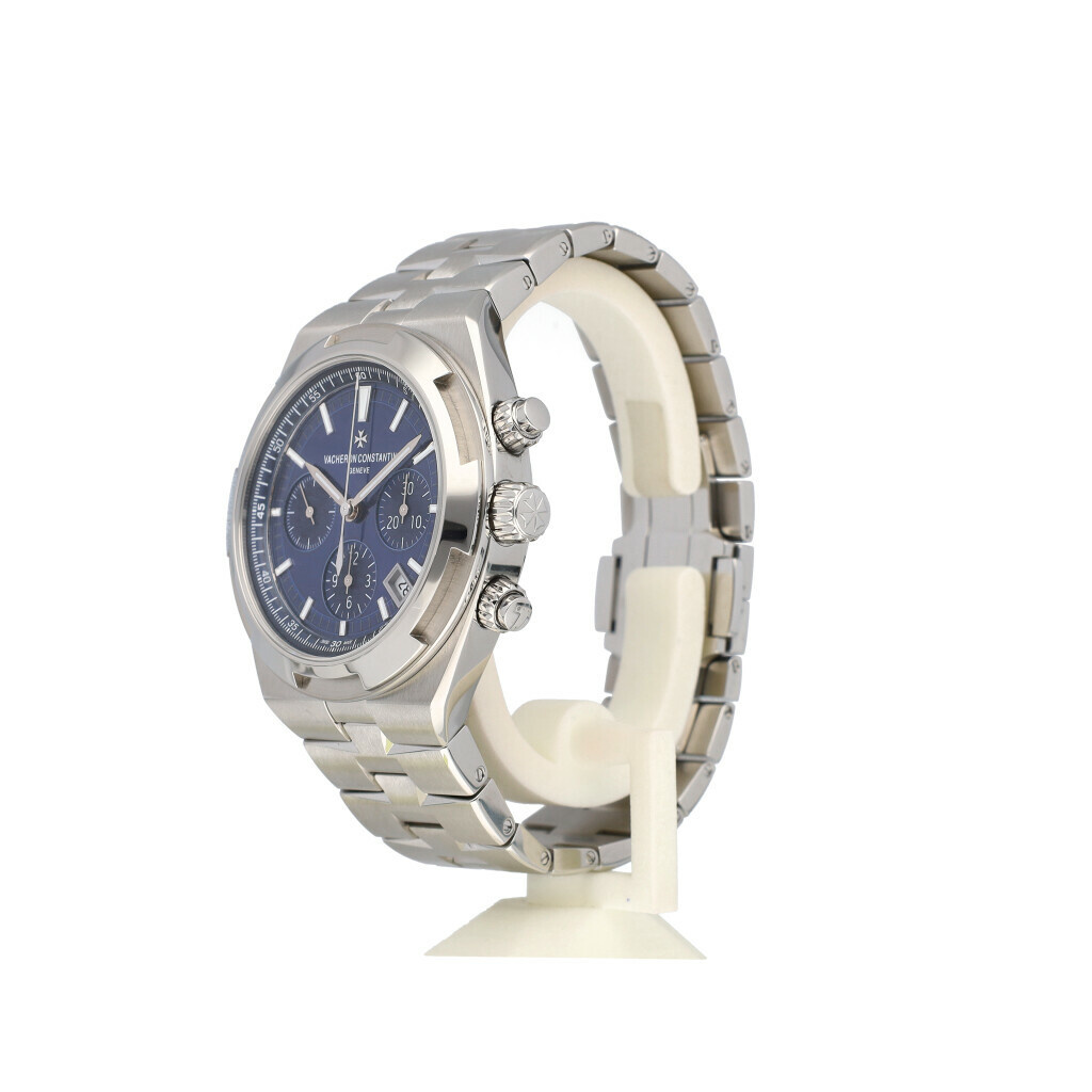In very good condition Vacheron Constantin Overseas Chronograph in steel with blue dial, steel bezel and steel bracelet from 2023 complete with box and papers. Comes with 2 extra straps and clasp.