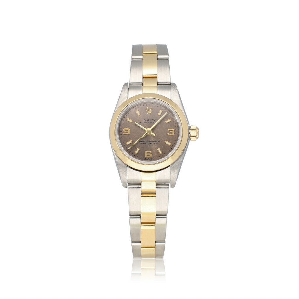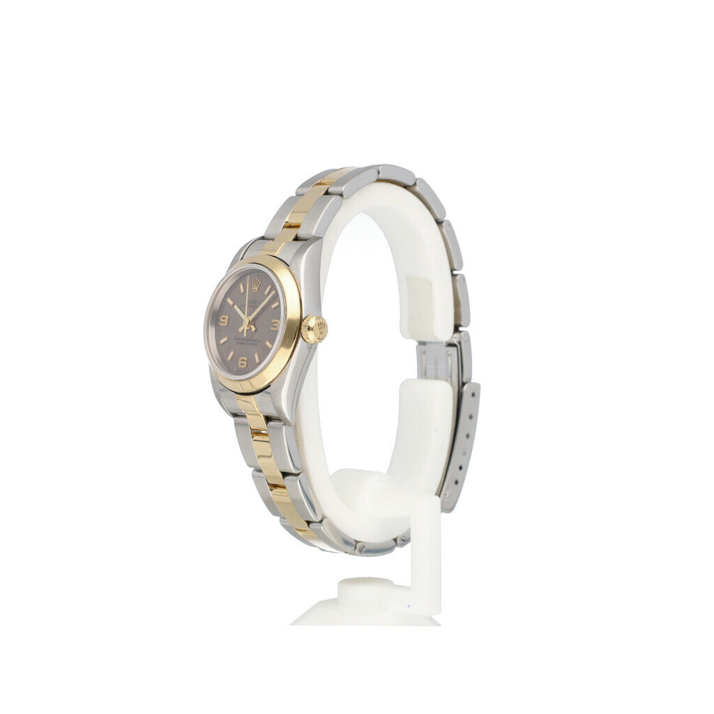 In very good condition Rolex Oyster Perpetual 26 in steel and yellow gold with Oyster bracelet and grey dial from +/- 2004 (F616... serial). No box and/or papers.