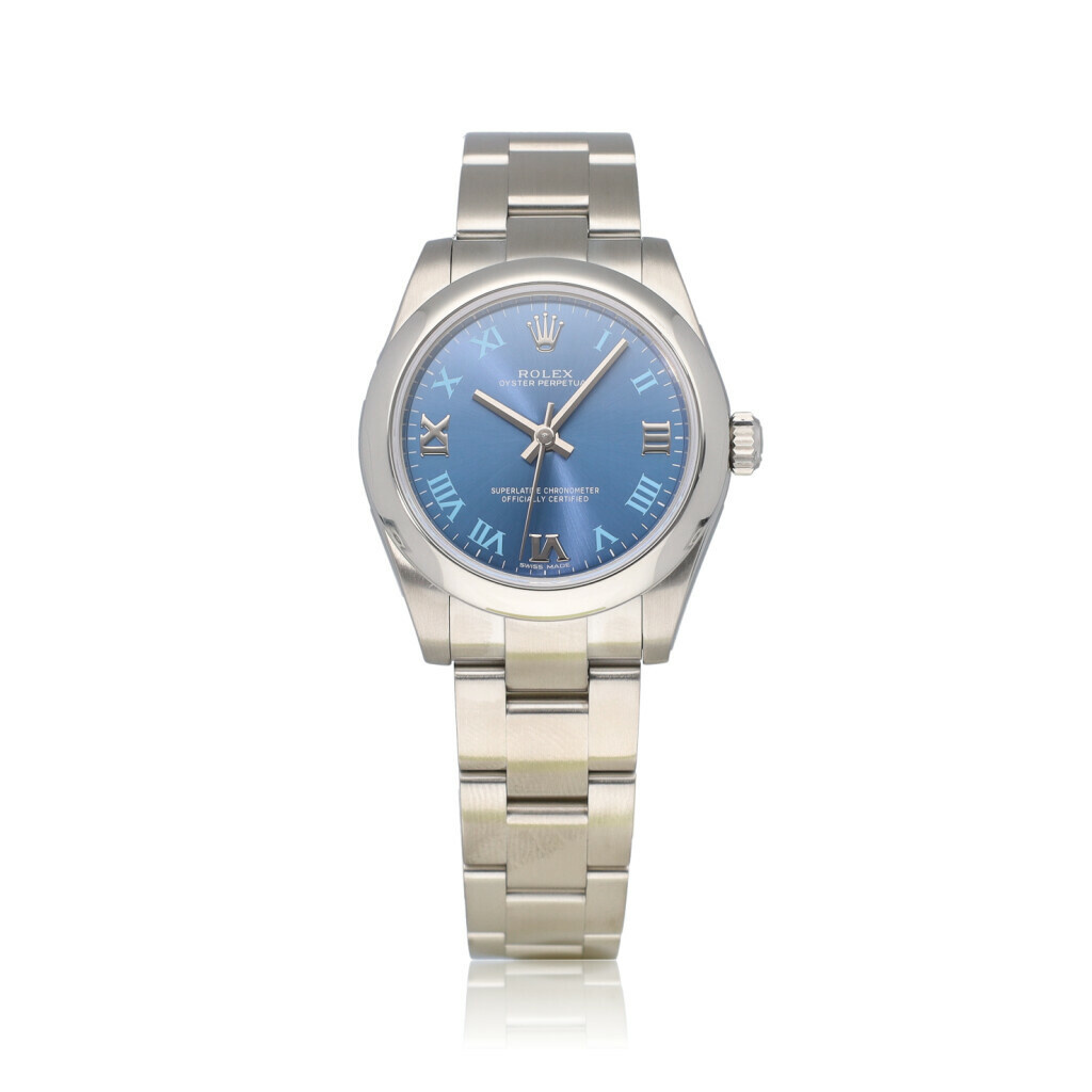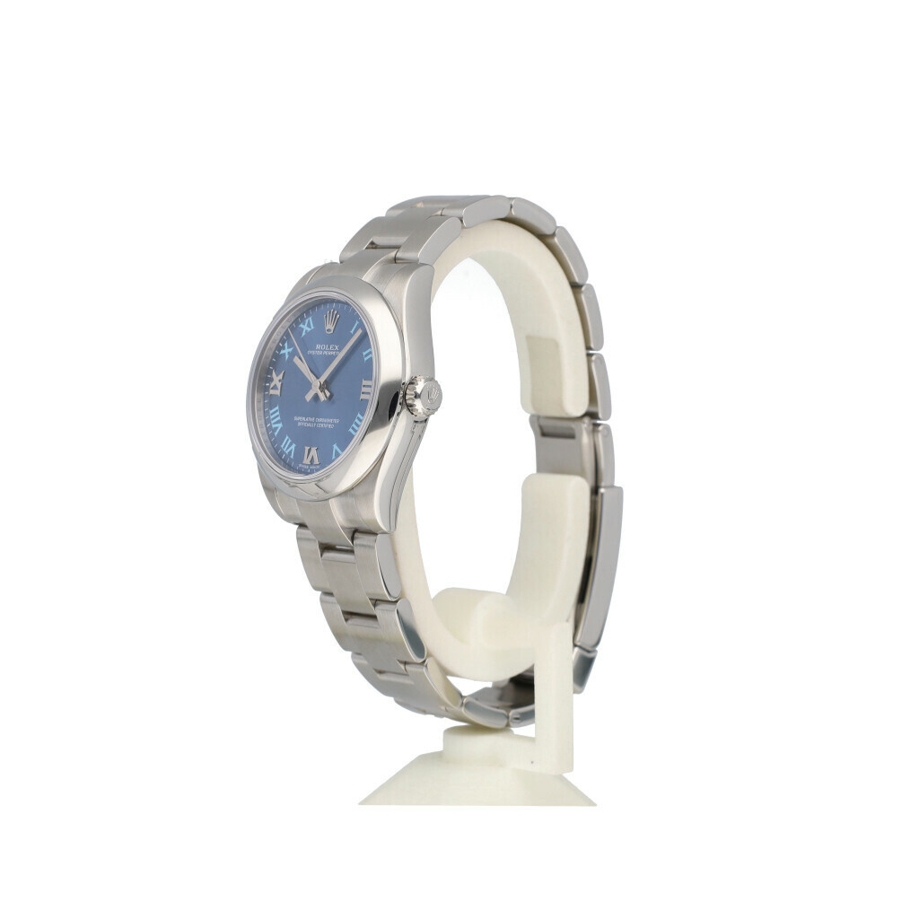 In very good condtion Rolex Oyster Perpetual 31 in steel with blue roman dial, steel domed bezel and steel Oyster bracelet from 2014 complete with box and papers. Rolex serviced 11-2025 and not worn since. Rolex service certificate included.