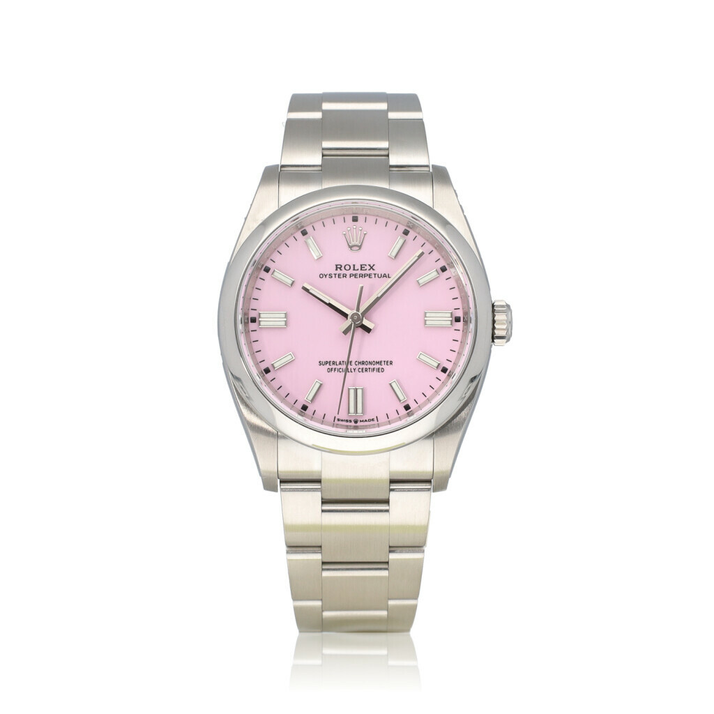 In very good condition Rolex Oyster Perpetual in steel with pink so called 'candy pink' dial, steel domed bezel and steel Oyster bracelet from 2023 complete with box and papers.