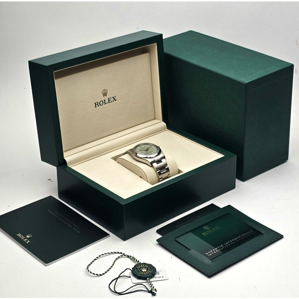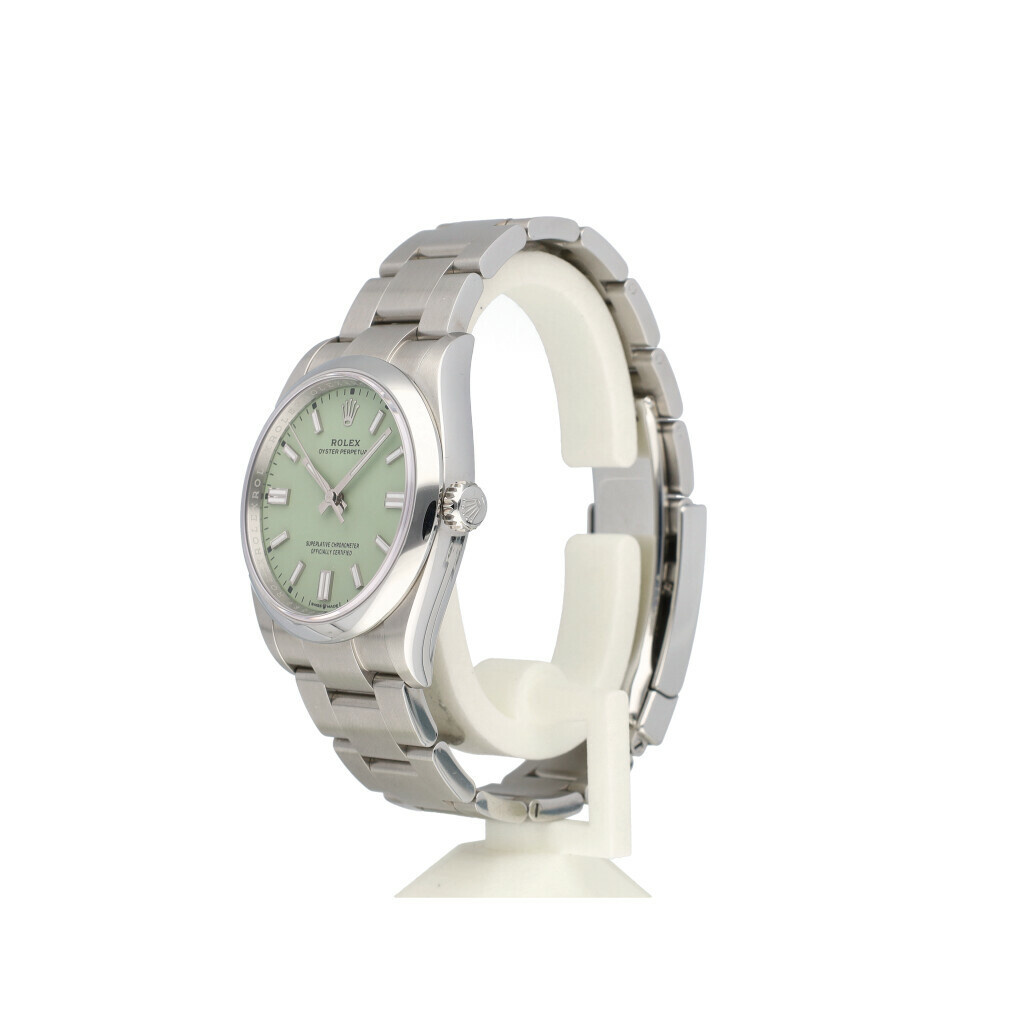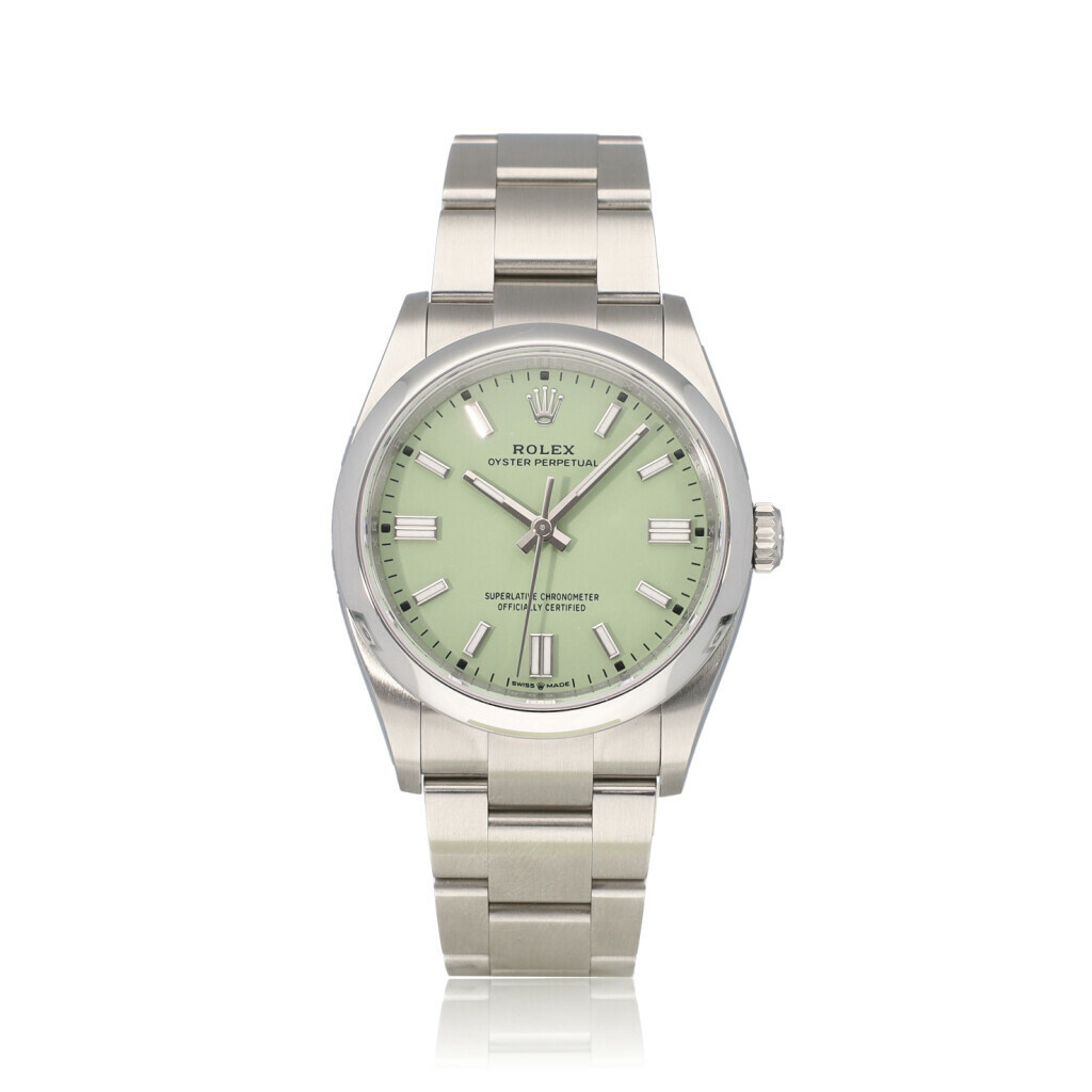 In very good condition, like new Rolex Oyster Perpetual 36 in steel with pistachio coloured dial, steel domed bezel and steel Oyster bracelet from 2025 complete with box and papers.