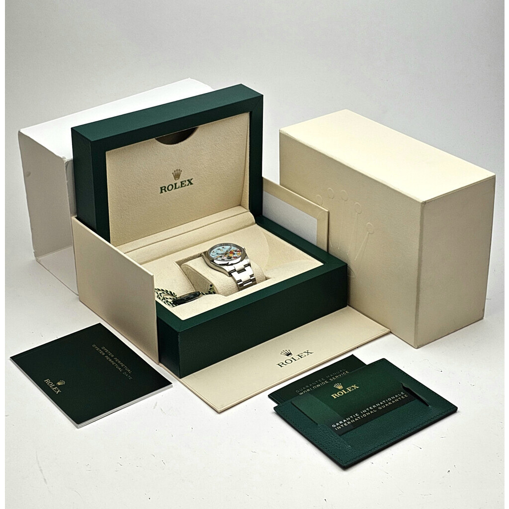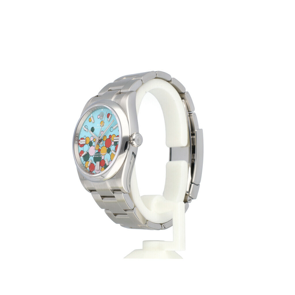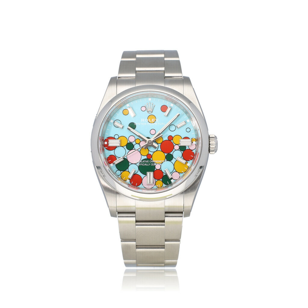 In very good condition Rolex Oyster Perpetual 36 mm in steel with celebration motif dial, domed bezel and steel Oyster bracelet from 2023 complete with box and papers.