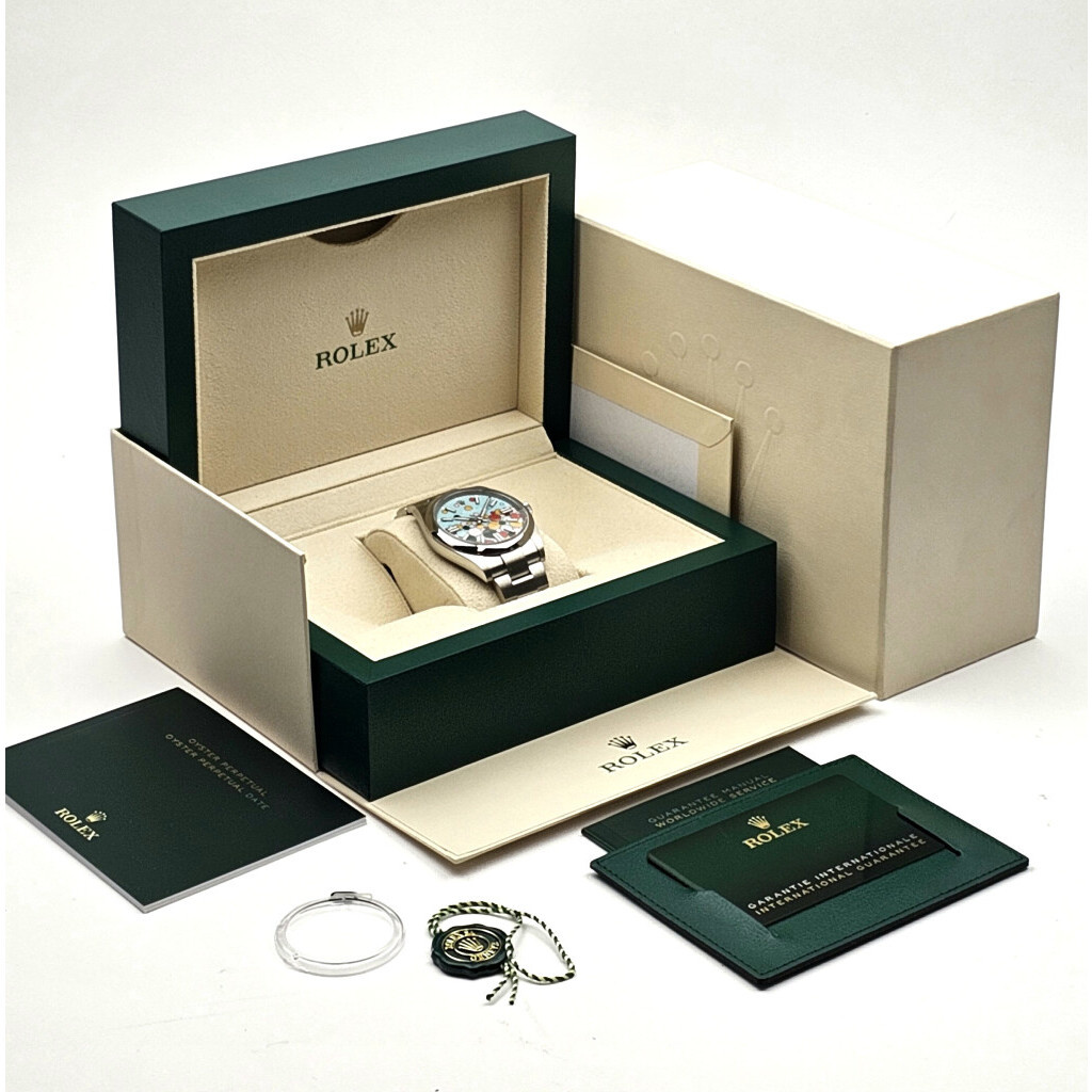 In very good condition Rolex Oyster Perpetual 41 mm in steel with celebration motif dial and steel Oyster bracelet from 2024 complete with box and papers.