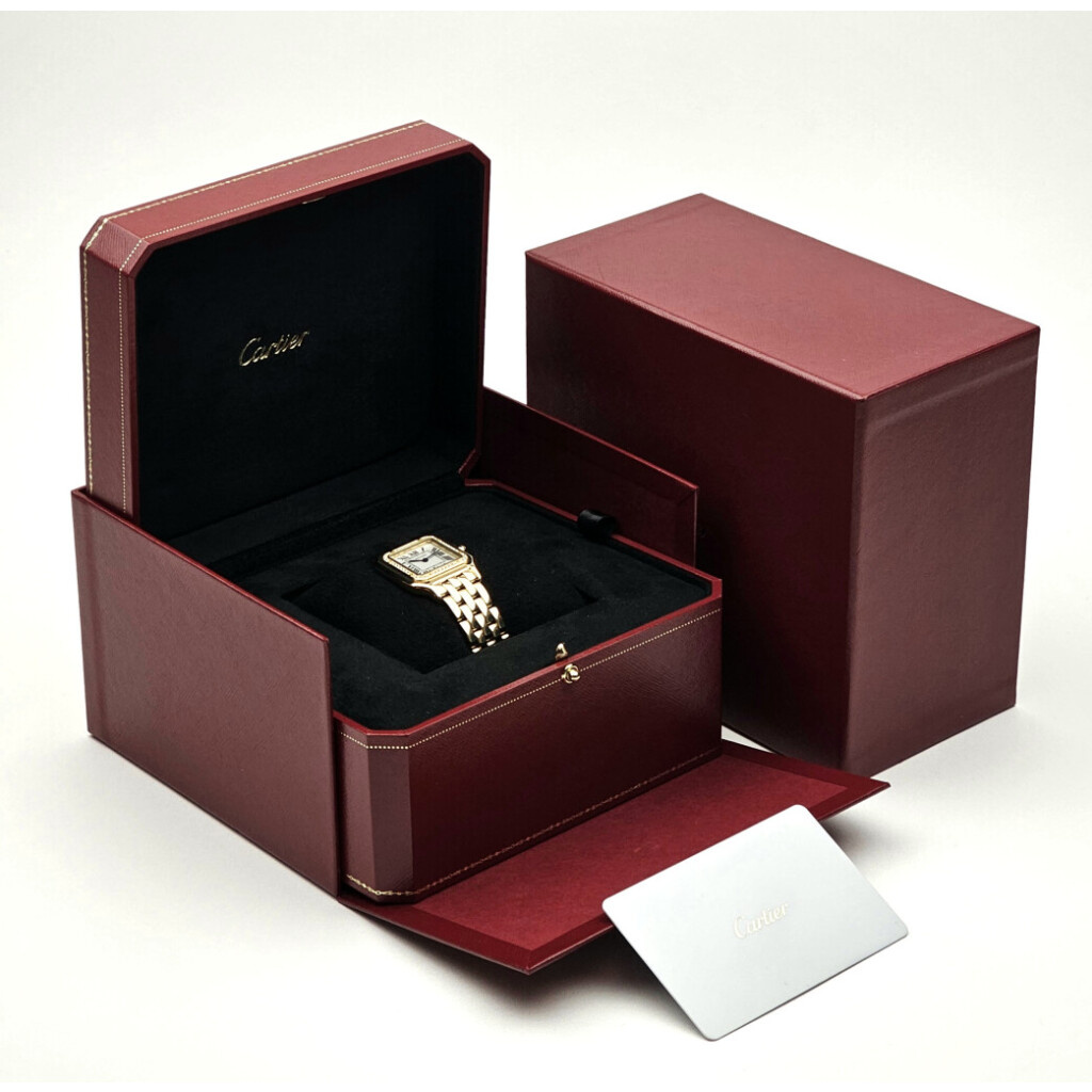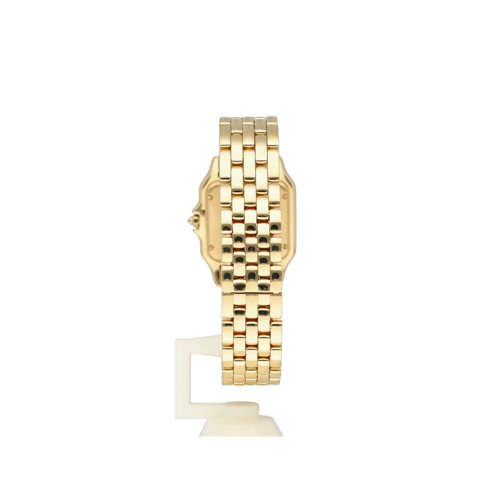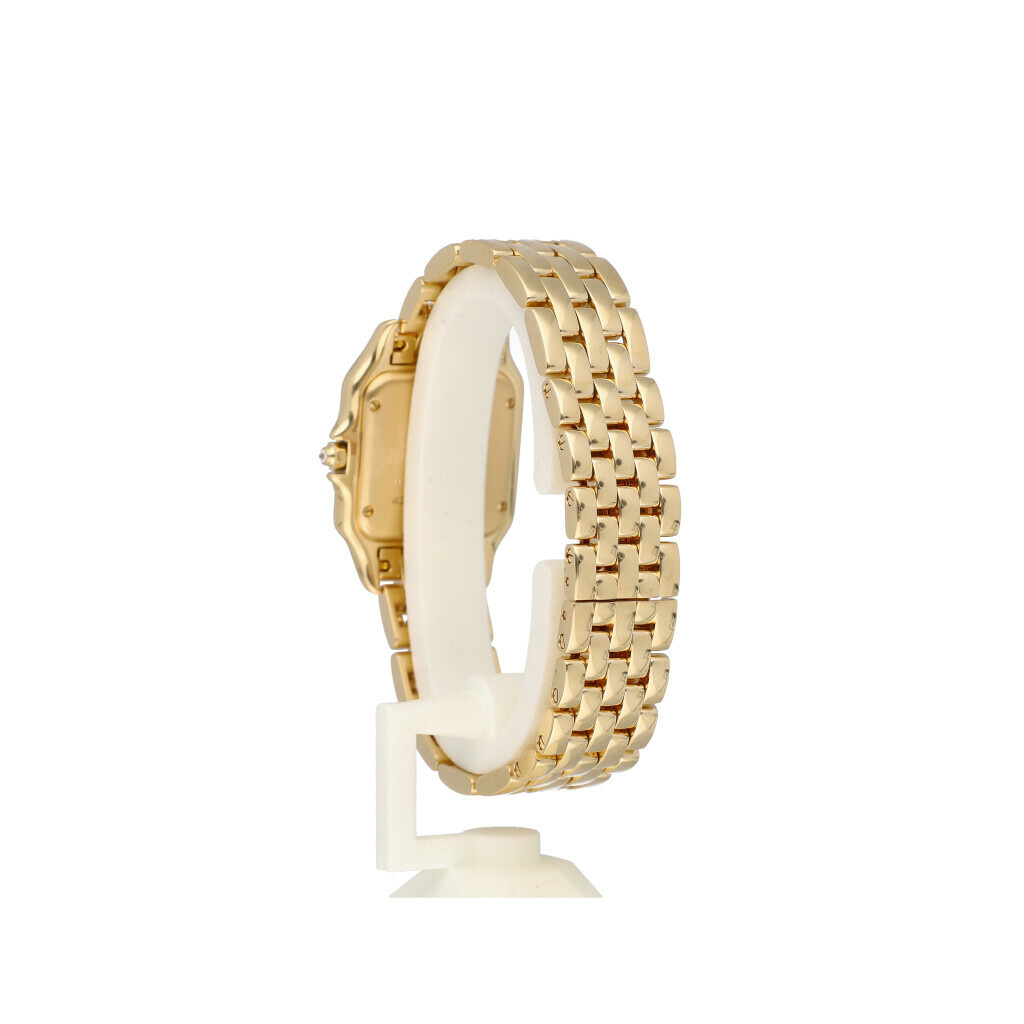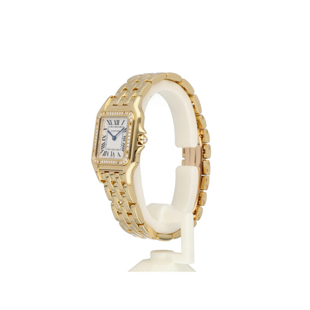 In very good condition Cartier Panthère de Cartier MM in yellow gold with silver roman dial, factory diamond yellow gold bezel and yellow gold bracelet from 2023 complete with box and papers. Current listprice € 35.600,-