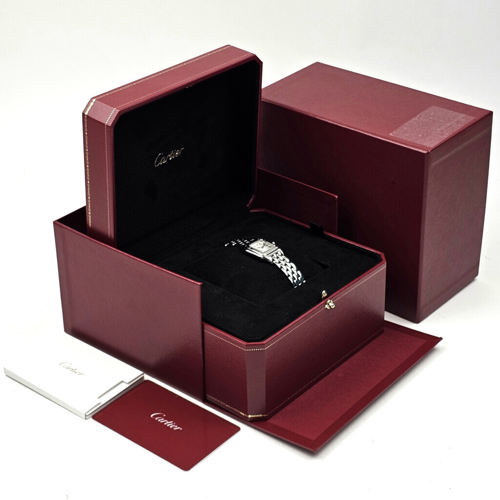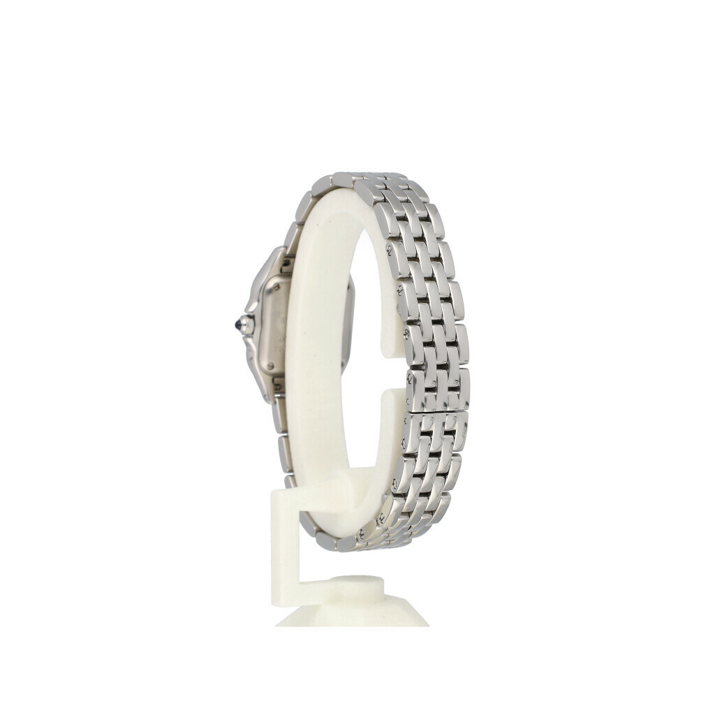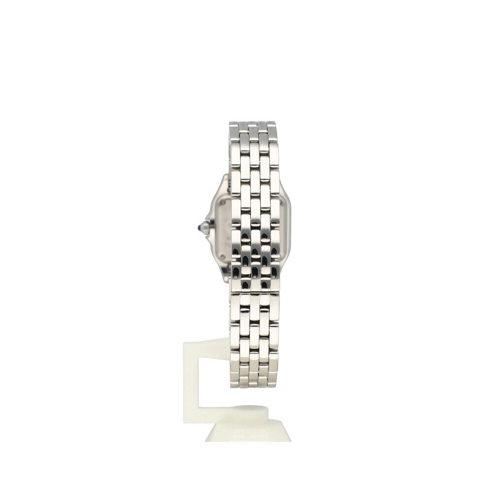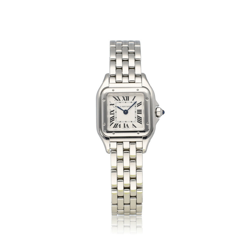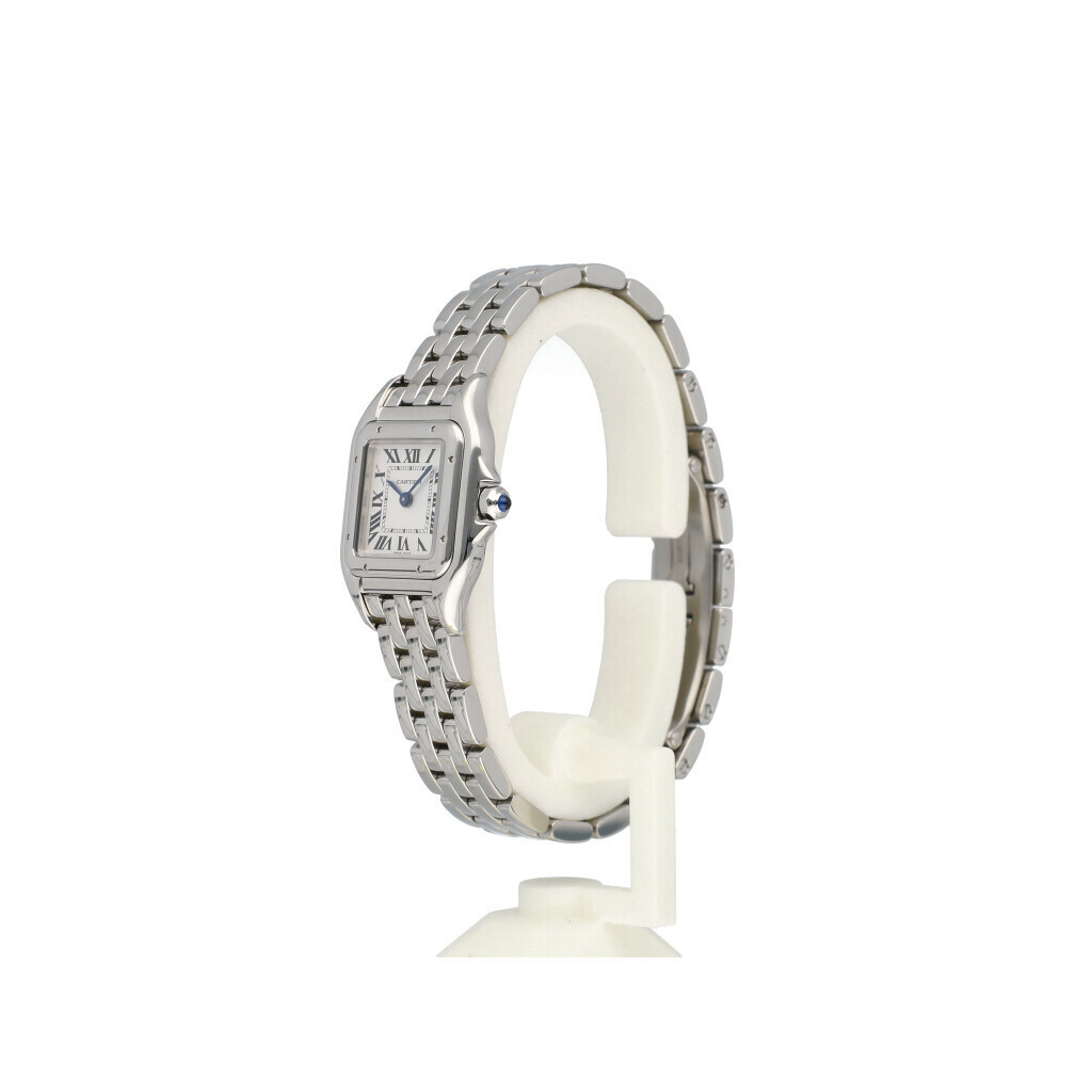 In very good condition Cartier Panthere small in steel with white roman dial and steel bracelet from 2022 complete with box and papers.