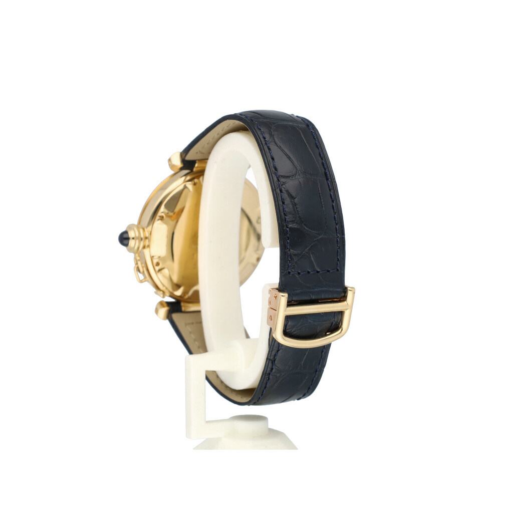 In very good condition Cartier Pasha de Cartier in yellow gold with rare dial grill - silver roman dial and brand new leather Cartier strap from 1997 complete with box and papers.