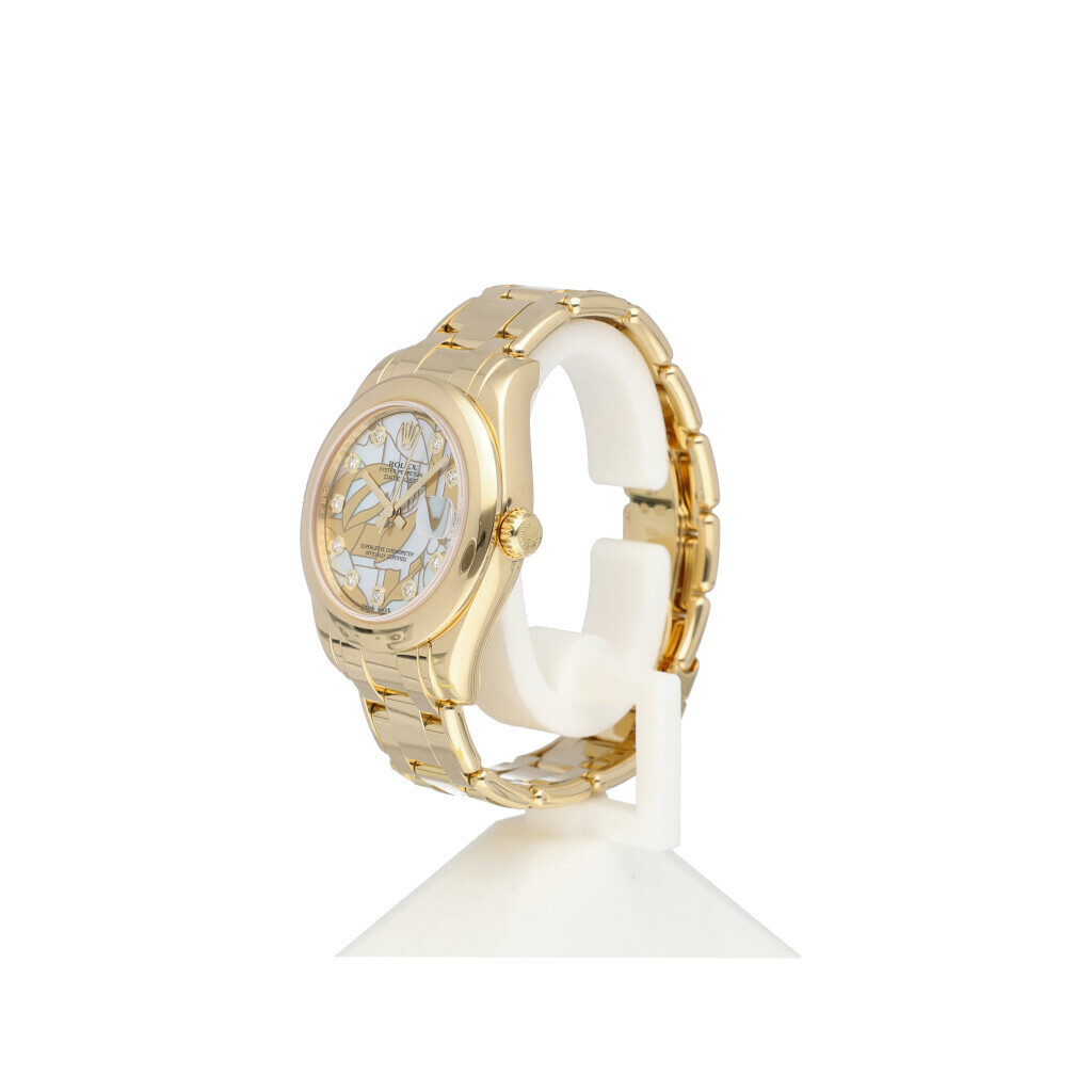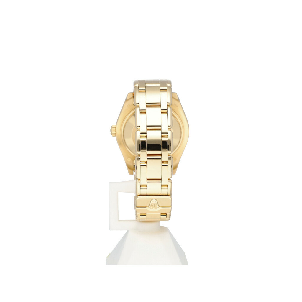In very good condition Rolex Pearlmaster 34 in gold with goldust so called factory 'dream' mother of pearl diamond dial from 2011 complete wtih box and papers. Rolex serviced 4-2025 and not worn since. Rolex service certificate included.