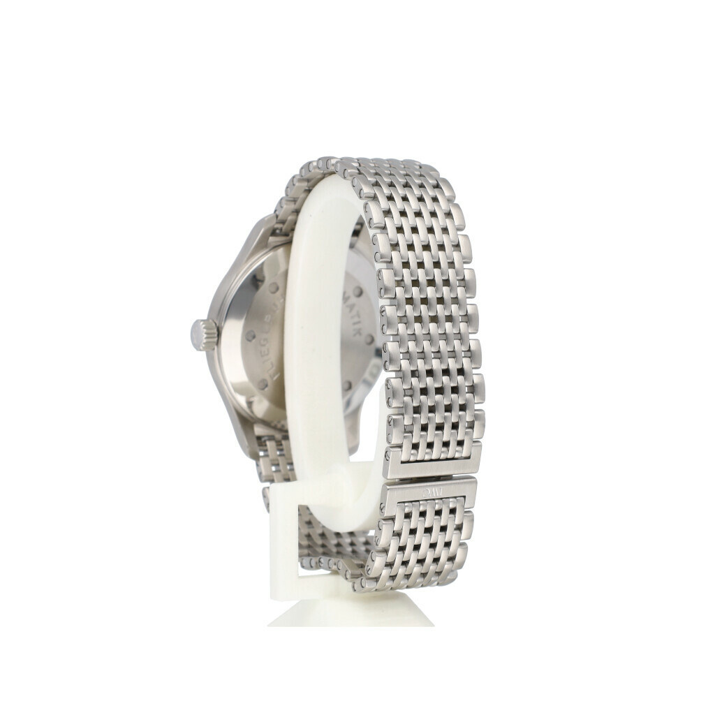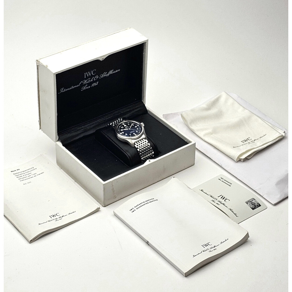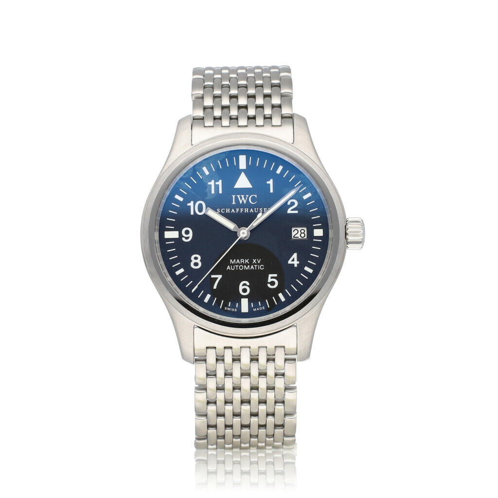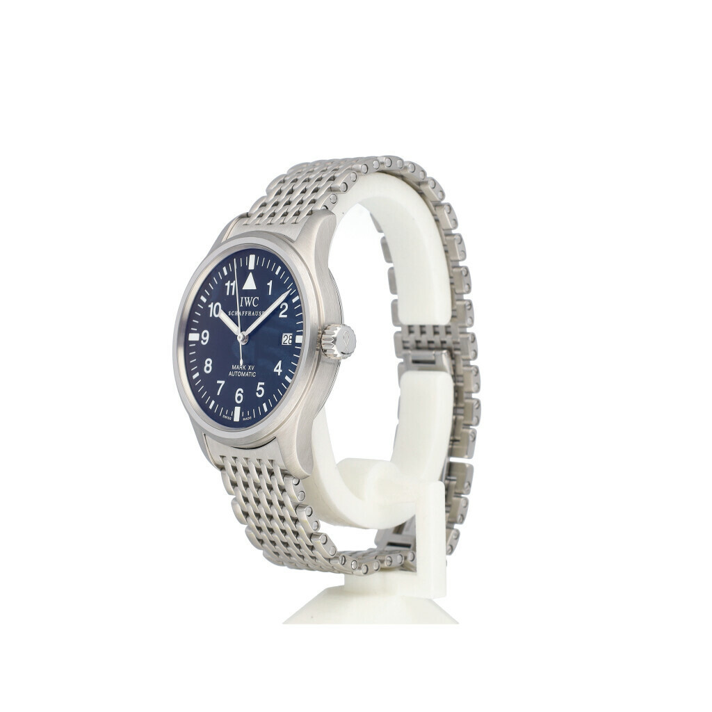 In very good condition IWC Pilot Mark XV Spitfire in steel with black dial and steel IWC bracelet from 2003 complete with box and papers. IWC serviced 5-2025 for € 1.005,- and not worn since. IWC service papers and IWC service invoice included.