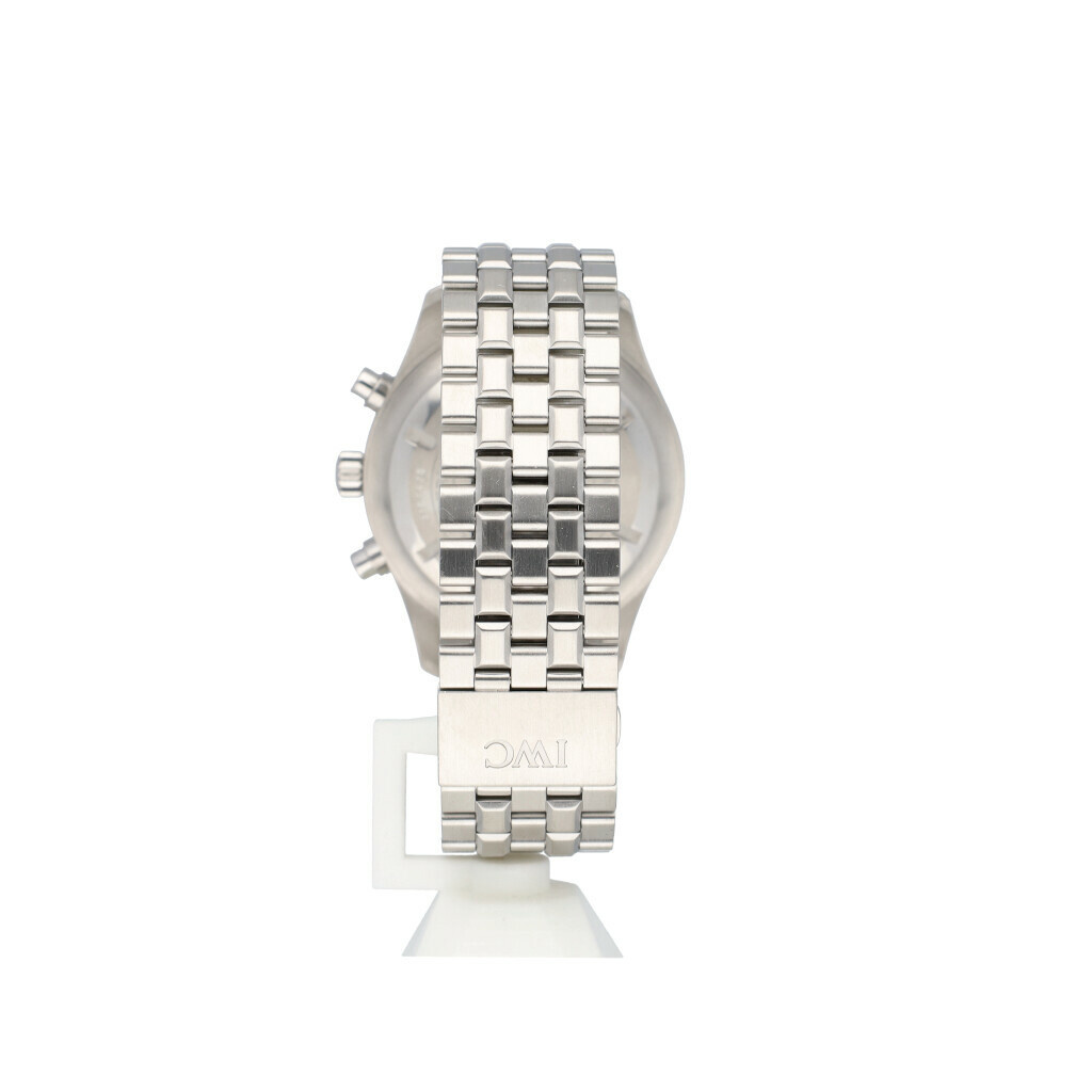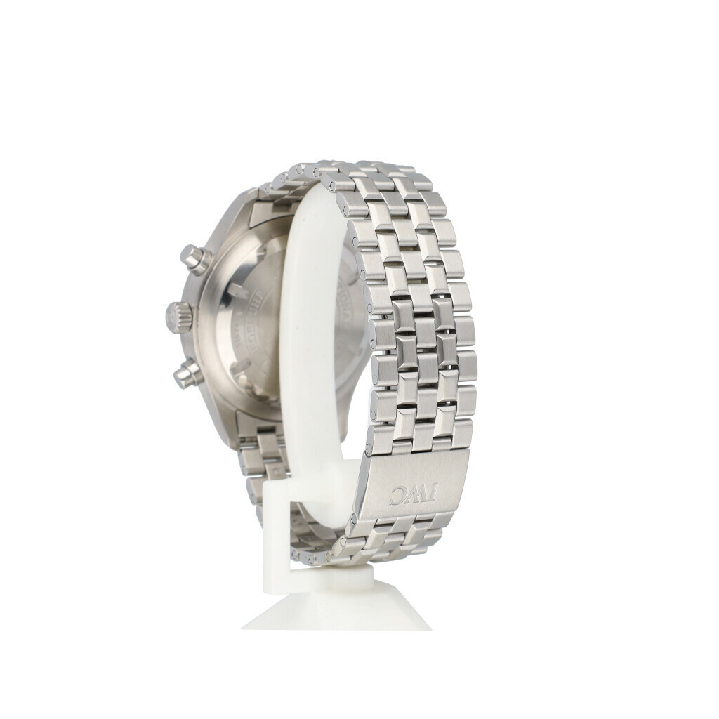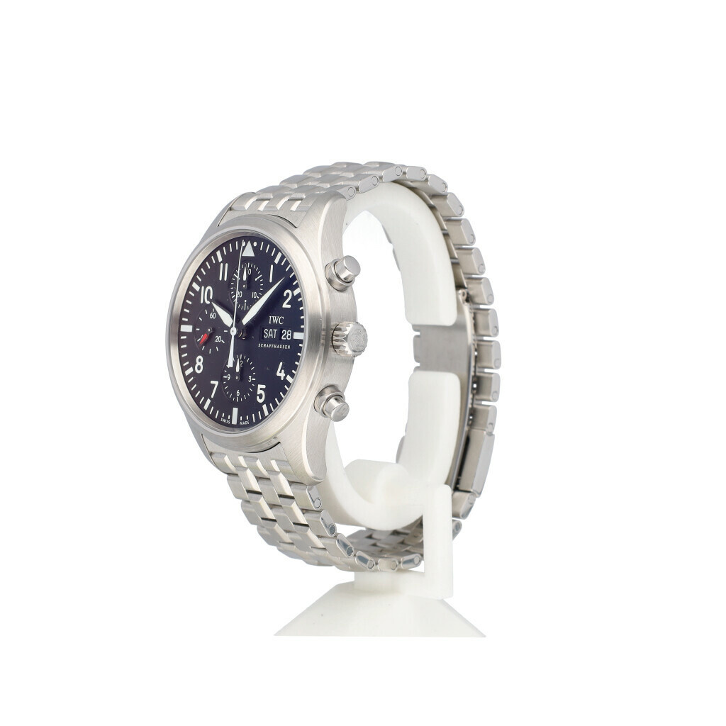 In very good condition IWC Pilot Chronograph automatic in steel with black dial and steel bracelet. No box and/or papers.