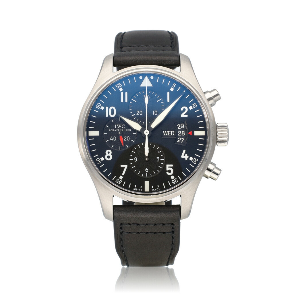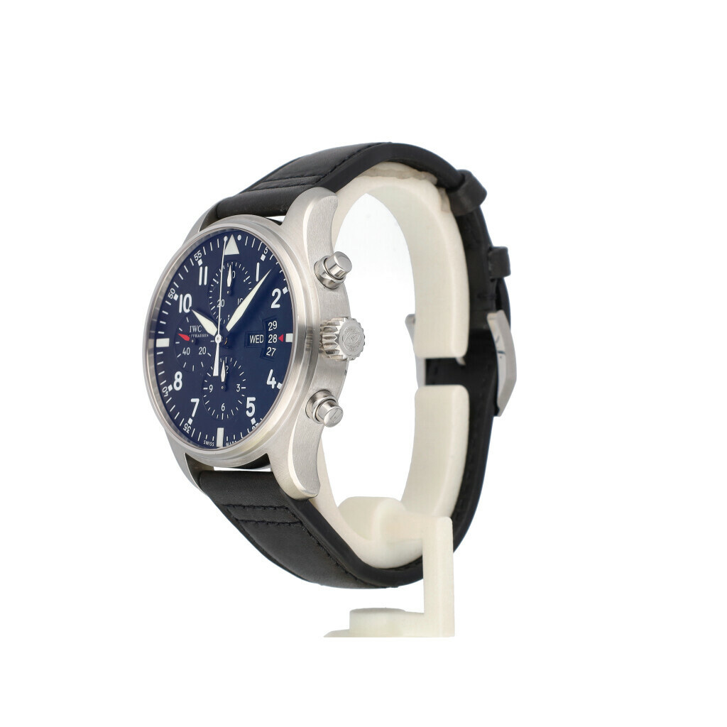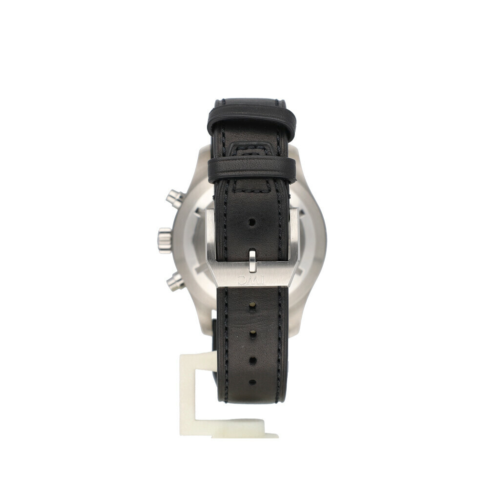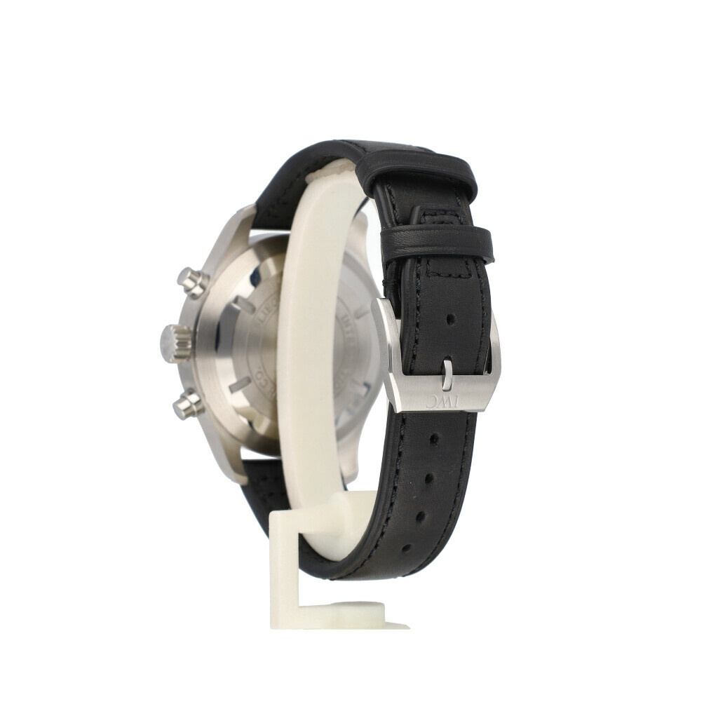 In very good condition IWC Pilot's Watch Double Chronograph in steel with black dial and brand new leather IWC strap. No box and/or papers.