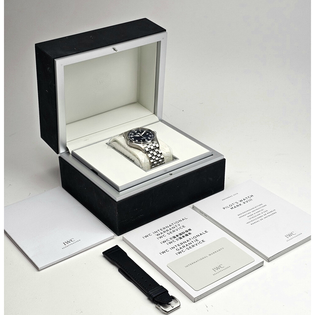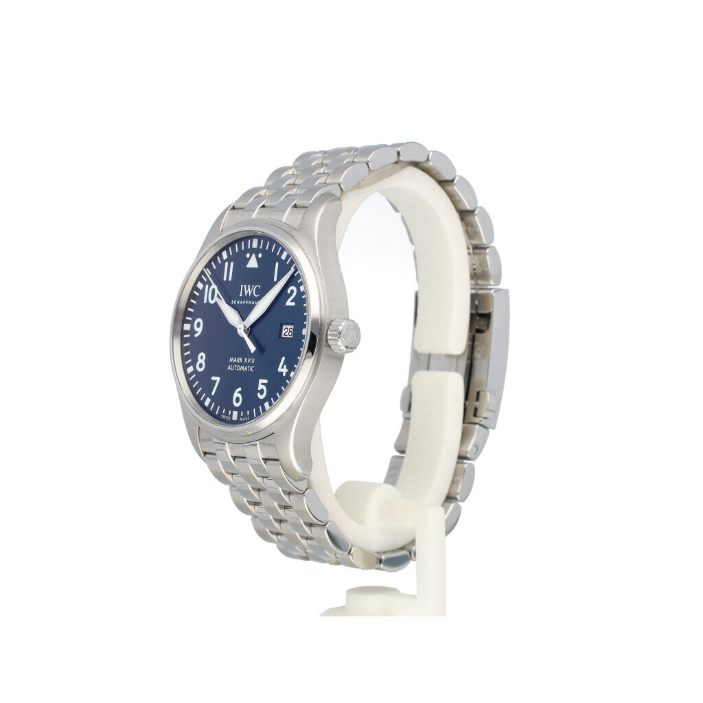 In very good condition IWC Pilot's Watch Mark XVIII in steel with blue dial ans teel IWC bracelet from 2016 complete with box and papers.