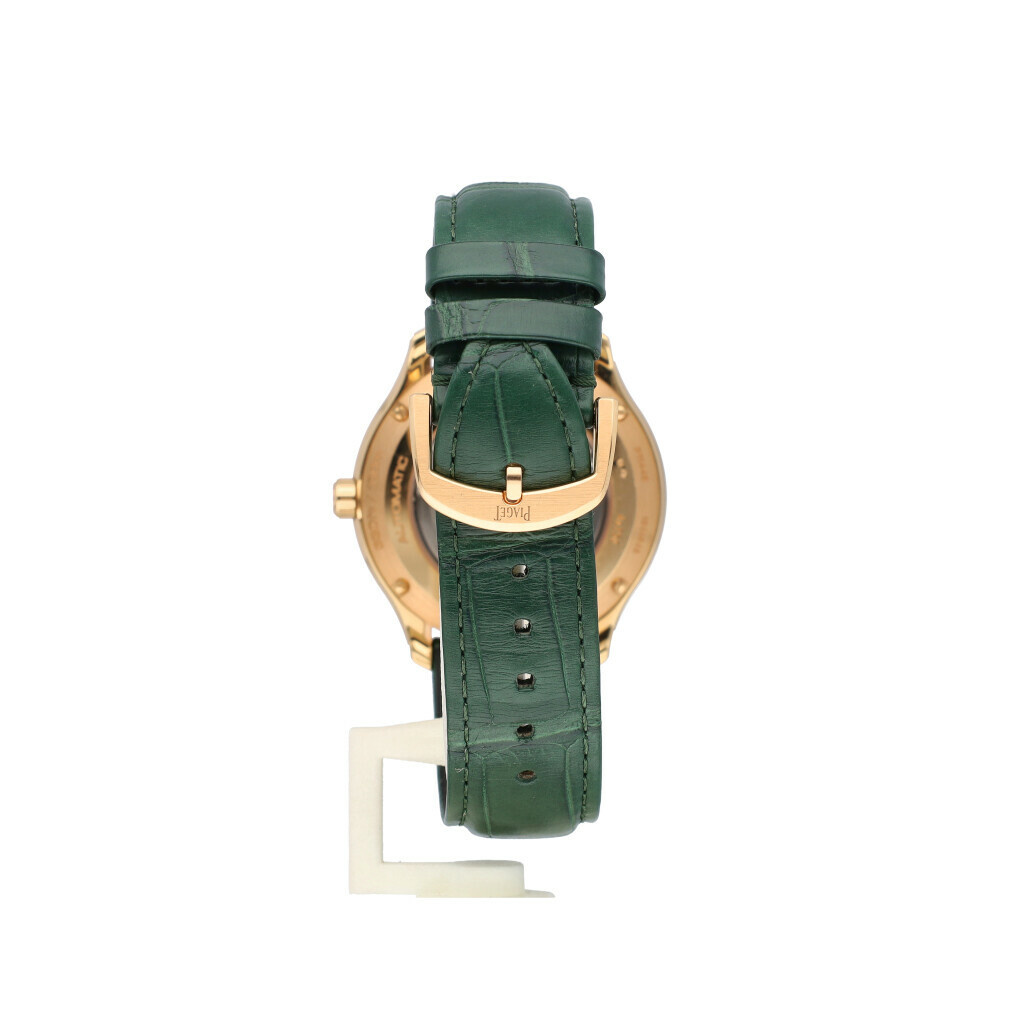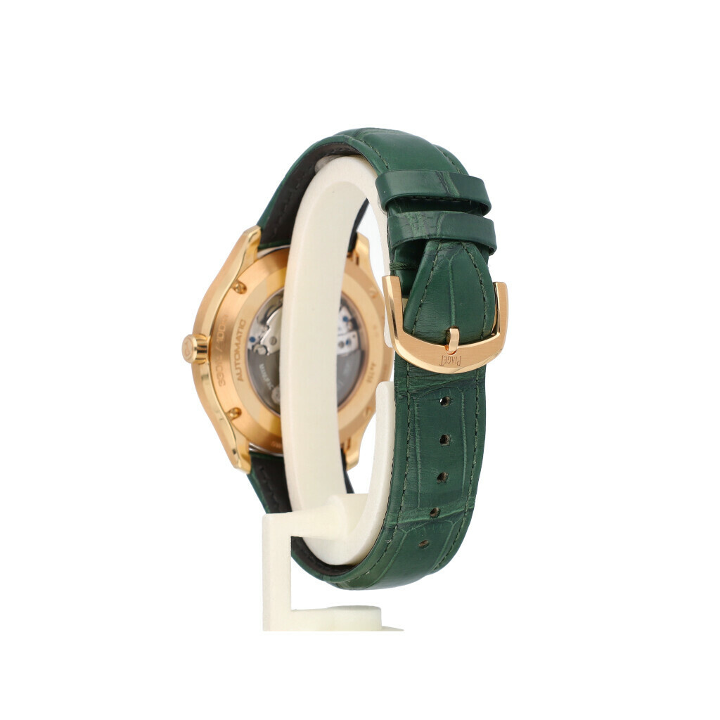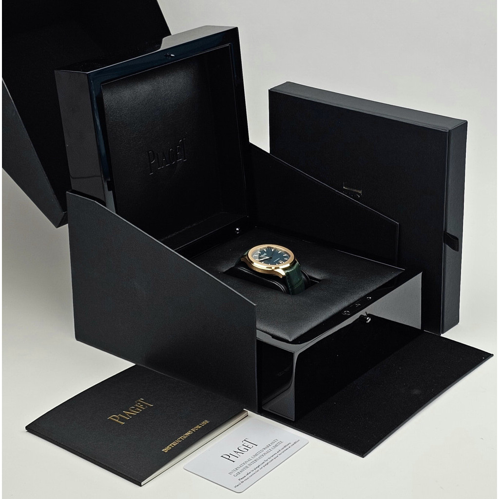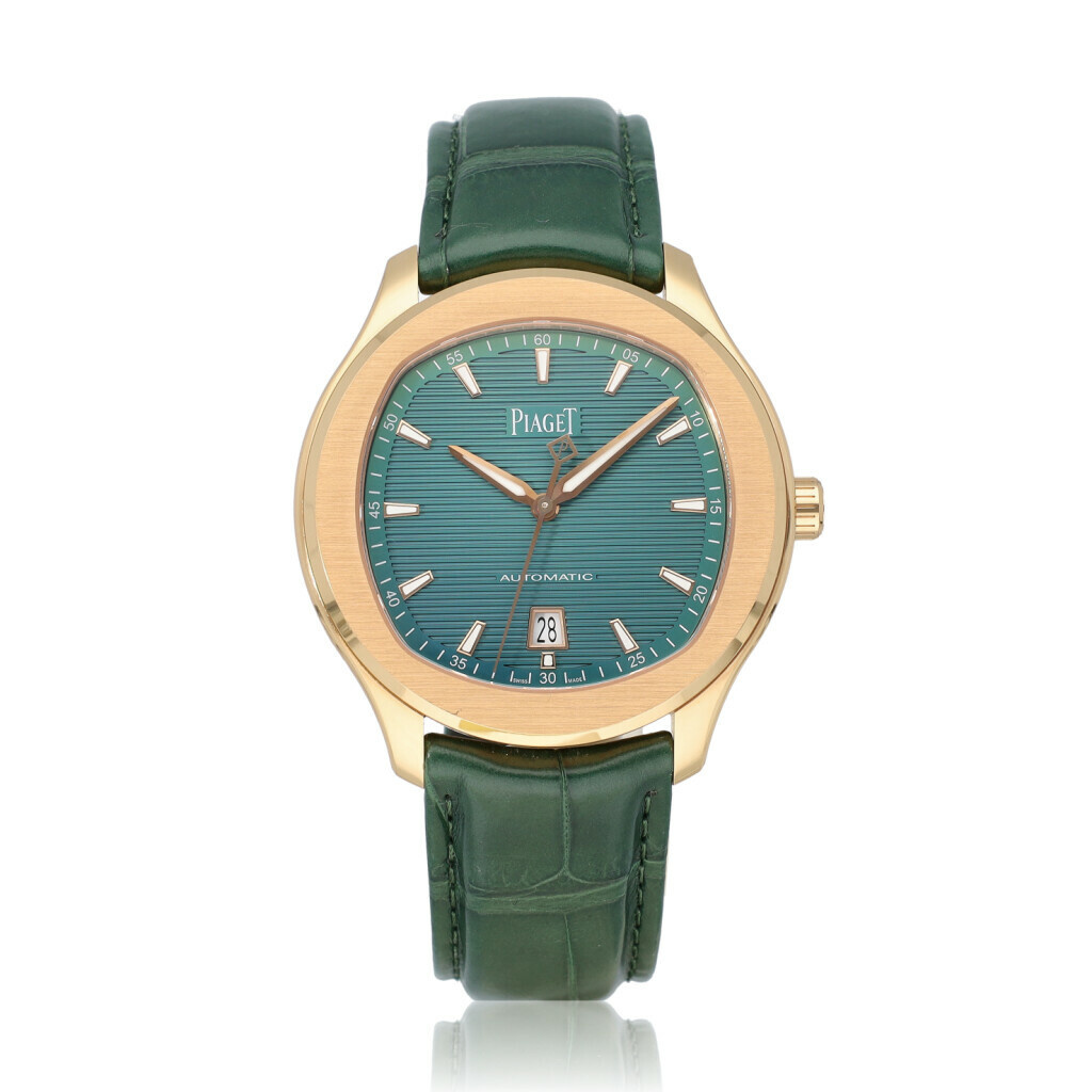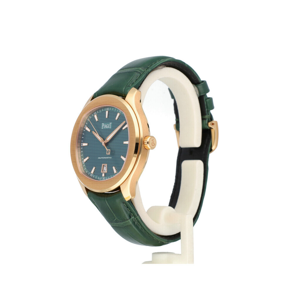 In very good condition Piaget Polo Date in rose gold with green dial and green leather strap from 2025 complete with box and papers. Current listprice € 34.800,-