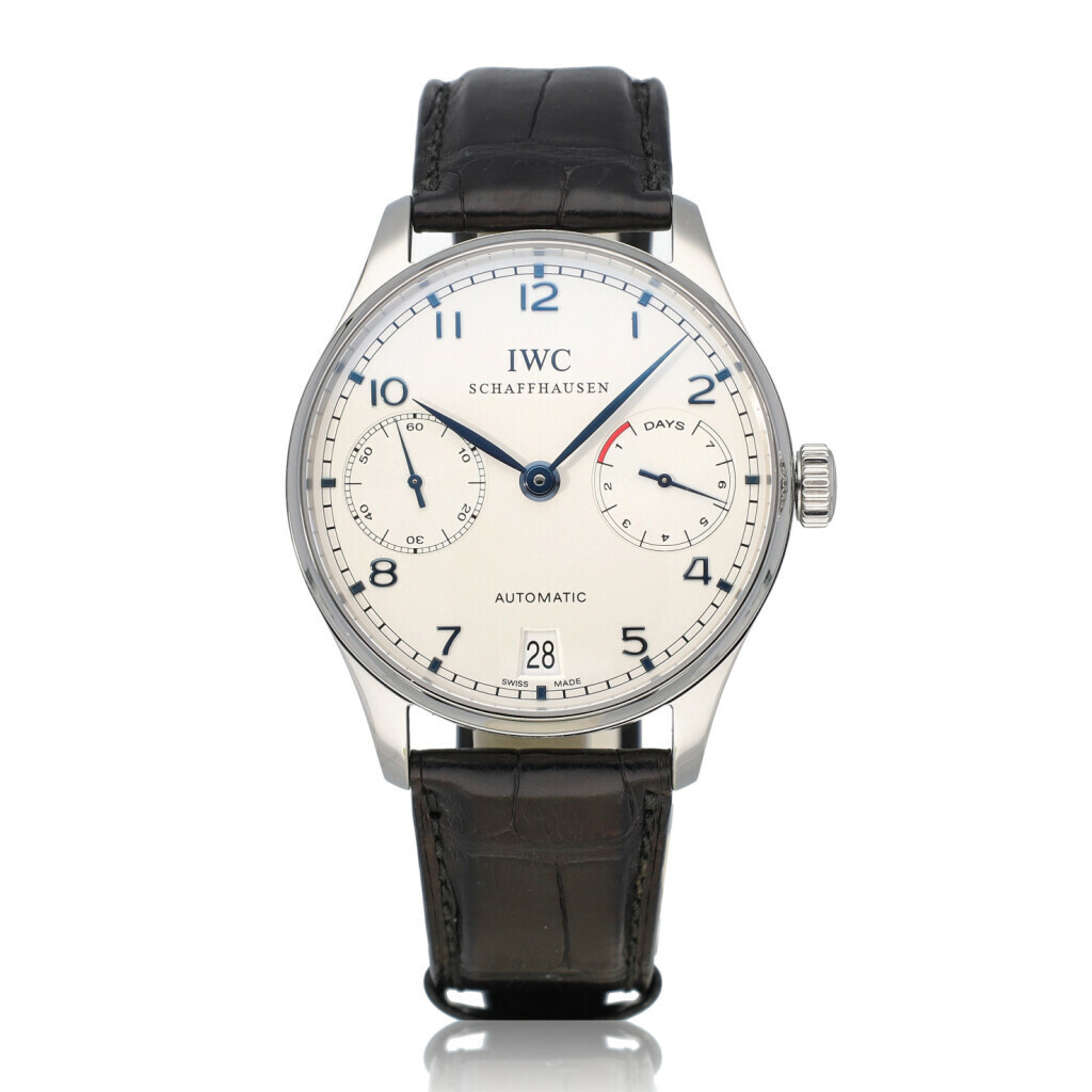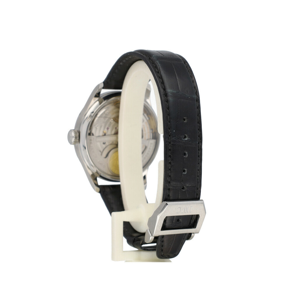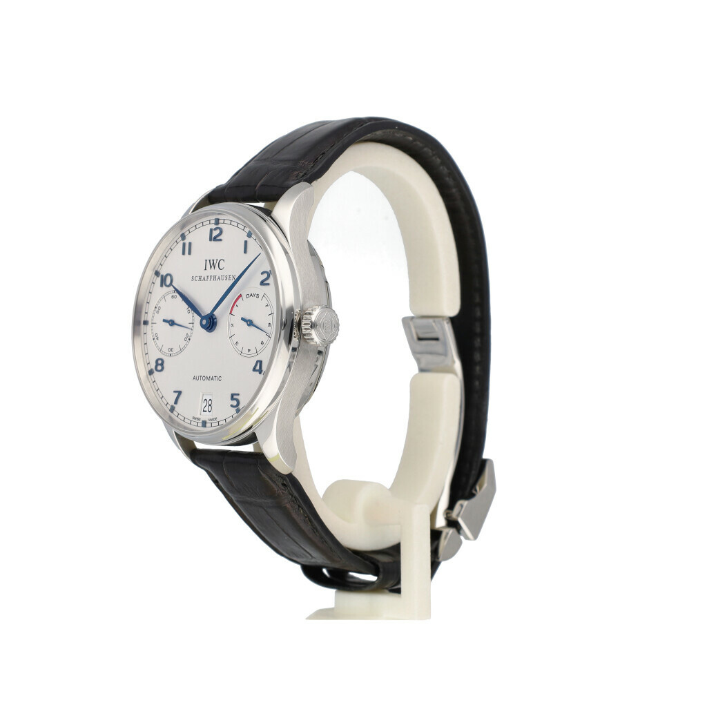 In very good condition IWC Portugieser Automatic 7-days in steel with silver dial and black alligator strap complete with box, no papers.