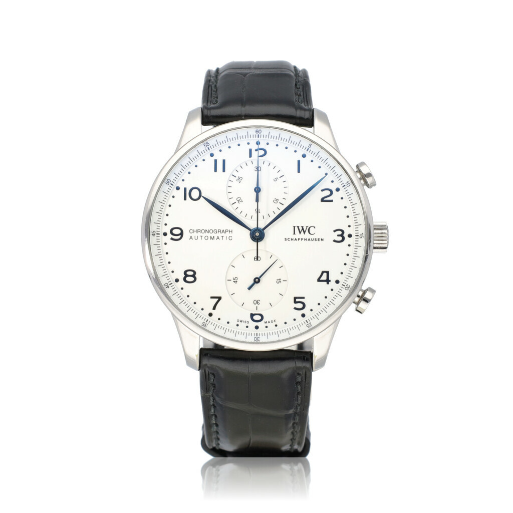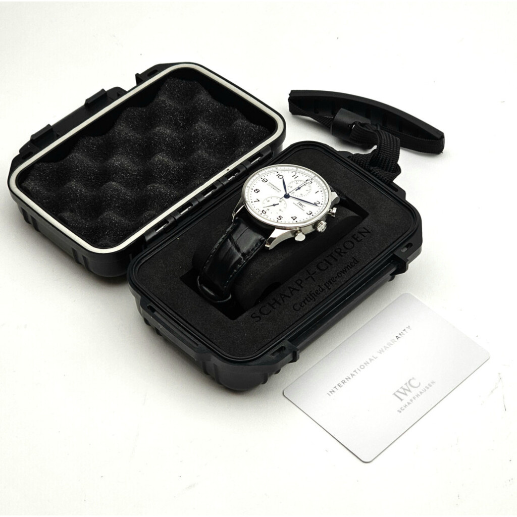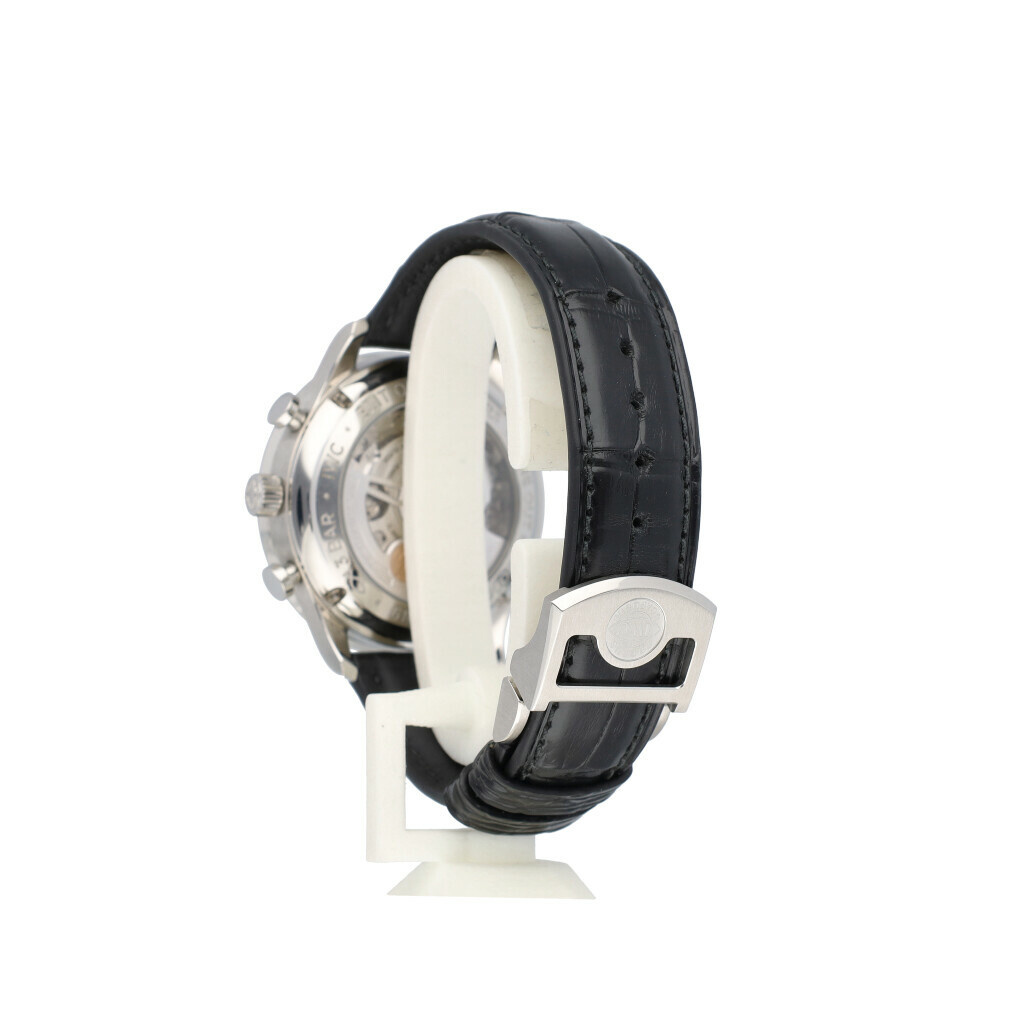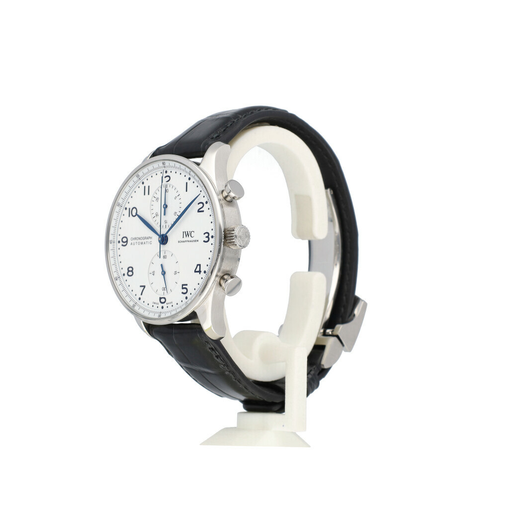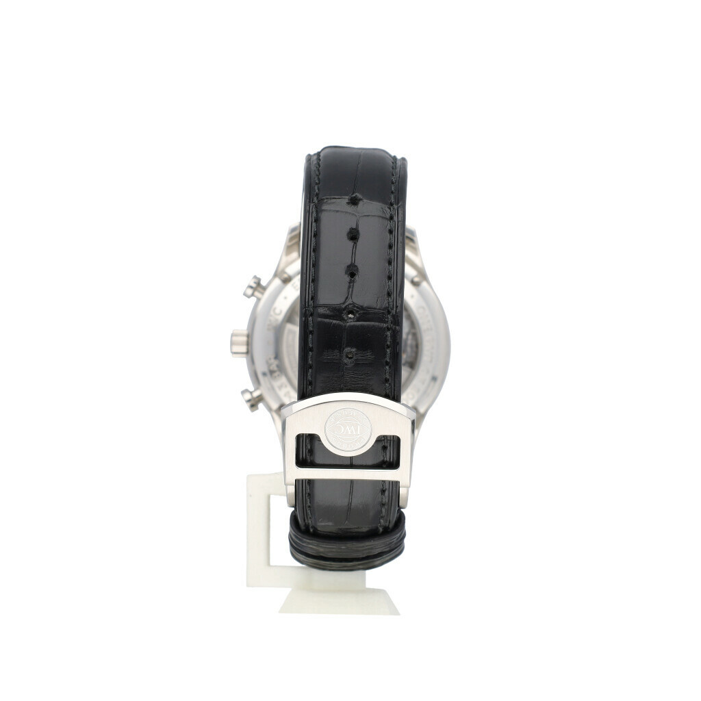 In very good condition IWC Portuguese Chronograph Edition 150 Years in steel with white dial and brand new IWC balck alligator strap from 2019 complete with papers, no box. Limited to 2.000 pieces worldwide.