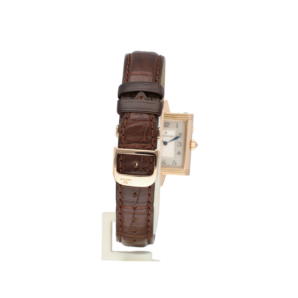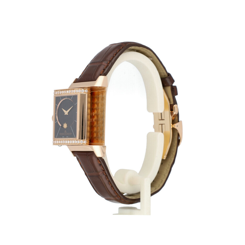 In very good condition Jaeger-LeCoultre Reverso Duetto Duo Day & Night with factory diamond bezel in rose gold from 2013 ref 269.2.54 complete with papers, no box. JLC serviced 9-2025 including new brown JLC strap, not worn since. JLC service papers included.