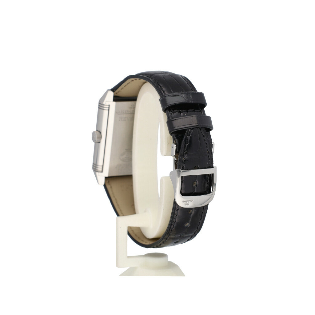 In very good condition Jaeger-LeCoultre Reverso Grand Taille in steel with silver dial and brand new black JLC strap without box and/or papers.