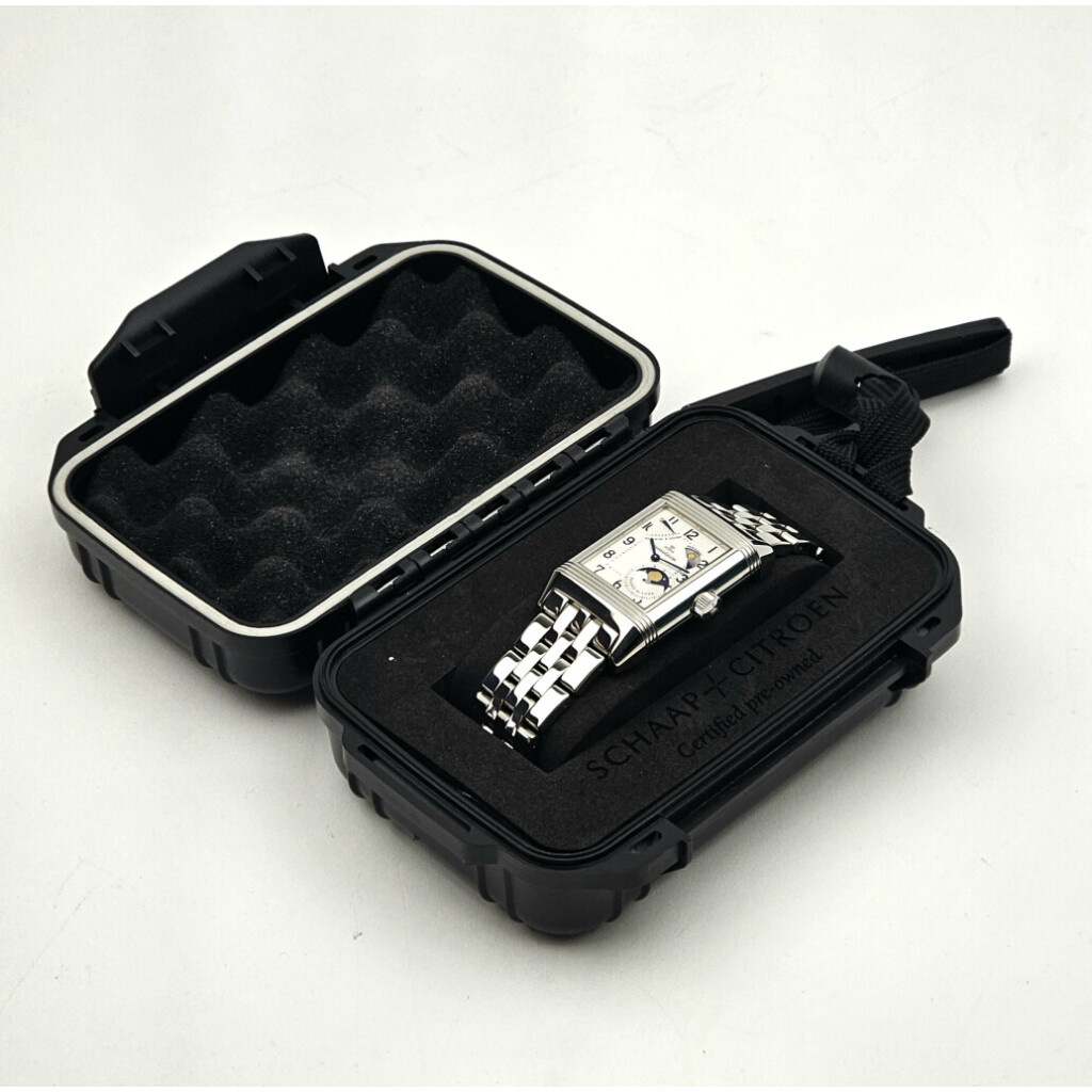 In very good condition Jaeger-LeCoultre Grande Reverso in steel with Sun and Moon comes with no box and/ or papers.