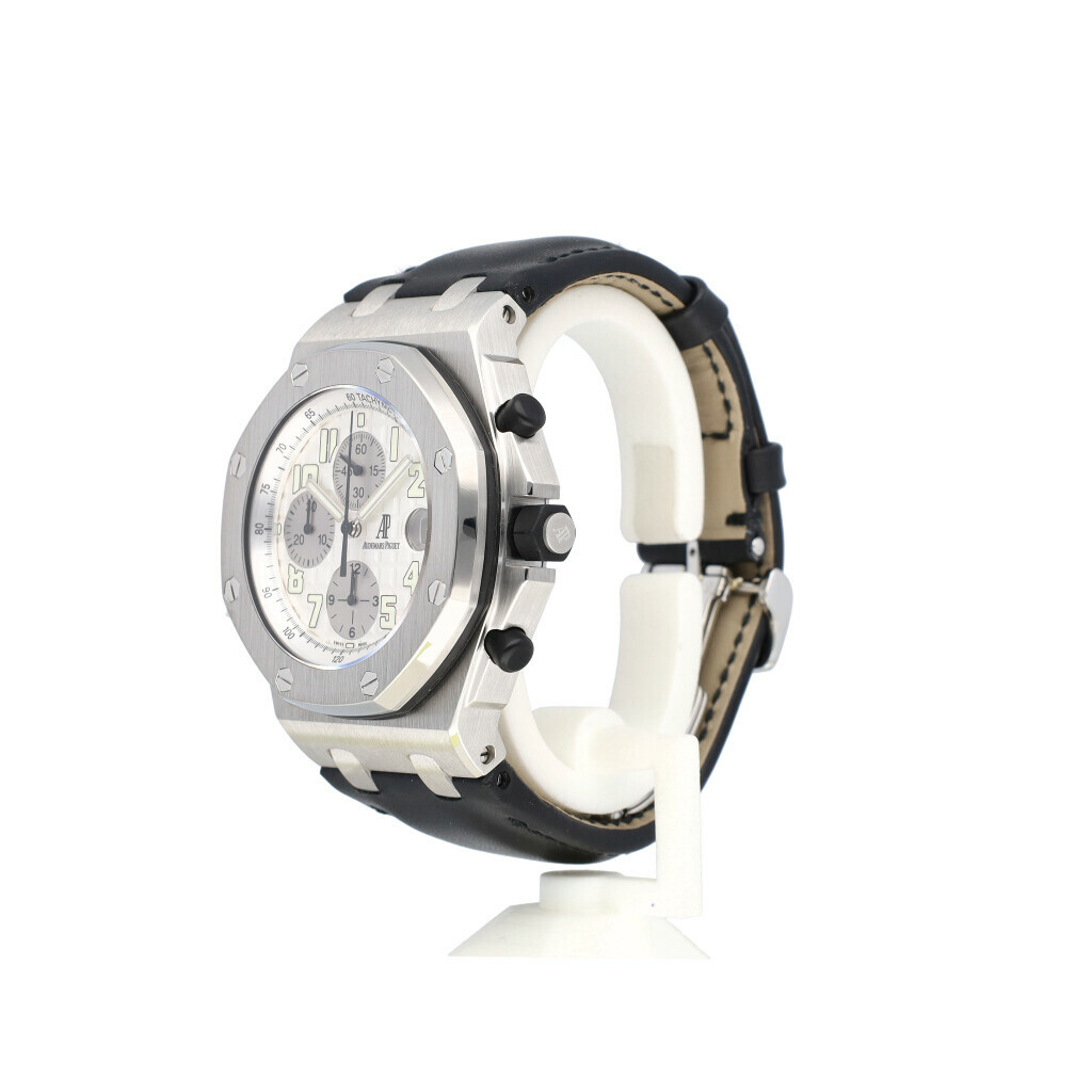 In very good condition Audemars Piguet Royal Oak Offshore Chronograph in steel with silver / white dial and brand new AP alligator leather strap complete with box and papers. No date filled in on certificate. F45... serial so from +/- 2006/2007.