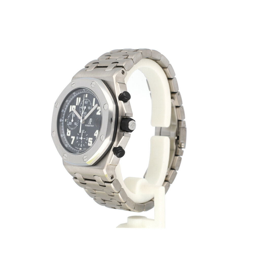 In very good condition Audemars Piguet Royal Oak Offshore in titanium with black dial, titanium bezel and titanium Audemars Piguet bracelet. No box and/or papers. AP serviced 1-2023 and hardly worn since. AP service invoice included.