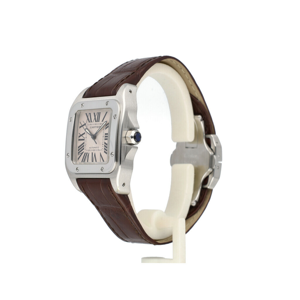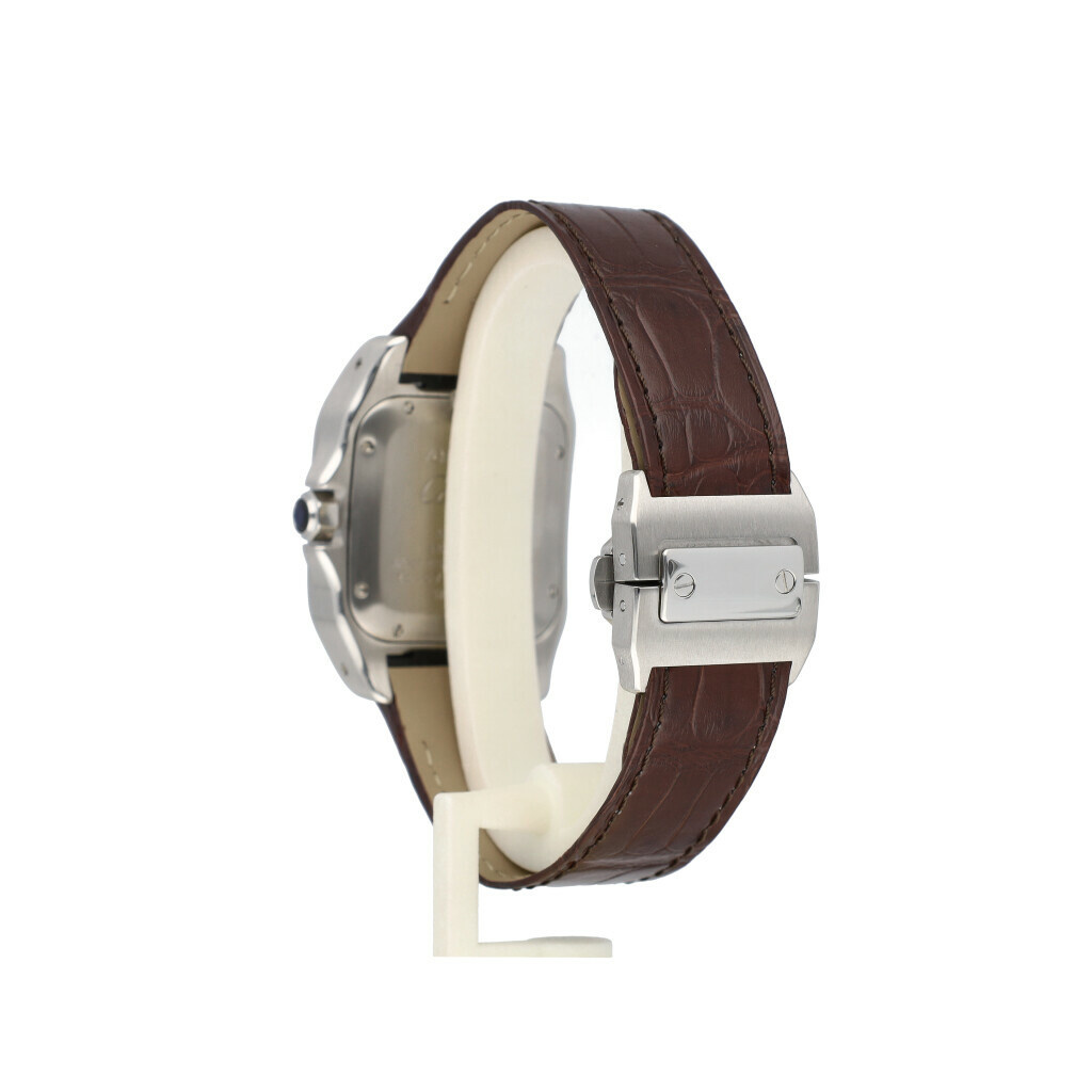 In very good condition Cartier Santos 100 in steel with silver dial no box and/or papers. New Cartier strap, not worn since.