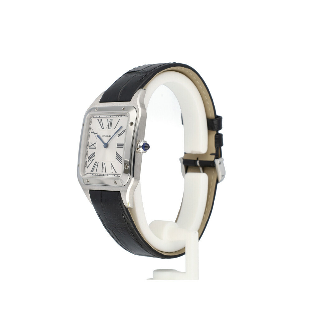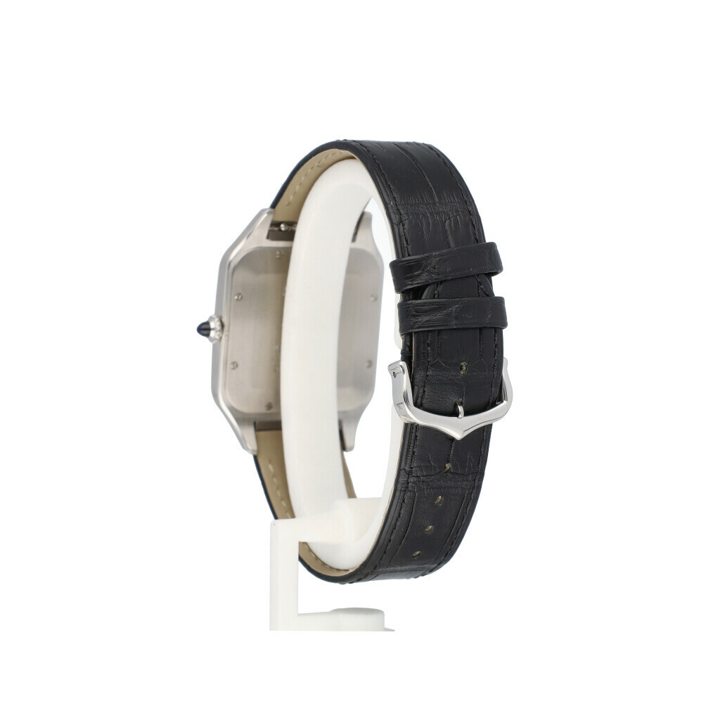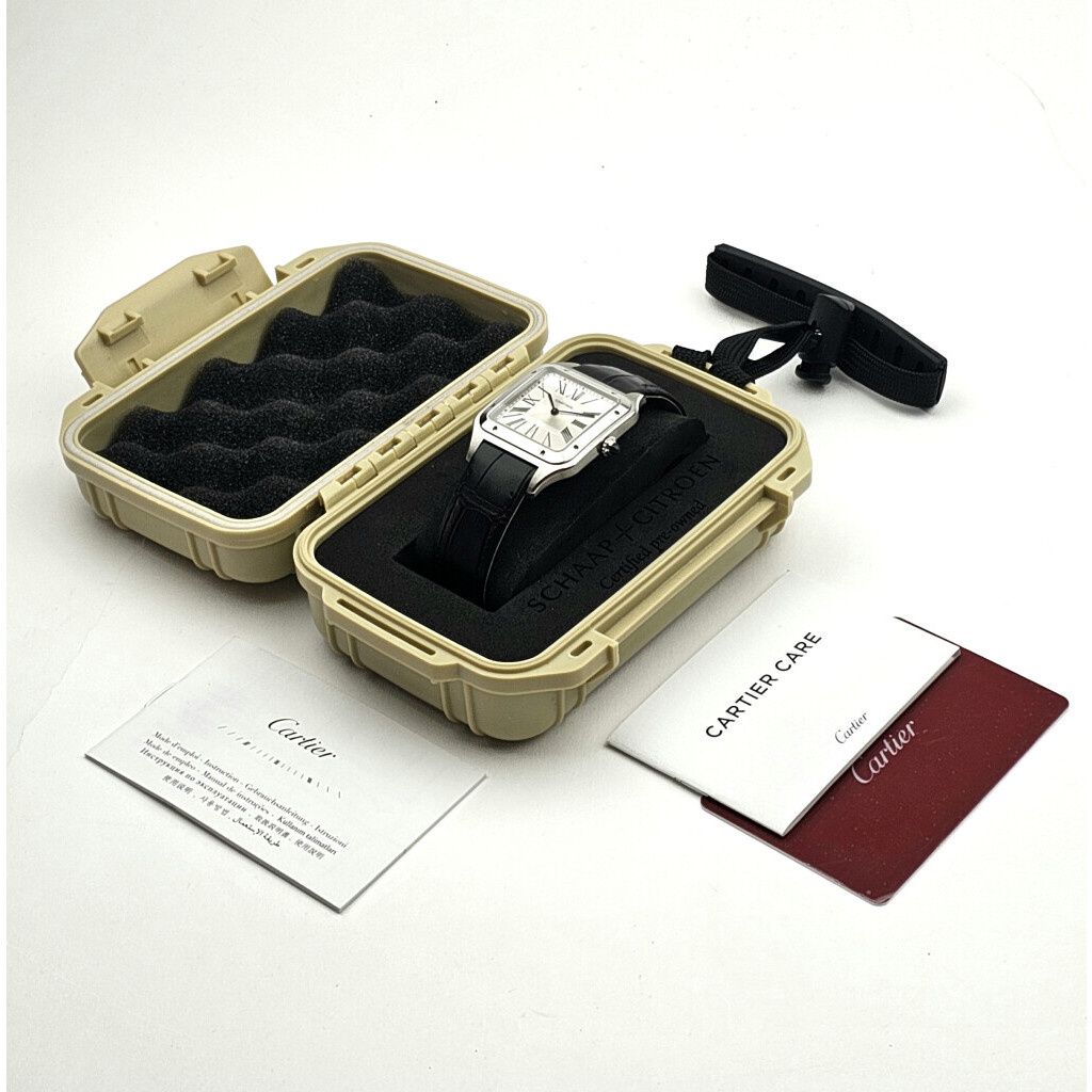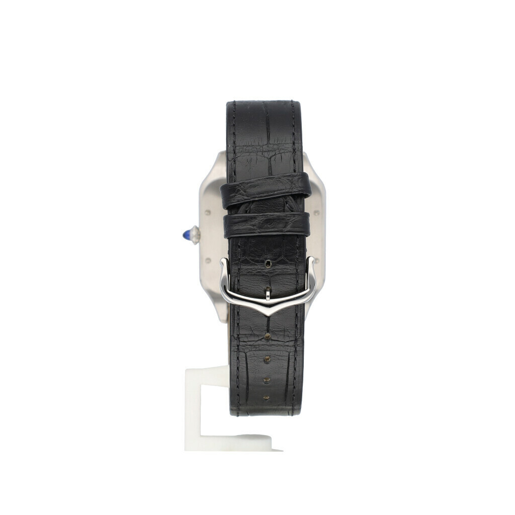 In very good condition Cartier Santos Dumont in steel with silver dial and brand new black Cartier strap from 2021 complete with papers, no box.