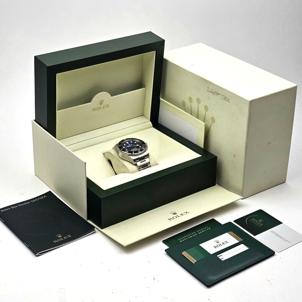 In very good condition Rolex Sea-Dweller Deepsea in steel with blue, so called 'James Cameron' dial and steel Oyster bracelet from 2018 complete with box and papers. Rolex serviced 8-2025 and not worn since. Rolex service certificate inculded.