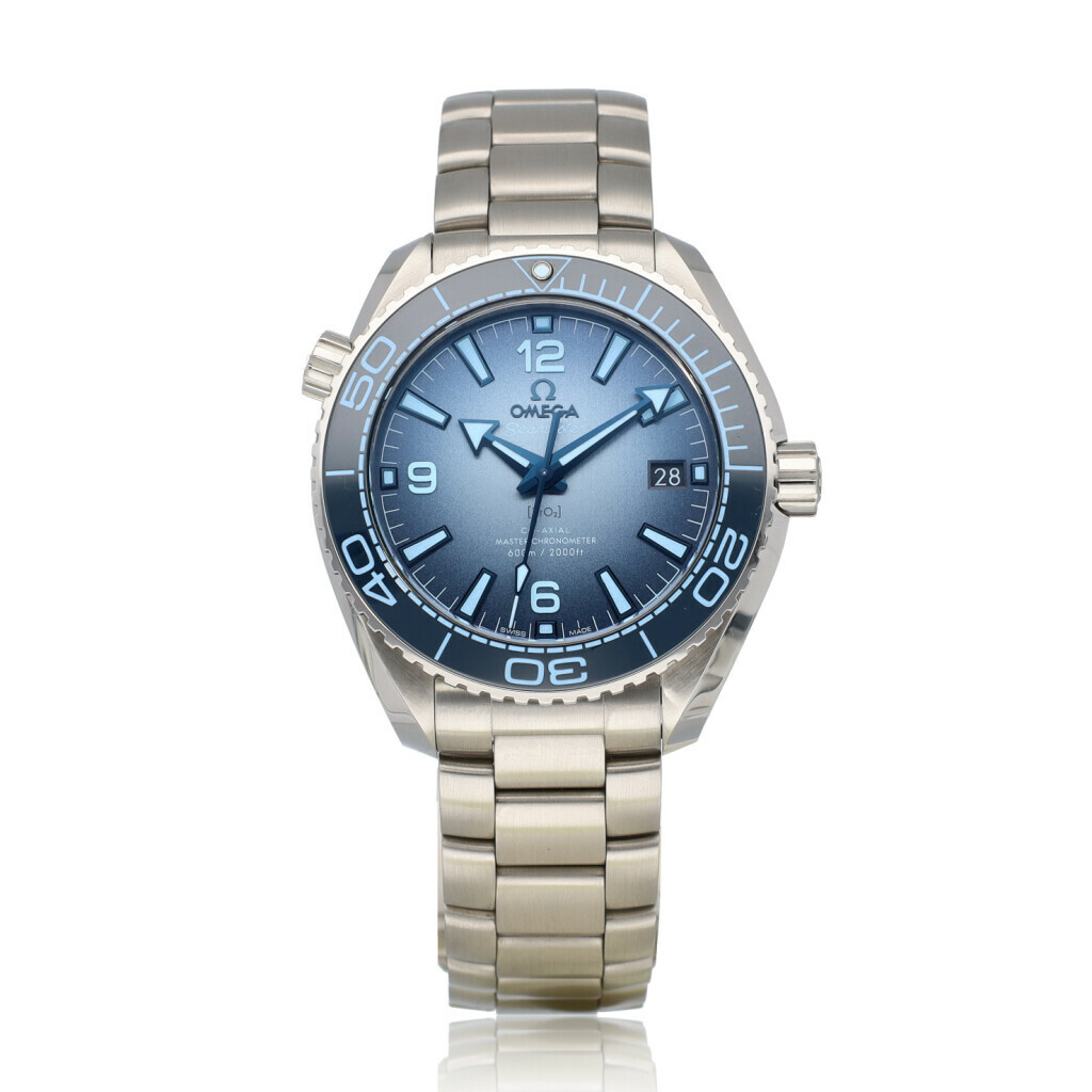 In very good condition Omega Seamaster Planet Ocean 600m Co-axial Summer Blue in steel with "summer blue" dial from 2024 complete with box and papers.