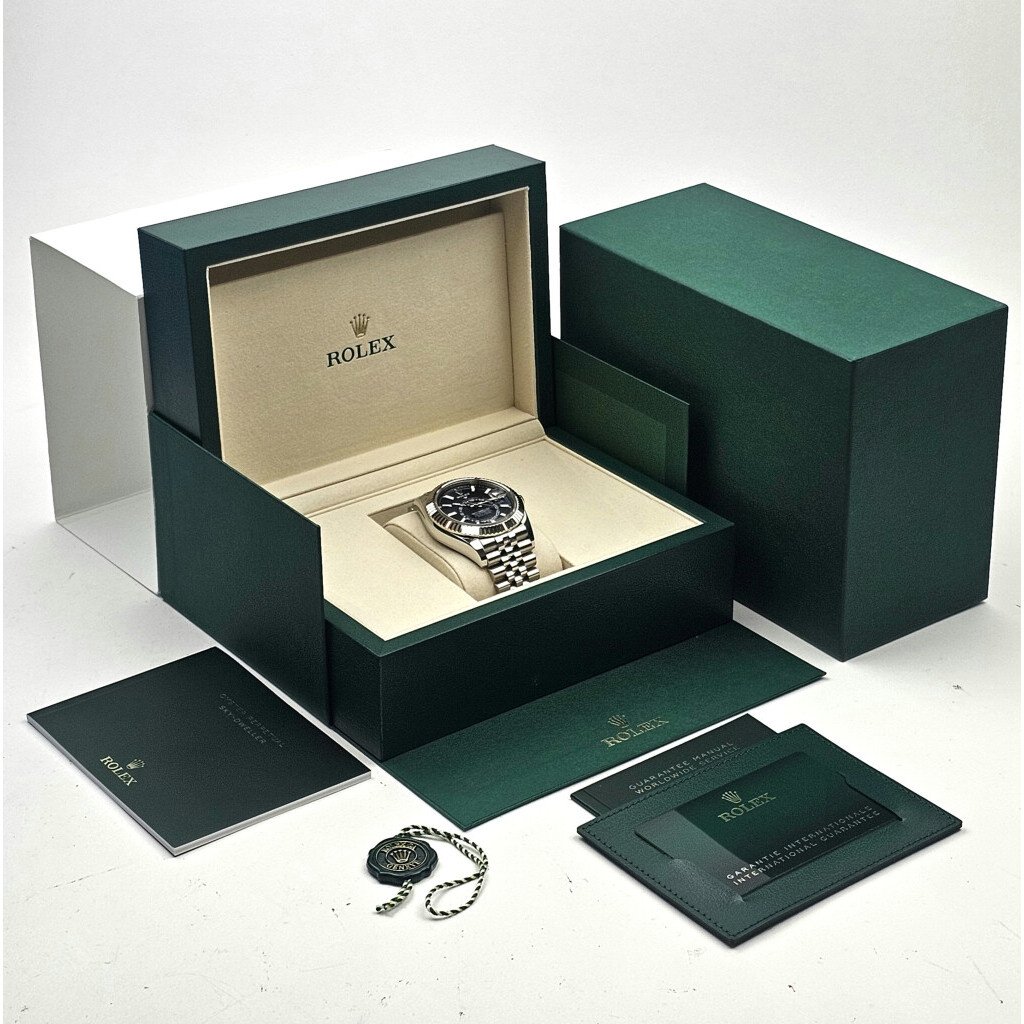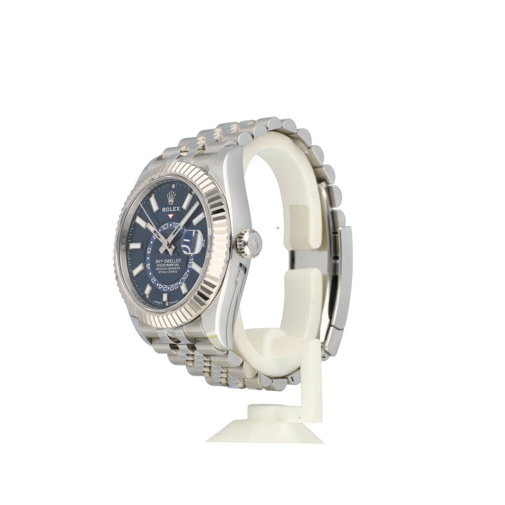 In very good condition Rolex Sky-Dweller in steel and white gold with blue dial, white gold bezel and steel Jubilee bracelet from 2024 complete with box and papers.