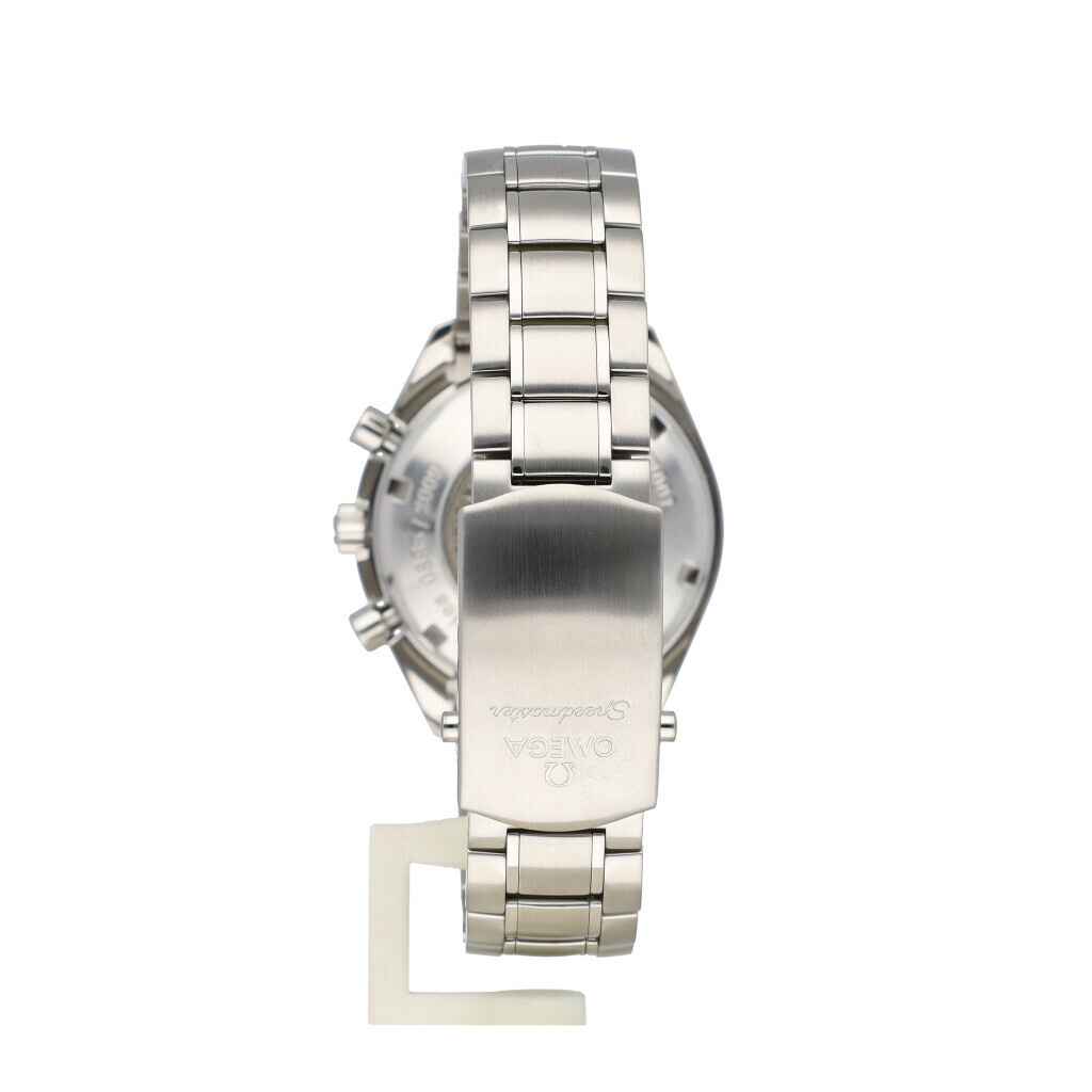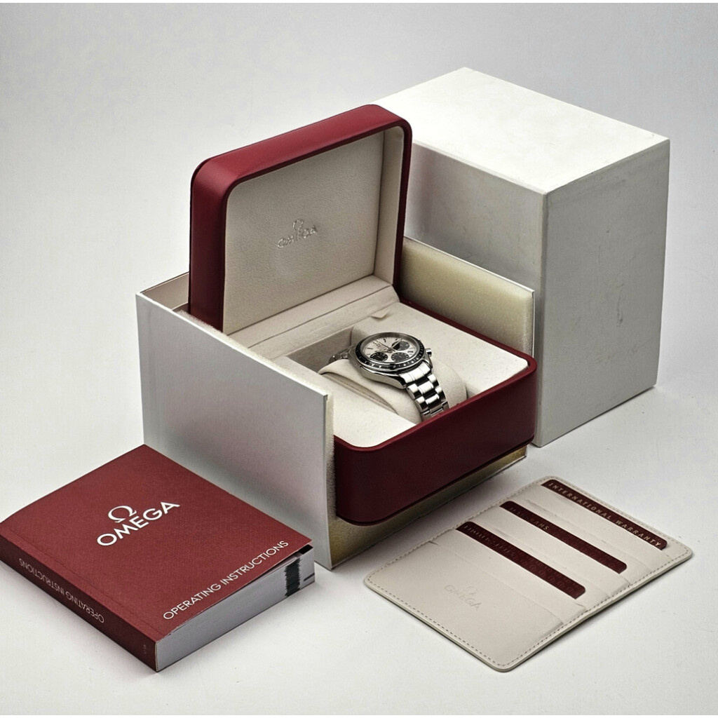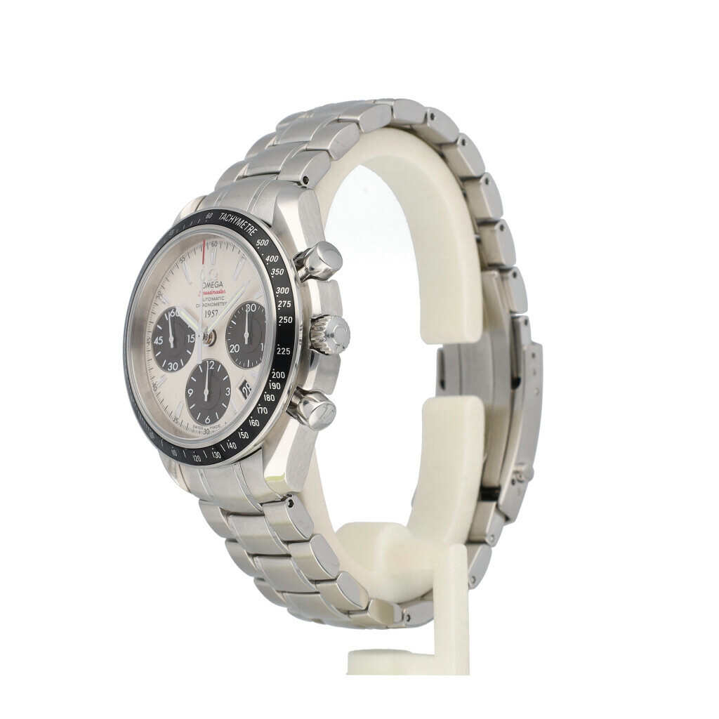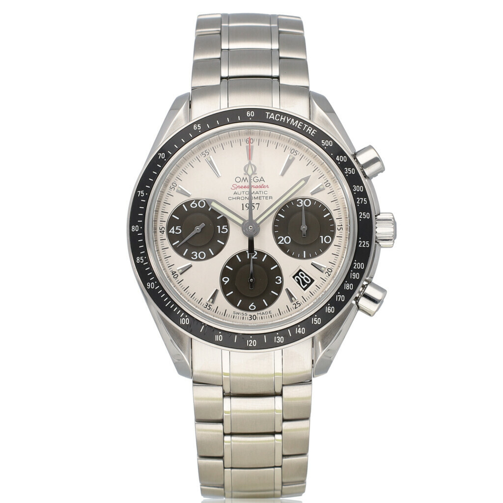 In very good condition Omega Speedmaster Chronograph Date in steel with a white so called "Panda" dial and steel bracelet complete with box and papers. No date filled in on certificate.