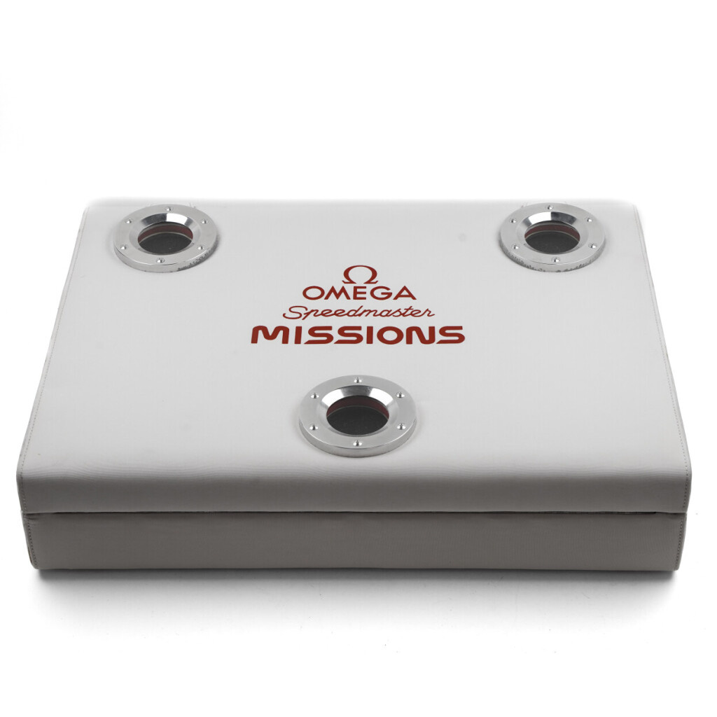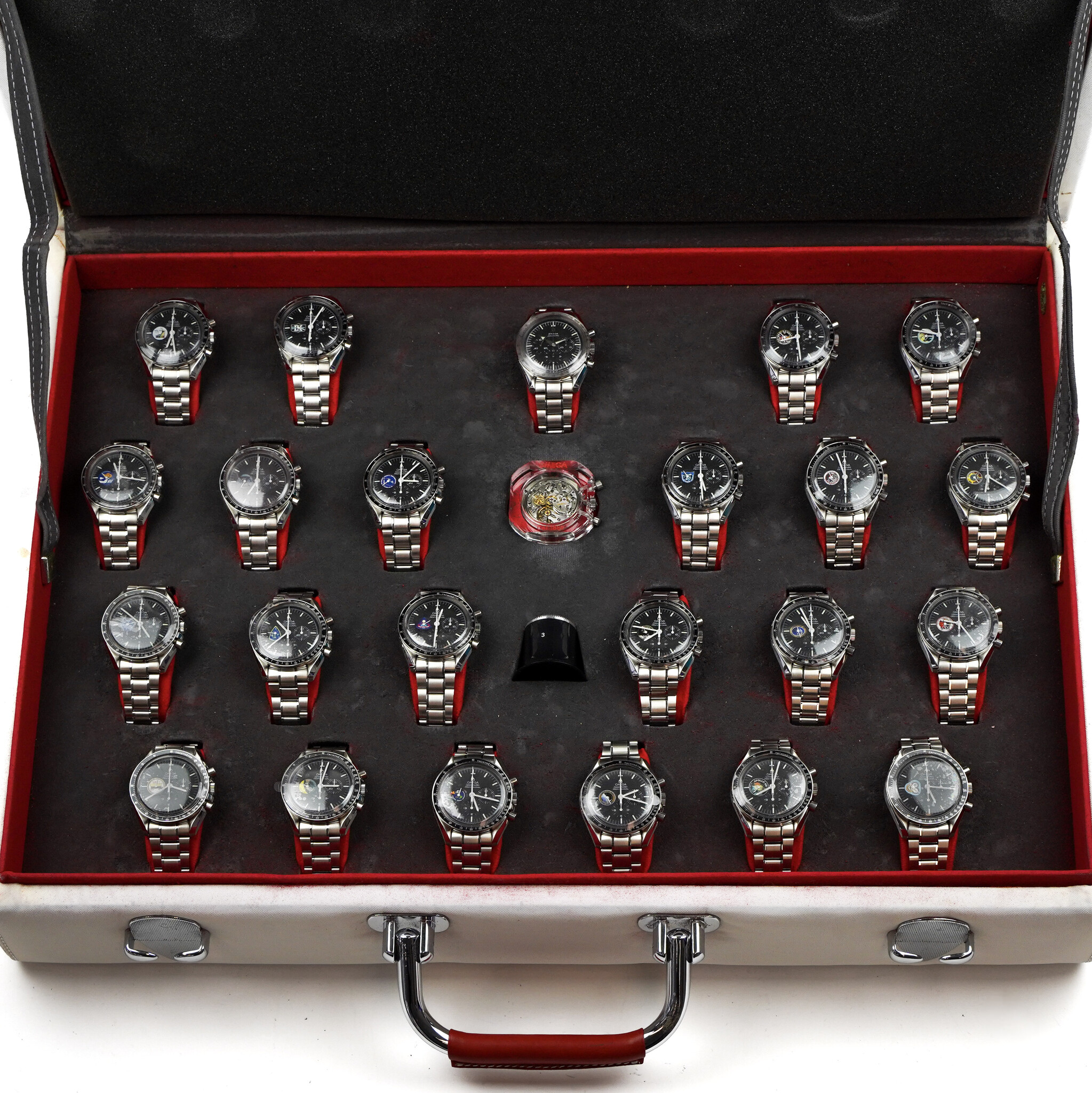 New, unworn Omega Speedmaster Missions Collection. 23 different Omega Speedmaster missions plus plastic encased Omega caliber 1861 movement and a loupe. Omega own dealer / exhibition box, not the 1/40 but 4/5 numbered. Omega valise made of the same fabric used for space suits.