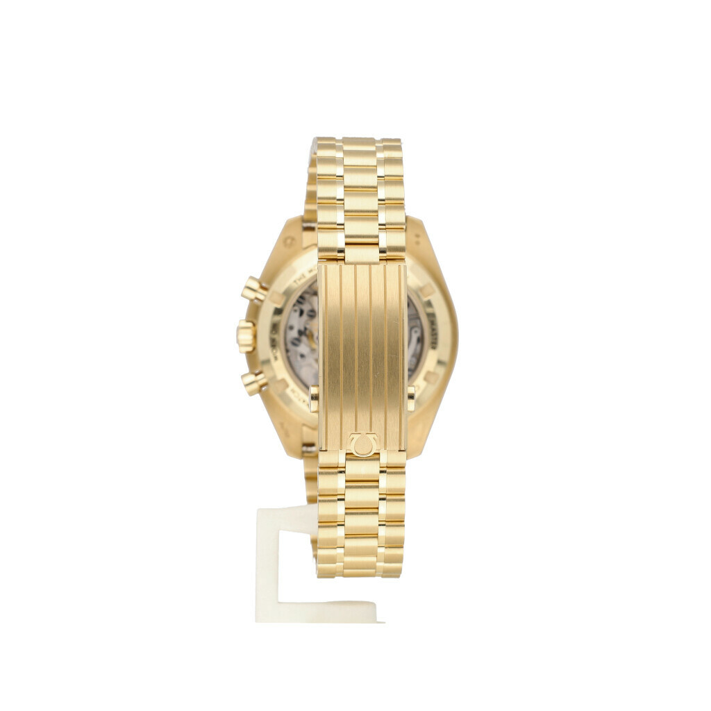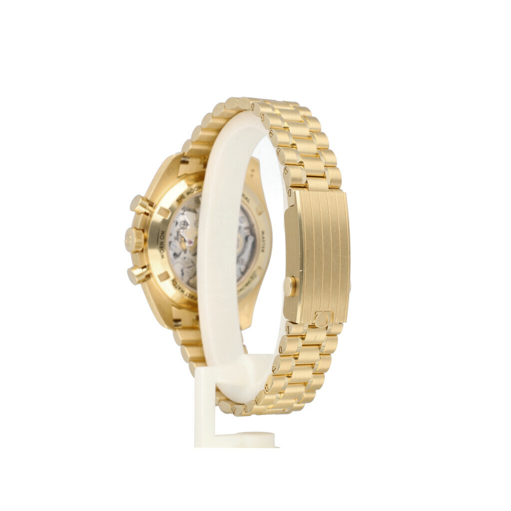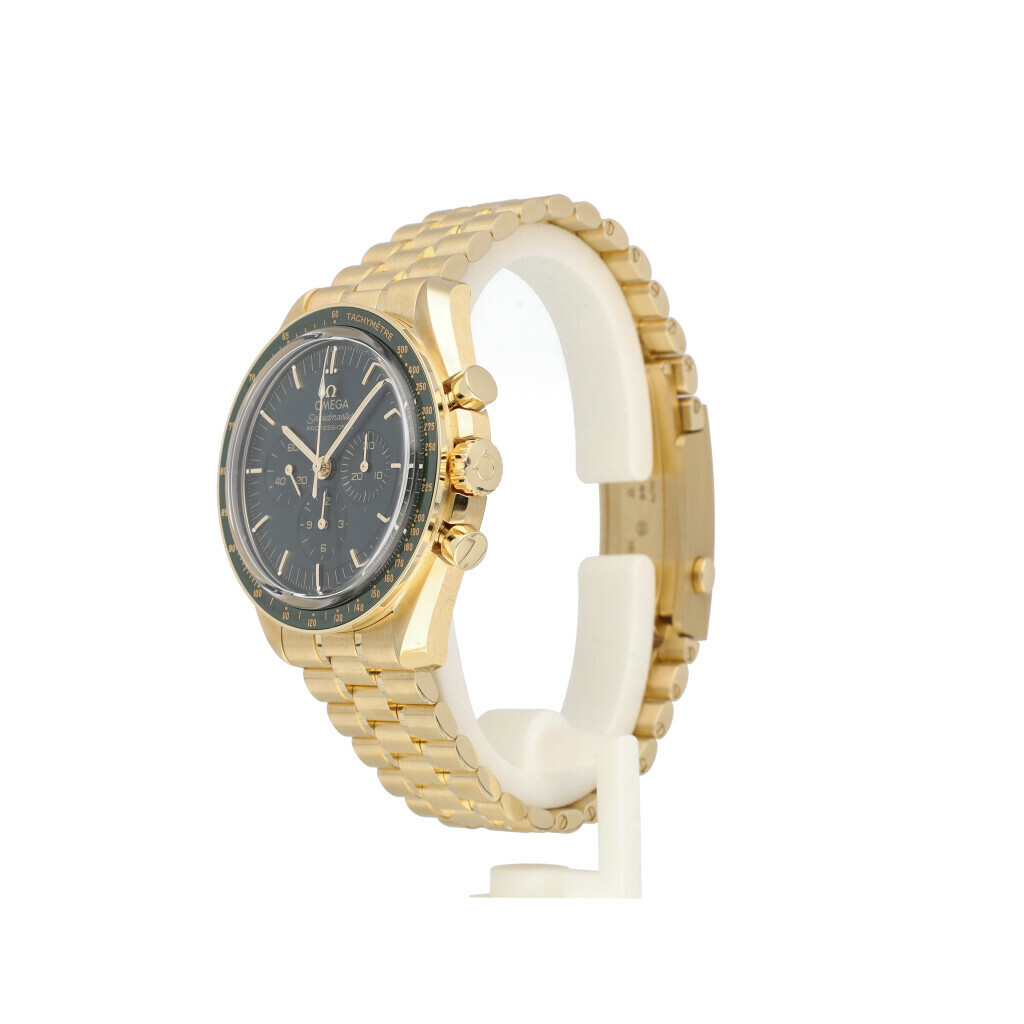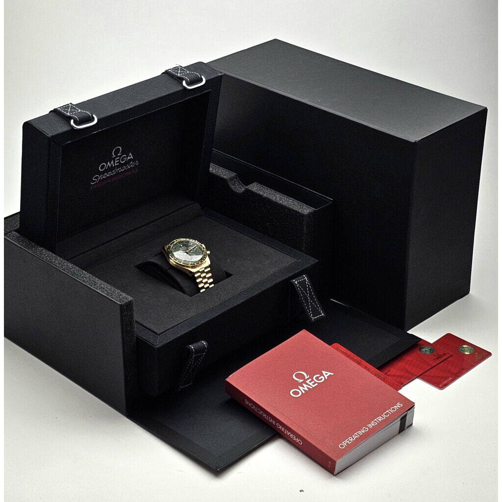 In very good condition Omega Speedmaster Moonwatch in yellow gold with green dial, green bezel and yellow gold Omega bracelet from 2025 complete with box and papers. 21% VAT deductible when shipped outside of the European Union.