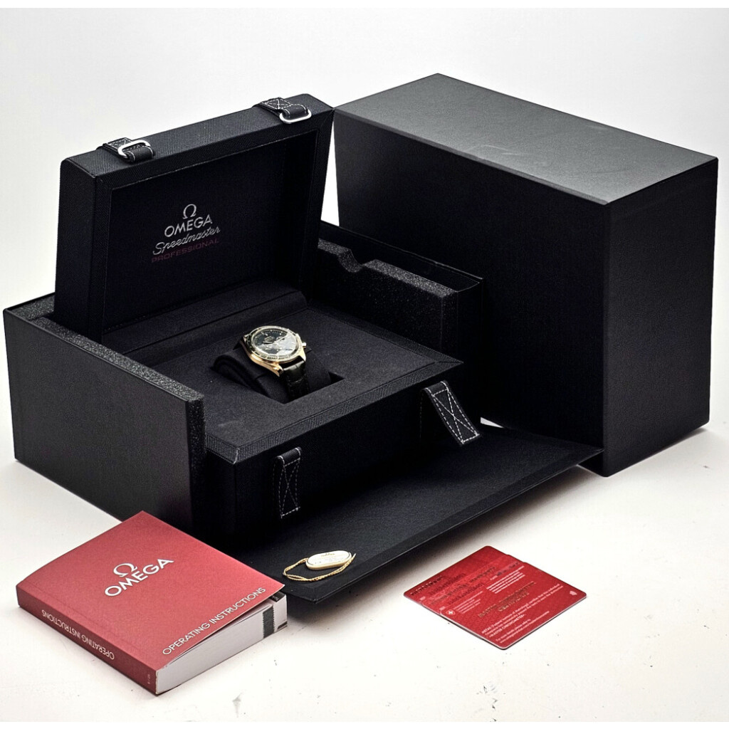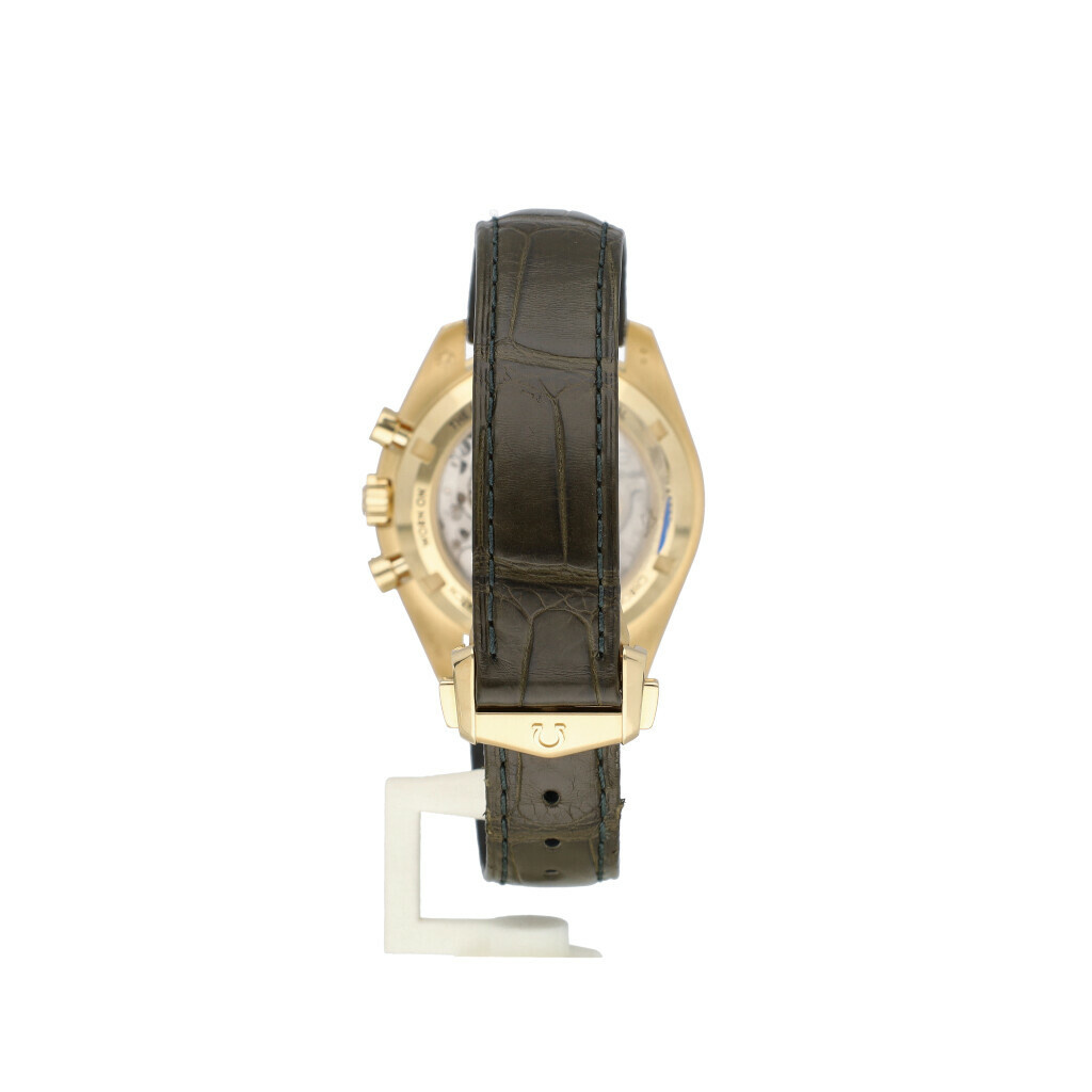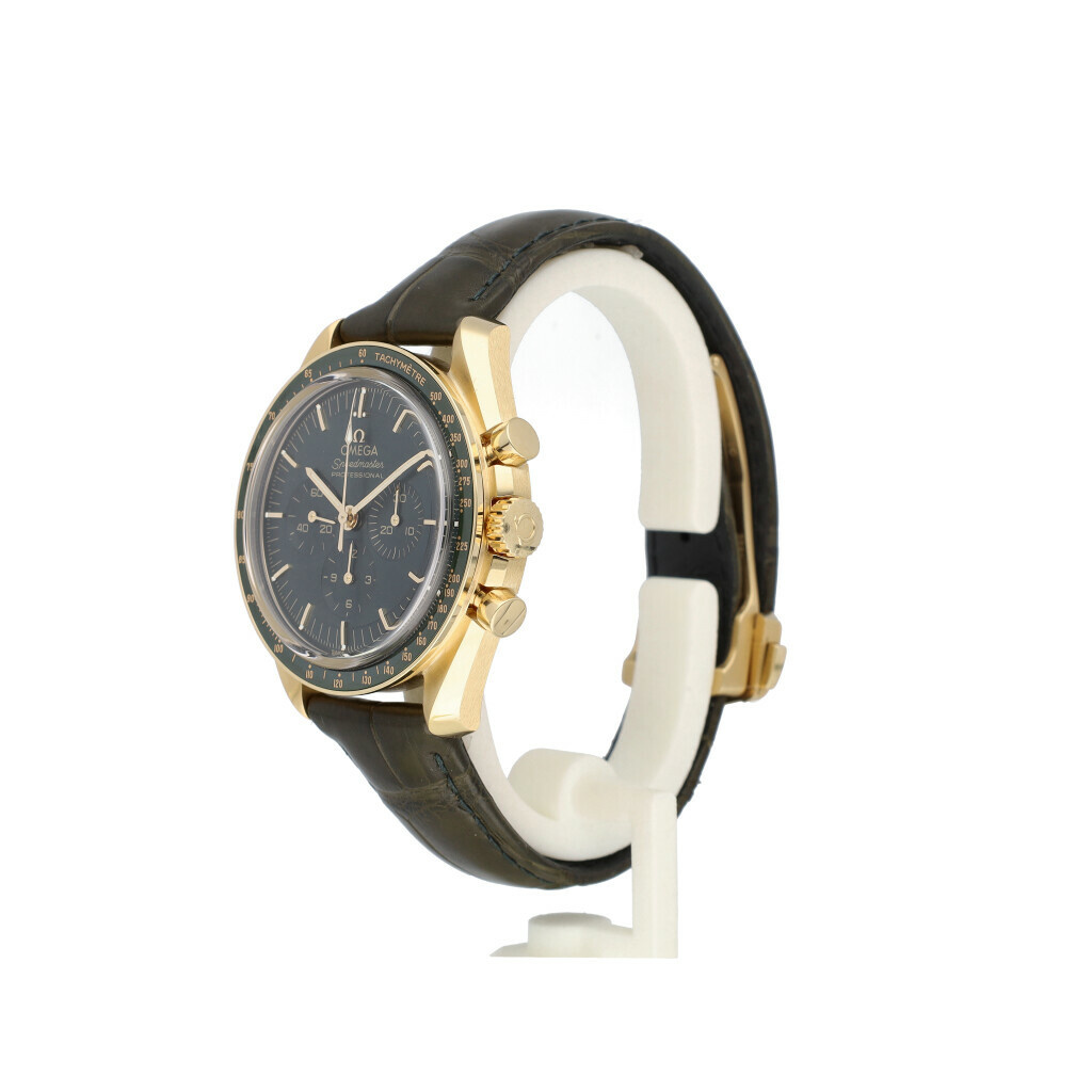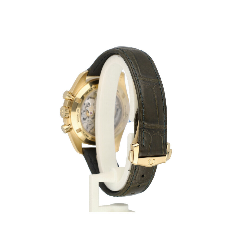 In very good condition Omega Speedmaster Moonwatch in yellow gold with green dial, yellow gold and green bezel and green leather Omega strap from 2025 complete with box and papers.